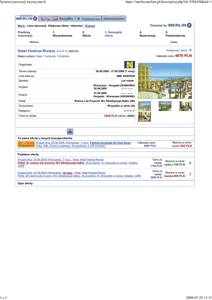 System rezerwacji turystycznych 1z2 https://merlin.merlinx.pl/description.php?id=3588430&tid=1 Powered by Merlin Lista rezerwacji Obejrzane oferty Infocenter Wyloguj Przebieg rezerwacji: 1. Wyszukiwanie 2. Oferty 3. Szczegóły oferty 4. Rezerwacja Wstecz Hotel Festival Riviera 5. Potwierdzenie Dalej Dostępność oferty: (38272A) Całkowita cena: Miejsce pobytu: Egipt / Hurghada / Hurghada 4076 PLN Organizator: Termin imprezy: Linie lotnicze: 20.08.2009 - 27.08.2009 (7 nocy) AMC AVIATION Samolot: Lot numer Wyjazd: Warszawa - Hurgada (WAWHRG) 20.08.2009 --.-- - --.-- Powrót: 27.08.2009 --.-- - --.-Hurgada - Warszawa (HRGWAW) Pokój: Wanna Lub Prysznic Wc Klimatyzacja Balko (2N) Wyżywienie: Wszystko w cenie (AI) Kategoria: Cena za osobę: 2038 PLN (oferta: JOKE) Ta sama oferta u innych touroperatorów Wyjazd dnia: 20.08.2009 (Warszawa), 7 nocy, Festival Hurghada K4 Club Room Pokój: DBL (Pokoj 2 osobowy), Wyżywienie: A (All Inclusive) Całkowita cena: 4690 PLN Różnica w cenie: doplata 892 PLN Podobne oferty Wyjazd dnia: 20.08.2009 (Warszawa), 7 nocy , Hotel: Hotel Festival Riviera Pokój: 2L (wanna lub prysznic WC klimatyzacja balko), Wyżywienie: AI (Wszystko w cenie), Katalog: JOKE Cena za Roznica w cenie: osobę: mniej o 100 PLN 1799 PLN Wyjazd dnia: 20.08.2009 (Warszawa), 14 nocy , Hotel: Hotel Festival Riviera Pokój: 2N (wanna lub prysznic WC klimatyzacja balko), Wyżywienie: AI (Wszystko w cenie), Katalog: JOKE Cena za Roznica w cenie: osobę: doplata 800 PLN 2699 PLN Opis oferty 2009-07-29 13:35 System rezerwacji turystycznych 2z2 https://merlin.merlinx.pl/description.php?id=3588430&tid=1 Położenie nowy hotel bezpośrednio przy plaży. Do centrum ok. 15 km. Wyposażenie hotel oferuje 429 pokoi na 3 piętrach. Restauracja, restauracja a la carte, hol powitalny z recepcją, bary, kącik internetowy (za opłatą), kiosk. W obszernym ogrodzie trzy baseny, bar przy basenie, parasole, leżaki i ręczniki kąpielowe przy basenie i na plaży bez opłaty. Dzieci mini klub 3-14 lat, oddzielny brodzik, plac zabaw, łóżeczko dla dziecka do 2 lat bez opłaty. Kategoria egipska 4 gwiazdki. Pokoje dwuosobowe (38272 a 1-2a) prysznic lub wanna, WC, klimatyzacja, TV-Sat, suszarka, sejf, balkon lub taras z bocznym widokiem na morze. Pokoje ruletka (38272a 1-3s) wyposażone jak pokoje dwuosobowe, bez bocznego widoku na morze. Pokoje z widokiem na morze (38272a 1-3b) wyposażone jak pokoje dwuosobowe, widok na morze. Zniżki przy 2 os. pełnopłatnych 1 dziecko 2-12 lat otrzymuje stałą cenę. Pokoje rodzinne (38272a 2-4d) wyposażone jak pokoje dwuosobowe, dodatkowa sypialnia, widok na morze. Dla min. 2 osób dorosłych i 2 dzieci lub 3 osób dorosłych i 1 dziecka. Zniżki przy 2 os. pełnopłatnych 2 dzieci 2-12 lat otrzymuje stałą cenę, przy 3 os. pełnopłatnych 1 dziecko 2-12 lat otrzymuje stałą cenę. Pokoje rodzinne (38272a 2-4c) dwa pokoje dwuosobowe połączone drzwiami, brak widoku na morze. Dla min. 2 osób dorosłych i 2 dzieci lub 3 osób dorosłych i 1 dziecka. Zniżki przy 2 os. pełnopłatnych 2-3 dzieci 2-12 lat otrzymuje stałą cenę, przy 3 os. pełnopłatnych 1-2 dzieci 2-12 lat otrzymuje stałą cenę, przy 4 os. pełnopłatnych 1 dziecko 2-12 lat otrzymuje stałą cenę. Rozrywka urozmaicony program animacyjny. Sport tenis stołowy, siłownia, siatkówka plażowa, boccia. Za opłatą: nurkowanie, windsurfing, masaże, sauna, bilard, łaźnia parowa, whirlpool. All inclusive trzy posiłki w formie bufetu, przekąski w godz. 12.00-17.00. Napoje bezalkoholowe w godz. 10.00-24.00 i lokalne napoje alkoholowe w godz. 11.00-24.00. jeden raz w tygodniu kolacja w restauracji azjatyckiej (za wcześniejszą rezerwacją). 14=11, 7=6 w terminach 14.05-06.07, 27.08-14.09.2009. Zniżka przy wcześniejszej rezerwacji do 30.04.2009. Alternatywne lotniska / dosiadki Wyjazd: Katowice, 20.08.2009 godz. 00:00 Na miejscu: Hurgada, 20.08.2009 godz. 00:00 Cena za osobę: 1999 PLN Wyjazd: Krakow, 20.08.2009 godz. 00:00 Na miejscu: Hurgada, 20.08.2009 godz. 00:00 Cena za osobę: 1999 PLN Wstecz Wynajęcie samochodu Egipt - hurghada (aden beach resort) Dalej samochód zapewnia Holiday Autos 20.08.2009 - 27.08.2009 Bez samochodu Hyundai Matrix 5dr a/c (5 os.), Kompakt Van 1.448,00 PLN Hyundai Verna 2dr a/c (4 os.), Untere Mittelklasse 1.522,00 PLN Mitsubishi Lancer 4dr a/c (4 os.), Untere Mittelklasse 1.736,00 PLN 2009-07-29 13:35