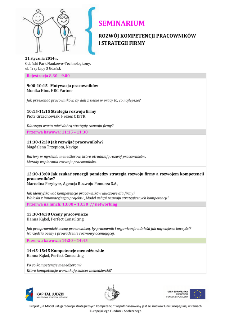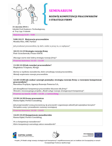SEMINARIUM ROZWÓJ KOMPETENCJI PRACOWNIKÓW I STRATEGII FIRMY 21 stycznia 2014 r. Gdański Park Naukowo–Technologiczny, ul. Trzy Lipy 3 Gdańsk Rejestracja 8.30 – 9.00 9:00-10:15 Motywacja pracowników Monika Hinc, HRC Partner Jak przekonać pracowników, by dali z siebie w pracy to, co najlepsze? 10:15-11:15 Strategia rozwoju firmy Piotr Grzechowiak, Prezes ODiTK Dlaczego warto mieć dobrą strategię rozwoju firmy? Przerwa kawowa: 11:15 – 11:30 11:30-12:30 Jak rozwijać pracowników? Magdalena Trzepiota, Navigo Bariery w myśleniu menedżerów, które utrudniają rozwój pracowników, Metody wspierania rozwoju pracowników. 12:30-13:00 Jak szukać synergii pomiędzy strategią rozwoju firmy a rozwojem kompetencji pracowników? Marcelina Przybysz, Agencja Rozwoju Pomorza S.A., Jak identyfikować kompetencje pracowników kluczowe dla firmy? Wnioski z innowacyjnego projektu „Model usługi rozwoju strategicznych kompetencji”. Przerwa na lunch: 13:00 – 13:30 // networking 13:30-14:30 Oceny pracownicze Hanna Kąkol, Perfect Consulting Jak przeprowadzić ocenę pracowniczą, by pracownik i organizacja odnieśli jak największe korzyści? Narzędzia oceny i prowadzenie rozmowy oceniającej. Przerwa kawowa: 14:30 – 14:45 14:45-15:45 Kompetencje menedżerskie Hanna Kąkol, Perfect Consulting Po co kompetencje menedżerom? Które kompetencje warunkują sukces menedżerski? Projekt „PI Model usługi rozwoju strategicznych kompetencji” współfinansowany jest ze środków Unii Europejskiej w ramach Europejskiego Funduszu Społecznego Grzechowiak Piotr, Prezes ODiTK Prezes Zarządu Ośrodka Doradztwa i Treningu Kierowniczego w Gdańsku oraz radca prawny wielu instytucji i przedsiębiorstw. Partner zarządzający w Kancelarii Radców Prawnych i Adwokatów Aval- Consult Sp.p w Gdańsku. Organizował i prowadził wiele projektów doradczych realizowanych przez ODiTK - między innymi projekty prywatyzacji i restrukturyzacji przedsiębiorstw, prowadzenie procedury likwidacyjnej i upadłościowej przedsiębiorstw (jako likwidator i syndyk), wprowadzenie na rynek inwestorów zachodnich i tworzenie na ich rzecz nowych przedsięwzięć gospodarczych w Polsce. W latach 2000 - 2001 pracował jako konsultant firmy Ernst & Young. W ostatnich 3 latach realizował projekty szkoleniowo - doradcze m.in. dla: Korporacji Budowlanej Doraco, TU Allianz, Ceramiki Budowlanej Wienerberger, Alimy Gerber, PZU Development, Altadis Polska. Hinc Monika, HRC Partner Socjolog, trener, specjalista w zakresie zarządzania, doskonalenia kompetencji społecznych i interpersonalnych, aktywizacji społecznej, rozwoju i realizacji projektów biznesowych. Od 2006 r., wiedzę i umiejętności zdobywa w pracy zawodowej dla dużych firm (Agencja Rozwoju Pomorza S.A., Zarząd Morskiego Portu Gdańsk S.A., Akademia Kształcenia Zawodowego) oraz mikro, małych i średnich przedsiębiorstw (Promea, Grupa Kombinat, Mentor). Od 2009 roku organizuje i prowadzi szkolenia dla biznesu, samorządu i organizacji pozarządowych. Obecnie jest menedżerem zespołu odpowiadającego za rozwój zasobów ludzkich w NGO, członkiem zarządu Akademii Kształcenia w tejże organizacji, a także trenerem i coachem wspierającym organizacje III sektora. Jako trener, współpracuje m.in. z Kaszubskim Instytutem Rozwoju, Akademią Kształcenia Zawodowego, Gdańską Fundacją Innowacji Społecznej, Zrzeszeniem Kaszubsko-Pomorskim. Kąkol Hanna, Perfect Consulting Dyrektor Zarządzający firmy Perfect Consulting. Od ponad 20 lat związana ze sprzedażą oraz marketingiem. Doświadczenie zawodowe zdobyła pracując na różnych szczeblach zarządzania: product manager, dyrektor oddziału, dyrektor firmy. Posiada doświadczenie w prowadzeniu projektów, których celem jest wspieranie firm różnych branż w określaniu strategii operacyjnej i wdrażaniu programów poprawy wyników. Specjalizuje się w tematyce zmiany i podnoszeniu efektywności organizacji oraz budowaniu optymalnych struktur organizacyjnych. Posiada uprawnienia do realizacji badań: Thomas International oraz Extended Disc. Obszary specjalizacji: zarządzanie strategiczne, przywództwo i budowanie zespołu, zarządzanie czasem i motywacja pracowników, ocena pracowników, systemy premiowe, akademia managera, komunikacja interpersonalna. Projekt „PI Model usługi rozwoju strategicznych kompetencji” współfinansowany jest ze środków Unii Europejskiej w ramach Europejskiego Funduszu Społecznego Przybysz Marcelina, Agencja Rozwoju Pomorza S.A. Koordynator projektów w Agencji Rozwoju Pomorza S.A. Absolwentka Szkoły Głównej Handlowej i Christian Albrechts Universität zu Kiel na kierunkach Zarządzanie i Marketing oraz Finanse i Bankowość. Posiada 5 letnie doświadczenie w realizacji projektów z zakresu rozwoju standardów zarządzania w małych i średnich firmach, w tym w szczególności w obszarach: zarządzania strategicznego i społecznej odpowiedzialności biznesu. Doradca CSR przy Polskiej Agencji Rozwoju Przedsiębiorczości realizujący projekty strategiczne dla małych i średnich firm, w tym m.in. dla: Grupy Terma, Kancelarii Ekspert, Tritum. Obecnie koordynuje innowacyjny projekt doradczy z zakresu zarządzania kompetencjami i zarządzania strategicznego „Model usługi rozwoju strategicznych kompetencji”. Współpracowała również z: Akademią Morską, Polskim Stowarzyszeniem Fundrasingu oraz projektem Young Experts Group. Trzepiota Magdalena, Navigo Twórca i Konsultant w NAVIGO Grup. Absolwentka wydziału psychologii Uniwersytetu Gdańskiego, specjalizacji organizacja i zarządzanie. W zakresie doradztwa wdraża projekty: systemy okresowych ocen pracowniczych, Assessment i Development Center, opisy stanowisk pracy i profile pracowników, opracowanie katalogów kompetencji i zadań firmowych, programy rozwojowe dla sukcesorów oraz pracowników, tworzy narzędzia pomiaru kompetencji (skale kompetencyjne, testy, pytania rekrutacyjne). Prowadzi szkolenia z zakr