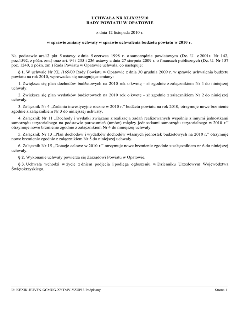 UCHWAŁA NR XLIX/225/10 RADY POWIATU W OPATOWIE z dnia 12 listopada 2010 r. w sprawie zmiany uchwały w sprawie uchwalenia budżetu powiatu w 2010 r. Na podstawie art.12 pkt 5 ustawy z dnia 5 czerwca 1998 r. o samorządzie powiatowym (Dz. U. z 2001r. Nr 142, poz.1592, z późn. zm.) oraz art. 94 i 235 i 236 ustawy z dnia 27 sierpnia 2009 r. o finansach publicznych (Dz. U. Nr 157 poz. 1240, z późn. zm.) Rada Powiatu w Opatowie uchwala, co następuje: § 1. W uchwale Nr XL /165/09 Rady Powiatu w Opatowie z dnia 30 grudnia 2009 r. w sprawie uchwalenia budżetu powiatu na rok 2010, wprowadza się następujące zmiany: 1. Zwiększa się plan dochodów budżetowych na 2010 rok o kwotę - zł zgodnie z załącznikiem Nr 1 do niniejszej uchwały. 2. Zwiększa się plan wydatków budżetowych na 2010 rok o kwotę - zł zgodnie z załącznikiem Nr 2 do niniejszej uchwały. 3. Załącznik Nr 4 „Zadania inwestycyjne roczne w 2010 r.” budżetu powiatu na rok 2010, otrzymuje nowe brzmienie zgodnie z załącznikiem Nr 3 do niniejszej uchwały. 4. Załącznik Nr 11 „Dochody i wydatki związane z realizacją zadań realizowanych wspólnie z innymi jednostkami samorządu terytorialnego na podstawie porozumień (umów) między jednostkami samorządu terytorialnego w 2010 r.” otrzymuje nowe brzmienie zgodnie z załącznikiem Nr 4 do niniejszej uchwały. 5. Załącznik Nr 13 „Plan dochodów i wydatków dochodów własnych jednostek budżetowych na 2010 r.” otrzymuje nowe brzmienie zgodnie z załącznikiem Nr 5 do niniejszej uchwały. 6. Załącznik Nr 15 „Dotacje celowe w 2010 r.” otrzymuje nowe brzmienie zgodnie z załącznikiem nr 6 do niniejszej uchwały. § 2. Wykonanie uchwały powierza się Zarządowi Powiatu w Opatowie. § 3. Uchwała wchodzi w życie z dniem podjęcia i podlega ogłoszeniu w Dzienniku Urzędowym Województwa Świętokrzyskiego. Id: KEXIK-HUVFN-GCMUG-XYTMV-YZUPU. Podpisany Strona 1 Uzasadnienie Niniejszą uchwałą dokonuje się zmian w budżecie powiatu na 2010 rok poprzez zmniejszenie dochodów i wydatków budżetu o kwotę - 108.563 zł. zmniejszenie to jest wynikiem zwiększeń i zmniejszeń w następujących działach: Zwiększenia występują: Dział 020 Gospodarka leśna, są to wpływy z Agencji Restrukturyzacji i Modernizacji Rolnictwa w kwocie 984 zł, na wypłatę ekwiwalentu pieniężnego należnego właścicielom gruntów rolnych za wyłączenie tych gruntów z upraw rolnych i prowadzenie uprawy leśnej. Dział 700 Gospodarka mieszkaniowa jest to refundacja poniesionych wydatków z tytułu projektu termomodernizacja w kwocie 400.000 zł. Dział 801 Oświata i wychowanie, dochody z Cementowni Grupa Ożarów w kwocie 2.400 zł za praktyki uczniowskie dla uczniów Zespołu Szkół w Ożarowie oraz 7.000 zł nagroda Ministra Edukacji Narodowej dla nauczyciela, w Specjalnym Ośrodku. Szkolno-Wychowawczym w Niemienicach plus wpływy z różnych dochodów kwocie 1.243 zł. Zmniejszenia występują: Dział 600 Drogi publiczne powiatowe, z powodu zmniejszenia wpływu w kwocie 43.680 zł z tytułu pomocy finansowej udzielanej między jednostkami samorządu terytorialnego na dofinansowanie własnych zadań bieżących. Dział 756 Udziały powiatów w podatkach stanowiących dochód budżetu państwa, z powodu zmniejszenia wpływu w kwocie 76.510 zł – podatek od osób fizycznych, oraz w kwocie 400.000 zł podatek od osób prawnych. Id: KEXIK-HUVFN-GCMUG-XYTMV-YZUPU. Podpisany Strona 1 Załącznik Nr 1 do Uchwały Nr XLIX/225/10 Rady Powiatu w Opatowie z dnia 12 listopada 2010 r. Zmiana w planie dochodów budżetowych w roku 2010 . Dział Rozdział Paragraf Treść 020 Kwota przed Kwota po Zmniejszenia Zwiększenia zmianą zmianach Leśnictwo 202 325,00 0,00 984,00 203 309,00 Gospodarka leśna 202 325,00 0,00 984,00 203 309,00 Środki otrzymane od pozostałych jednostek zaliczanych do sektora finansów publicznych narealizacje zadań bieżących jednostek zaliczanych do sektora finansów publicznych 202 325,00 0,00 984,00 203 309,00 Transport i łączność 5 163 527,00 -43 680,00 0,00 5 119 847,00 Drogi publiczne powiatowe 3 677 245,00 -43 680,00 0,00 3 633 565,00 Wpływy z tytułu pomocy finansowej udzielanej między jednostkami samorządu terytorialnego nadofinansowanie własnych zadań bieżących 481 465,00 -43 680,00 0,00 437 785,00 Gospodarka mieszkaniowa 1 451 493,00 0,00 400 000,00 1 851 493,00 Gospodarka gruntami i nieruchomościami 1 451 493,00 0,00 400 000,00 1 851 493,00 Środki pochodzące z Norweskiego Mechanizmu Finansowego, Mechanizmu FinansowegoEuropejskiego Obszaru 1 261 493,00 Gospodarczego oraz Szwajcarsko-Polskiego Programu Współpracy 0,00 400 000,00 1 661 493,00 Dochody od osób prawnych, od osób fizycznych i od innych jednostek nieposiadających osobowości prawnej oraz wydatki związane z ich poborem 3 955 321,00 -476 510,00 0,00 3 478 811,00 Udziały powiatów w podatkach stanowiących dochód budżetu państwa 3 955 321,00 -476 510,00 0,00 3 478 811,00 0010 Podatek dochodowy od osób fizycznych 3 455 321,00 -76 510,00 0,00 3 378 811,00 0020 Podatek dochodowy od osób prawnych 500 000,00 -400 000,00 0,00 100 000,00 Oświata i wychowanie 148 404,00 0,00 10 643,00 159 047,00 Szkoły zawodowe 18 347,00 0,00 2 400,00 20 747,00 Wpływy z usług 10 000,00 0,00 2 400,00 12 400,00 Pozostała działalność 53 057,00 0,00 8 243,00 61 300,00 Wpływy z różnych dochodów 0,00 0,00 8 243,00 8 243,00 Razem 58 928 039,00 -520 190,00 411 627,00 58 819 476,00 02001 2460 600 60014 2710 700 70005 8545 756 75622 801 80130 0830 80195 0970 Id: KEXIK-HUVFN-GCMUG-XYTMV-YZUPU. Podpisany Strona 1 Załącznik Nr 2 do Uchwały Nr XLIX/225/10 Rady Powiatu w Opatowie z dnia 12 listopada 2010 r. Zmiana w planie wydatków budżetowych w roku 2010 r. Dział Kwota przed zmianą Zmniejszenia Zwiększenia Rolnictwo i łowiectwo 285 044,00 -14 000,00 0,00 271 044,00 Pozostała działalność 30 000,00 -14 000,00 0,00 16 000,00 Nagrody o charakterze szczególnym niezalic