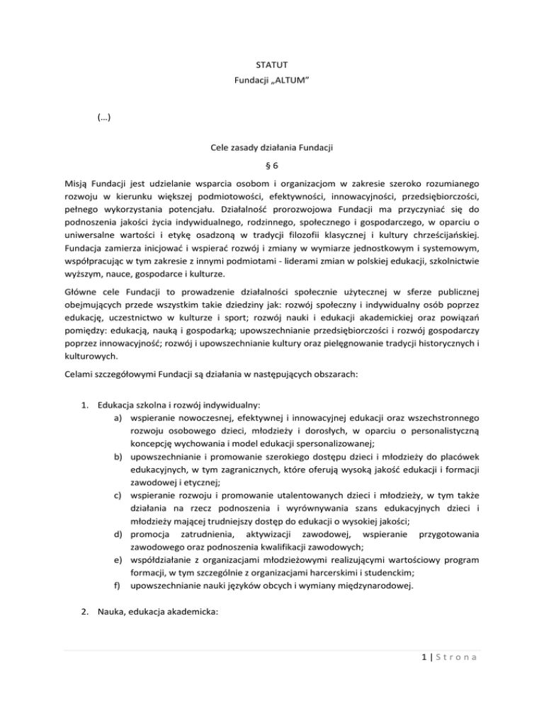 STATUT Fundacji „ALTUM” (…) Cele zasady działania Fundacji §6 Misją Fundacji jest udzielanie wsparcia osobom i organizacjom w zakresie szeroko rozumianego rozwoju w kierunku większej podmiotowości, efektywności, innowacyjności, przedsiębiorczości, pełnego wykorzystania potencjału. Działalność prorozwojowa Fundacji ma przyczyniać się do podnoszenia jakości życia indywidualnego, rodzinnego, społecznego i gospodarczego, w oparciu o uniwersalne wartości i etykę osadzoną w tradycji filozofii klasycznej i kultury chrześcijańskiej. Fundacja zamierza inicjować i wspierać rozwój i zmiany w wymiarze jednostkowym i systemowym, współpracując w tym zakresie z innymi podmiotami - liderami zmian w polskiej edukacji, szkolnictwie wyższym, nauce, gospodarce i kulturze. Główne cele Fundacji to prowadzenie działalności społecznie użytecznej w sferze publicznej obejmujących przede wszystkim takie dziedziny jak: rozwój społeczny i indywidualny osób poprzez edukację, uczestnictwo w kulturze i sport; rozwój nauki i edukacji akademickiej oraz powiązań pomiędzy: edukacją, nauką i gospodarką; upowszechnianie przedsiębiorczości i rozwój gospodarczy poprzez innowacyjność; rozwój i upowszechnianie kultury oraz pielęgnowanie tradycji historycznych i kulturowych. Celami szczegółowymi Fundacji są działania w następujących obszarach: 1. Edukacja szkolna i rozwój indywidualny: a) wspieranie nowoczesnej, efektywnej i innowacyjnej edukacji oraz wszechstronnego rozwoju osobowego dzieci, młodzieży i dorosłych, w oparciu o personalistyczną koncepcję wychowania i model edukacji spersonalizowanej; b) upowszechnianie i promowanie szerokiego dostępu dzieci i młodzieży do placówek edukacyjnych, w tym zagranicznych, które oferują wysoką jakość edukacji i formacji zawodowej i etycznej; c) wspieranie rozwoju i promowanie utalentowanych dzieci i młodzieży, w tym także działania na rzecz podnoszenia i wyrównywania szans edukacyjnych dzieci i młodzieży mającej trudniejszy dostęp do edukacji o wysokiej jakości; d) promocja zatrudnienia, aktywizacji zawodowej, wspieranie przygotowania zawodowego oraz podnoszenia kwalifikacji zawodowych; e) współdziałanie z organizacjami młodzieżowymi realizującymi wartościowy program formacji, w tym szczególnie z organizacjami harcerskimi i studenckim; f) upowszechnianie nauki języków obcych i wymiany międzynarodowej. 2. Nauka, edukacja akademicka: 1|Strona a) działania na rzecz podnoszenia jakości edukacji akademickiej, w tym także: upowszechnianie idei uniwersytetu jako wspólnoty nauczycieli i badaczy oraz studentów, miejsca formacji, doskonalenia i dociekań naukowych; b) działanie na rzecz transferu osiągnięć naukowych i akademickich do praktyki gospodarczej, społecznej i administracyjnej; c) upowszechnianie osiągnięć nauki polskiej w kraju i za granicą oraz upowszechnianie dorobku nauki światowej w Polsce; d) działania na rzecz wymiany i współpracy międzynarodowej pomiędzy szkołami i ośrodkami akademickimi; e) wspieranie i promocja wybitnych naukowców i zespołów naukowych oraz dydaktyków akademickich, w tym szczególnie młodych kadr nauki; f) promocja i wspieranie uzdolnionych studentów oraz kandydatów na studia na uczelniach polskich i zagranicznych. 3. Kultura i uczestnictwo w kulturze: a) działania na rzecz kultury, sztuki, ochrony dóbr kultury i tradycji; b) działania na rzecz upowszechniania dostępu szerokich kręgów społecznych do kultury i sztuki; c) wspieranie aktywnego udziału szerokich grup społecznych w kulturze, a także promocja i wsparcie działalności artystycznej w różnych dziedzinach; 4. Zdrowie, opieka zdrowotna, rozwój fizyczny i sport: a) działania w dziedzinie ochrony i promocji zdrowia; b) działania na rzecz upowszechniania rozwoju fizycznego i sportu wśród dzieci, młodzieży i dorosłych; 5. Wolność gospodarcza, przedsiębiorczość, innowacyjność, rozwój gospodarczy: a) wspieranie rozwoju gospodarczego, realizowanego szczególnie poprzez rozwój przedsiębiorczości, promowanie wiedzy, transfer i upowszechnienie innowacji, komercjalizacja osiągnięć naukowych; b) inicjowanie współpracy między przedsiębiorstwami, instytucjami otoczenia biznesu, sferą akademicką, edukacyjną, naukową i badawczą oraz zarządzanie taką współpracą; c) działania na rzecz upowszechniania nowoczesnych metod zarządzania przedsiębiorstwami, szczególnie w oparciu o idee zarządzania poprzez misję, wartości i cele; d) wspieranie rozwoju przedsiębiorstw rodzinnych jako ważnego sektora gospodarki i istotnego czynnika budowania stabilności finansowej rodzin i całego społeczeństwa; e) upowszechnianie wiedzy z zakresu prawa i ekonomii; f) promocja idei i działań w zakresie społecznej odpowiedzialności biznesu. 6. Wolności obywatelskie, tożsamość narodowa, społeczeństwo obywatelskie: a) działania na rzecz upowszechniania i ochrony wolności i praw człowieka oraz swobód obywatelskich; 2|Strona b) wspieranie i inicjowanie działań mających na celu podtrzymywanie i pielęgnowanie tożsamości narodowej, świadomości ciągłości historycznej i kulturowej, także w wymiarze lokalnym i jednostkowym; c) upowszechnianie idei społeczeństwa obywatelskiego i zaangażowania społecznego w rozwój wspólnoty narodowej i wspólnot lokalnych. §7 Cele statutowe Fundacji realizowane są poprzez: 1. działalność informacyjną, promocyjną i szkoleniową, w tym między innymi: organizowanie spotkań, wykładów, szkoleń, seminariów, konferencji, wystaw i targów oraz prowadzenie działalności wydawniczej, publicystycznej i informacyjnej; 2. prowadzenie prac analitycznych i badawczych dotyczących zagadnień związanych z celami Fundacji, w tym: sporządzanie i publikowanie analiz, ekspertyz i opinii; 3. organizowanie i prowadzenie placówek edukacyjnych i wychowawczych, badawczych i innych, których działalność jest związan