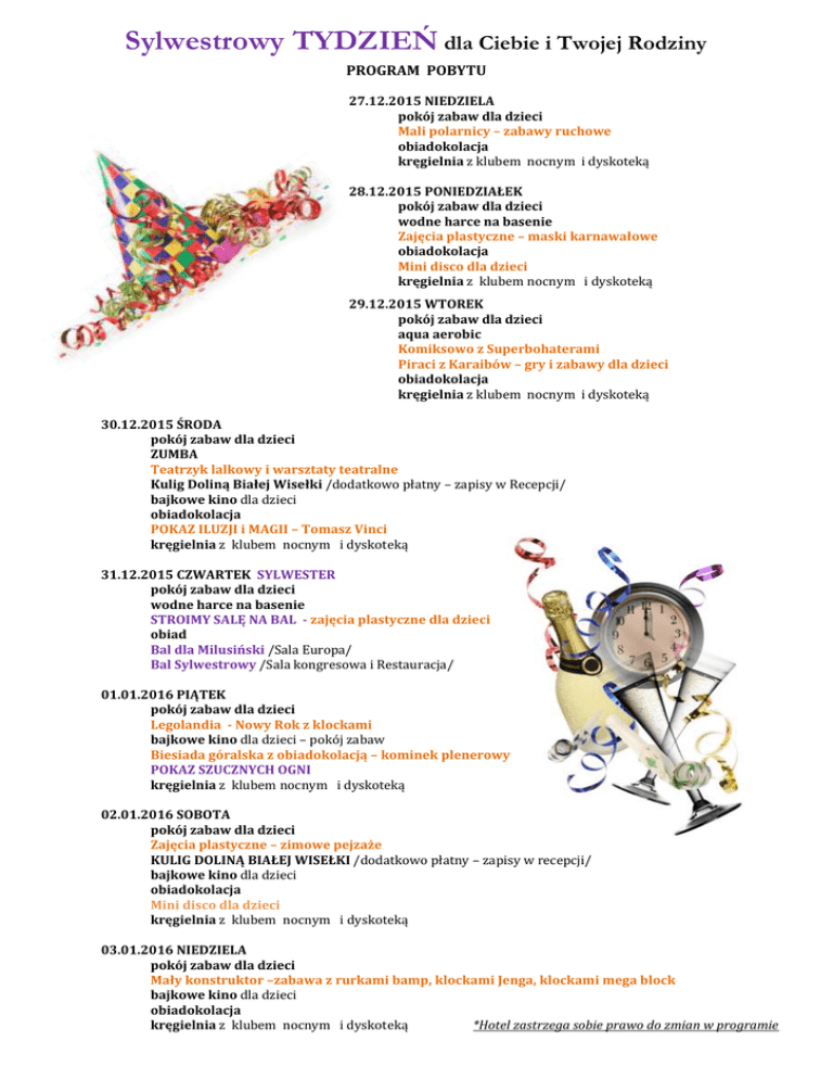 Sylwestrowy TYDZIEŃ dla Ciebie i Twojej Rodziny PROGRAM POBYTU 27.12.2015 NIEDZIELA pokój zabaw dla dzieci Mali polarnicy – zabawy ruchowe obiadokolacja kręgielnia z klubem nocnym i dyskoteką 28.12.2015 PONIEDZIAŁEK pokój zabaw dla dzieci wodne harce na basenie Zajęcia plastyczne – maski karnawałowe obiadokolacja Mini disco dla dzieci kręgielnia z klubem nocnym i dyskoteką 29.12.2015 WTOREK pokój zabaw dla dzieci aqua aerobic Komiksowo z Superbohaterami Piraci z Karaibów – gry i zabawy dla dzieci obiadokolacja kręgielnia z klubem nocnym i dyskoteką 30.12.2015 ŚRODA pokój zabaw dla dzieci ZUMBA Teatrzyk lalkowy i warsztaty teatralne Kulig Doliną Białej Wisełki /dodatkowo płatny – zapisy w Recepcji/ bajkowe kino dla dzieci obiadokolacja POKAZ ILUZJI i MAGII – Tomasz Vinci kręgielnia z klubem nocnym i dyskoteką 31.12.2015 CZWARTEK SYLWESTER pokój zabaw dla dzieci wodne harce na basenie STROIMY SALĘ NA BAL - zajęcia plastyczne dla dzieci obiad Bal dla Milusiński /Sala Europa/ Bal Sylwestrowy /Sala kongresowa i Restauracja/ 01.01.2016 PIĄTEK pokój zabaw dla dzieci Legolandia - Nowy Rok z klockami bajkowe kino dla dzieci – pokój zabaw Biesiada góralska z obiadokolacją – kominek plenerowy POKAZ SZUCZNYCH OGNI kręgielnia z klubem nocnym i dyskoteką 02.01.2016 SOBOTA pokój zabaw dla dzieci Zajęcia plastyczne – zimowe pejzaże KULIG DOLINĄ BIAŁEJ WISEŁKI /dodatkowo płatny – zapisy w recepcji/ bajkowe kino dla dzieci obiadokolacja Mini disco dla dzieci kręgielnia z klubem nocnym i dyskoteką 03.01.2016 NIEDZIELA pokój zabaw dla dzieci Mały konstruktor –zabawa z rurkami bamp, klockami Jenga, klockami mega block bajkowe kino dla dzieci obiadokolacja kręgielnia z klubem nocnym i dyskoteką *Hotel zastrzega sobie prawo do zmian w programie