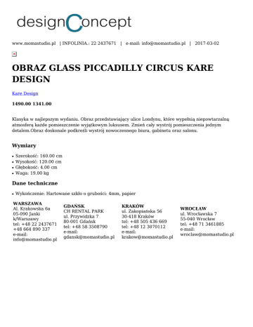 www.momastudio.pl | INFOLINIA.: 22 2437671 | e-mail: [email protected] | 2017-03-02 OBRAZ GLASS PICCADILLY CIRCUS KARE DESIGN Kare Design 1490.00 1341.00 Klasyka w najlepszym wydaniu. Obraz przedstawiający ulice Londynu, które wypełnią niepowtarzalną atmosferą każde pomieszczenie wyjątkowym luksusem. Zmień cały wystrój pomieszczenia jednym detalem.Obraz doskonale podkreśli wystrój nowoczesnego biura, gabinetu oraz salonu. Wymiary ● ● ● ● Szerokość: 160.00 cm Wysokość: 120.00 cm Głębokość: 4.00 cm Waga: 19.00 kg Dane techniczne ● Wykończenie: Hartowane szkło o grubości: 4mm, papier WARSZAWA Al. Krakowska 6a 05-090 Janki k/Warszawy tel: +48 22 2437671 +48 664 890 337 e-mail: [email protected] GDAŃSK CH RENTAL PARK ul. Przywidzka 7 80-001 Gdańsk tel: +48 58 3508790 e-mail: [email protected] KRAKÓW ul. Zakopiańska 56 30-418 Kraków tel: +48 505 436 669 tel: +48 12 3070112 e-mail: [email protected] WROCŁAW ul. Wrocławska 7 55-040 Wrocław tel: +48 71 3461885 e-mail: [email protected]