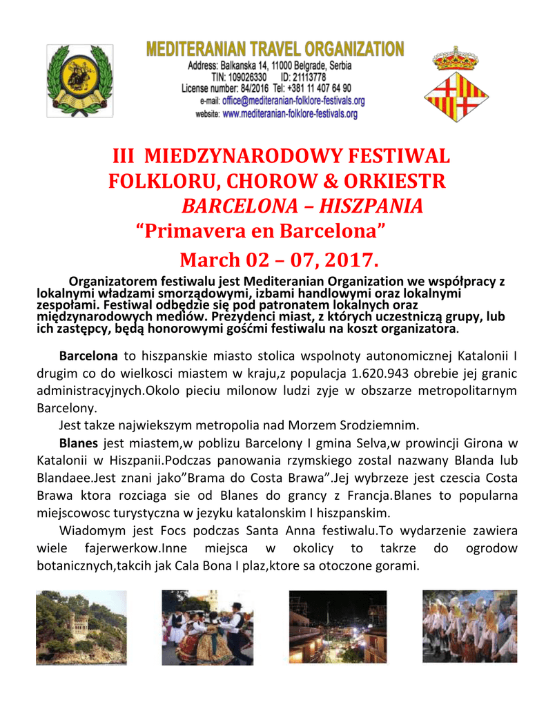 III MIEDZYNARODOWY FESTIWAL FOLKLORU, CHOROW & ORKIESTR BARCELONA – HISZPANIA “Primavera en Barcelona” March 02 – 07, 2017. Organizatorem festiwalu jest Mediteranian Organization we współpracy z lokalnymi władzami smorządowymi, izbami handlowymi oraz lokalnymi zespołami. Festiwal odbędzie się pod patronatem lokalnych oraz międzynarodowych mediów. Prezydenci miast, z których uczestniczą grupy, lub ich zastępcy, będą honorowymi gośćmi festiwalu na koszt organizatora. Barcelona to hiszpanskie miasto stolica wspolnoty autonomicznej Katalonii I drugim co do wielkosci miastem w kraju,z populacja 1.620.943 obrebie jej granic administracyjnych.Okolo pieciu milonow ludzi zyje w obszarze metropolitarnym Barcelony. Jest takze najwiekszym metropolia nad Morzem Srodziemnim. Blanes jest miastem,w poblizu Barcelony I gmina Selva,w prowincji Girona w Katalonii w Hiszpanii.Podczas panowania rzymskiego zostal nazwany Blanda lub Blandaee.Jest znani jako”Brama do Costa Brawa”.Jej wybrzeze jest czescia Costa Brawa ktora rozciaga sie od Blanes do grancy z Francja.Blanes to popularna miejscowosc turystyczna w jezyku katalonskim I hiszpanskim. Wiadomym jest Focs podczas Santa Anna festiwalu.To wydarzenie zawiera wiele fajerwerkow.Inne miejsca w okolicy to takrze do ogrodow botanicznych,takcih jak Cala Bona I plaz,ktore sa otoczone gorami. PROGRAM 1 Dzien – Marzec 2 Pryjazd do Blanes/Lioret de mar/ Barcelona. Zameldowanie w wybranem hotelu. Kolacja. Opcionalnie wieczornie. Nocleg. 2 Dzien - Marzec 3 Snadanie. Konferencja w centrum prasowim. Tury opcionalne do Barceloni Gaudi’s Barcelona,Sagrada Familia,Guel Park,Ramblom, Gothic square,Cathedral,Parliament,Picasso’s museum, etc.).Ceremonia otwarcia. Wstepy indiwidulany grupy. Kolacja.Nocleg. 3 Dzien – Marzec 4 Snadanie. Wizita opcijonalna do Tossa de Mar statkiem. Wstepy indiwidualny grupy. Zamikanie ceremonii. Kolacja.Opcionalne wieczornie. Nocleg. 4 Dzien – Marzec 5 Snadanie. Wizita opcijonalna na stadionie Camp Nou(FCBarcelona) I do Aquarium. Powrot do Blanes/Lioret de Mar. Opcionalne wieczornie do diskoteki I klubu “LaSiesta”. Kolacja. Nocleg. 5 Dzien – Marzec 6 Snadanie. Opcionalnie wieczecki do aquaparku.Wolny czas. Kolacja. Nocleg. 6 Dzien – Marzec 7 Snadanie. Wmeldowanie z hotelu. Koniec serwisu. *Trip to Blanes, Barcelona – Travel guide http://www.youtube.com/watch?v=eWDk1PGYoCk Cena za osobe Blanes Hotel Esplendid *** www.hotelesplendid.com 135€ 149€ full board extra dzien 27€ extra dzien 30€ 135€ 149€ full board extra dzien 27€ extra dzien 30€ 135€ 149€ full board extra dzien 27€ extra dzien 30€ 135€ 149€ full board extra dzien 27€ extra dzien 30€ 135€ 149€ full board extra dzien 27€ extra dzien 30€ Lloret de mar: Hotel Flamingo**** http://www.granhotelflamingo.com/ Hotel Maria Del Mar***www.hotelmariadelmar.net Hotel Selvamar*** www.hotelselvamar.com/en/ Hotel Don Juan*** www.donjuanhotels.com/hoteles.php?hotel=1 Barcelona: Hotel *** 199€ extra dzien 40€ Oferta specjalna: grupy, które już brały udział w innych festiwalach Organizacji Mediteranian otrzyma zniżkę w wysokości 10%. Cena zawiera Uczestnistwo w festiwalu Opieke podzas trwania festiwalu Tablice pamiatkowe,materialy foto I video Zakwaterowanie w wybranym obiekcie w pokojach dwu,trzy lub czetroosobowych z wyzywieniemHB Cena nie obejmuje PRICE DOES NOT INCLUDE -Wycieczki fakultatywne -Wydatki indywidualne I wszelkie koszta,ktorych nie pokrywa organizator festiwalu. Ceny opcijonalne Bilety na zwedzanie Transfer Barcelona Lotnisko - Hotel - Lotnisko - OW podroz jedna strone autokarem 30 podroznich - 420€ - OW podroz jedna strone autokarem 50 podroznich - 440€ Przewodnik Barcelona 150 - 170 euro (w zaleznosci od jezyka) Wyczecki: - Sagrada familia tour - 16€, bilet - Boat tour to Tossa de mar – 16€ - Camp Nou tour - 20€ - Aquarium Barcelona – 18€ - Club“La Siesta”- Flamenco show, Przekaszki I napoje wlaczone – 18€ - Club La Siesta bus transfer - 3€ do osobe - Aqua park – 24€ / Port Aventura park – 39€ Dyskoteka 8€ Cena za transport autobusowy dla wszystkich wycieczek ( Wyjatkiem wycieczke lodzia gdzie nie jest potrzebny transport) – 12€ - 15€ Uwaga • Dopłata do pokoju dwuosobowym wynosi 7 € za osobę / dzień. • Dopłata do pokoju jednoosobowego dziennie: Hotel *** 18 € • Na każde 25 osób w grupie 26. osoba jest bezpłatnie (* Wolna od opłat nakłada na regularnych cen każdego festiwalu i nie obejmuje dodatkowych opłat) Organizator zastrzega sobie prawo do zmiany zasad i warunków występów, wydajność wycieczek i komponentów programu, ze względu na obiektywnych warunkach. MEDITERANIAN ORGANIZATION www.mediteranian-folklore-festivals.org [email protected] Kostas Leivadiotis: +381655588026 +381114076490 +381628754729