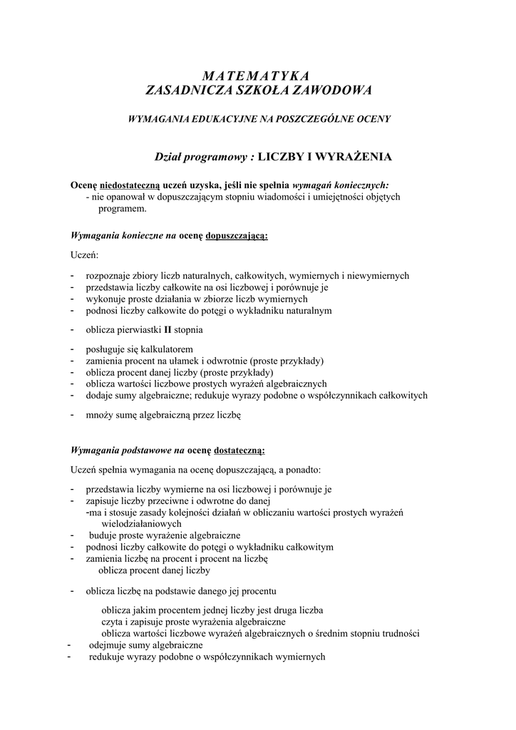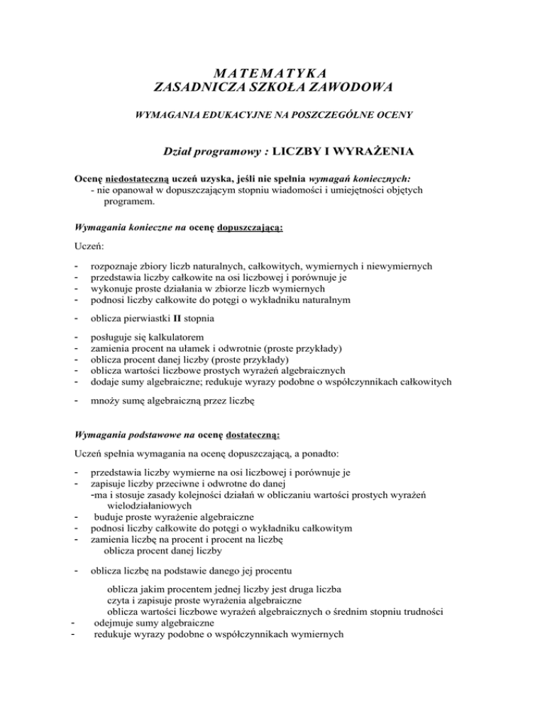 M ATE M ATY K A ZASADNICZA SZKOŁA ZAWODOWA WYMAGANIA EDUKACYJNE NA POSZCZEGÓLNE OCENY Dział programowy : LICZBY I WYRAŻENIA Ocenę niedostateczną uczeń uzyska, jeśli nie spełnia wymagań koniecznych: - nie opanował w dopuszczającym stopniu wiadomości i umiejętności objętych programem. Wymagania konieczne na ocenę dopuszczającą: Uczeń: - rozpoznaje zbiory liczb naturalnych, całkowitych, wymiernych i niewymiernych przedstawia liczby całkowite na osi liczbowej i porównuje je wykonuje proste działania w zbiorze liczb wymiernych podnosi liczby całkowite do potęgi o wykładniku naturalnym - oblicza pierwiastki II stopnia - posługuje się kalkulatorem zamienia procent na ułamek i odwrotnie (proste przykłady) oblicza procent danej liczby (proste przykłady) oblicza wartości liczbowe prostych wyrażeń algebraicznych dodaje sumy algebraiczne; redukuje wyrazy podobne o współczynnikach całkowitych - mnoży sumę algebraiczną przez liczbę Wymagania podstawowe na ocenę dostateczną: Uczeń spełnia wymagania na ocenę dopuszczającą, a ponadto: - - przedstawia liczby wymierne na osi liczbowej i porównuje je zapisuje liczby przeciwne i odwrotne do danej -ma i stosuje zasady kolejności działań w obliczaniu wartości prostych wyrażeń wielodziałaniowych buduje proste wyrażenie algebraiczne podnosi liczby całkowite do potęgi o wykładniku całkowitym zamienia liczbę na procent i procent na liczbę oblicza procent danej liczby oblicza liczbę na podstawie danego jej procentu oblicza jakim procentem jednej liczby jest druga liczba czyta i zapisuje proste wyrażenia algebraiczne oblicza wartości liczbowe wyrażeń algebraicznych o średnim stopniu trudności odejmuje sumy algebraiczne redukuje wyrazy podobne o współczynnikach wymiernych - wyłącza wspólny czynnik (liczbowy) poza nawias mnoży sumę algebraiczną przez jednomian - zapisuje treść prostego zadania za pomocą wyrażenia algebraicznego Wymagania rozszerzające na ocenę dobrą: Uczeń spełnia wymagania na ocenę dostateczną, a ponadto: - podnosi liczby wymierne do potęgi o wykładniku naturalnym usuwa niewymierność z mianownika (bez stosowania wzorów skróconego mnożenia - dokonuje przybliżeń liczb z nadmiarem i niedomiarem oraz zaokrągla liczby z zadana dokładnością - rozumie pojęcie liczby niewymiernej - oblicza wartości złożonych wyrażeń arytmetycznych - stosuje obliczenia procentowe w typowych zadaniach tekstowych - odczytuje i zapisuje wyrażenia algebraiczne - oblicza wartości liczbowe wyrażeń algebraicznych - wyłącza wspólny czynnik (jednomian) poza nawias - mnoży sumy algebraiczne - redukuje wyrazy podobne o współczynnikach wymiernych upraszcza wyrażenia algebraiczne, w których występują iloczyny (również wzory skróconego mnożenia o nieskomplikowanej budowie). - zna wzory skróconego mnożenia wyłącza wspólny czynnik przez grupowanie wyrazów stosuje wzory skróconego mnożenia w prostych przykładach, - zapisuje treść zadania za pomocą wyrażenia algebraicznego Wymagania dopełniające na ocenę bardzo dobra: Uczeń spełnia wymagania na ocenę dobrą, a ponadto: - rozpoznaje i szacuje wartości niektórych liczb niewymiernych - oblicza wartości wyrażeń arytmetycznych wielodziałaniowych w zbiorze liczb wymiernych, zawierające nawiasy, potęgi, pierwiastki i kreskę ułamkową - układa wyrażenia arytmetyczne do treści zadania. - potrafi zastosować obliczenia procentowe w zadaniach problemowych różnego typu - odczytuje i zapisuje wyrażenia algebraiczne o skomplikowanej budowie - oblicza wartości liczbowe wyrażeń algebraicznych (o podwyższonym stopniu trudności) - upraszcza wyrażenia algebraiczne, w których występują wzory skróconego mnożenia - usuwa niewymierność z mianownika stosując wzory skróconego mnożenia. Ocenę celująca uczeń uzyska, jeśli spełnia wymagania dopełniające, a ponadto co najmniej 3 z niżej wymienionych: - wykazuje szczególne zainteresowanie przedmiotem, - przejawia dużą aktywność w trakcie lekcji, - uczestniczy w dodatkowych zajęciach organizowanych w szkole, rozwiązuje zadania nietypowymi metodami, -właściwie interpretuje i umie wykorzystać zdobytą wiedzę w sytuacjach problemowych (pozaprogramowych), - pomaga słabszym uczniom w nauce Dział programowy : PLANIMETRIA Ocenę niedostateczną uczeń uzyska, jeśli nie spełnia wymagań koniecznych: -nie opanował w dopuszczającym stopniu wiadomości i umiejętności objętych programem. Wymagania konieczne na ocenę dopuszczającą: Uczeń: - -rozpoznaje i nazywa podstawowe figury geometryczne (według programu) zna klasyfikację trójkątów ze względu na kąty i boki, -nazywa boki w trójkącie prostokątnym, ma podstawowe czworokąty rozróżnia pojęcie koła i okręgu oraz inne z nimi związanych (środek, promień, cięciwa, średnica), rozróżnia kąty środkowe i wpisane, ma jednostki długości i je przelicza oraz ma jednostki pola, ma twierdzenie Pitagorasa , oblicza długość przeciwprostokątnej trójkąta prostokątnego na podstawie twierdzenia Pitagorasa, zna twierdzenie Talesa i potrafi wykorzystać je w najprostszych obliczeniach, podaje określenie trójkątów przystających, podaje określenie trójkątów podobnych Wymagania podstawowe na ocenę dostateczną: Uczeń spełnia wymagania na ocenę dopuszczającą, a ponadto: - ma własności trójkątów, ma własności czworokątów ma definicję wielokątów foremnych, ma własności wielokątów foremnych, - ma wzory na pola figur płaskich i ich obwody, zna jednostki powierzchni gruntów ornych (ar, hektar), stosuje wzory na pola figur płaskich w prostych zadaniach oblicza obwód i pole koła, - ma związki między kątami środkowymi i wpisanymi opartymi na tym samym łuku, - oblicza skalę, gdy zna wymiary planu obiektów i wymiary rzeczywiste, -oblicza długości przyprostokątnych trójkąta prostokątnego na podstawie twierdzenia Pitagorasa, potrafi spr