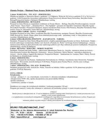 Ziemia Święta – Śladami Pana Jezusa 20.04-26.04.2017 1 dzień: WARSZAWA – TEL AVIV - JEROZOLIMA Zbiórka na lotnisku w Warszawa Okręci o godzinie 7:15 Odprawa. Wylot do Tel Avivu o godzinie 9:15 w Tel Avivie o godzinie 14:00 Przejazd do Jerozolimy-nabożeństwo Drogi Krzyżowej ulicami Starej Jerozolimy. Bazylika Grobu BożegoPrzejazd do hotelu w Betlejem Obiadokolacja i nocleg. 2 dzień: JEROZOLIMA - BETLEJEM Przejazd na Górę Oliwną ze wspaniałym widokiem na Święte Miasto – Betfage, Bazylika Wniebowstąpienia i kościół „Pater Noster - Ojcze Nasz”, „ Dominus Flevit – Pan Zapłakał ”, przejście do Ogrodów Getsemani i Bazyliki Agonii – Wszystkich Narodów. Przejazd do Betlejem, miejsca narodzenia Pana Jezusa. Pole Pasterzy, Bazylika Narodzenia Pana Jezusa, Grota św. Hieronima, Grota Mleczna. Obiadokolacja, nocleg. 3 dzień: GÓRA TABOR – KANA - NAZARET Śniadanie.Przejazd na Górę Tabor, zwiedzanie Bazyliki Przemienienia, następnie Nazaret- Bazylika Zwiastowania NMP, Kościół św. Józefa i Kana- gdzie Jezus dokonał pierwszego cudu – przemiany wody w wino podczas uczty weselnej. Obiadokolacja, nocleg. 4 dzień: GÓRA BŁOGOSŁAWIEŃSTW – KAFARNAUM – TABGHA Śniadanie. Przejazd na Górę Ośmiu Błogosławieństw z kaplicą upamiętniającą Kazanie na Górze. Kafarnaum, Tabgha – kościół cudownego rozmnożenia chleba i ryb. Kościół „Prymatu św. Piotra” na brzegu Jeziora Galilejskiego - miejsca namaszczenia Piotra na głowę Kościoła oraz cudownego połowu ryb. Rejs statkiem po jeziorze Galilejskim. Przejazd na obiadokolację i nocleg do Betlejem. 5 dzień : BETANIA - JERYCHO – MORZE MARTWE Śniadanie. Przejazd nad rzekę Jordan – odnowienie Sakramentu Chrztu św., Jerycho– najstarsze miasto na świecie – Góra Kuszenia (wejście dla chętnych) i Sykomora – drzewo Zacheusza. Morze Martwe– największa depresja na świecie – chwila relaksu i kąpieli dla chętnych. Przejazd do Betanii – Sanktuarium św. Łazarza, Marii i Marty. Powrót do Betlejem na obiadokolację i nocleg. 6 dzień : JEROZOLIMA Śniadanie. Przejazd do Ain Karem– Sanktuarium Nawiedzenia św. Elżbiety i narodzenia Jana Chrzciciela. Następnie Góra Syjon– Wieczernik, kościół Zaśnięcia N.M.Panny. Przejscie przez Ścianę Płaczu- chwila czasu wolnego Obiadokolacja, nocleg. 7 dzień : JEROZOLIMA –TEL AVIV- WARSZAWA Śniadanie.przejazd do Jaffy- kościół Św. Piotra. Transfer na lotnisko. Odlot o godzinie 16:50. planowany przylot o godzinie 19:40 do Warszawy. CENA: 2300 ZŁ Świadczenia: -noclegi – pokoje 2, 3 - os. z łazienkami, wyżywienie 2 x dziennie (śniadania i obiadokolacje) -ubezpieczenie NNW i KL, opieka duszpasterza oraz przewodnika-biblisty -przelot samolotem – komfortowy autokar w Izraelu – Dodatkowo na wstępy do zwiedzanych obiektów i realizację programu 150 usd Program jest ramowy i może ulec zmianom w zależności od zaistniałej sytuacji w czasie trwania wyjazdu! UWAGA! Bardzo proszę o zabezpieczenie ok. 15 usd na dodatkowy posiłek ostatniego dnia! Dzień pierwszy i ostatni przeznaczone są na podróż, a cena została skalkulowana z uwzględnieniem ewentualnych niedogodności wynikających z tego faktu (wczesnoranne lub późnonocne wyloty). Program jest ramowy i może ulec drobnym zmianom, jednak wszystkie miejsca i obiekty przewidziane do zwiedzania zostaną zachowane. BIURO PIELGRZYMKOWE „PAX” Białystok, ul. Ks. Adama Abramowicza 1 ( obok Kościoła Św. Rocha) Pn. – Pt. 9.00 – 16.00 Sobota 10.00-12.00 Tel.: +48 85 674 5924, +48 888 17 96 17 Mail : [email protected] www.bppax.pl
