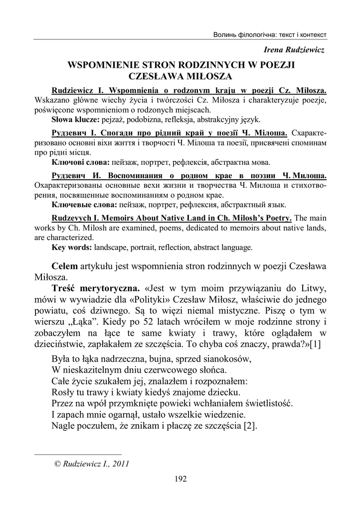 Волинь філологічна: текст і контекст Irena Rudziewicz WSPOMNIENIE STRON RODZINNYCH W POEZJI CZESŁAWA MIŁOSZA Rudziewicz I. Wspomnienia o rodzonym kraju w poezji Cz. Miłoszа. Wskazano główne wiechy życia i twórczości Cz. Miłoszа і charakteryzuje poezje, poświęcone wspomnieniom o rodzonych miejscach. Słowa klucze: pejzaż, podobizna, refleksja, abstrakcyjny język. Рудзевич І. Спогади про рідний край у поезії Ч. Мілоша. Схарактеризовано основні віхи життя і творчості Ч. Мілоша та поезії, присвячені споминам про рідні місця. Ключові слова: пейзаж, портрет, рефлексія, абстрактна мова. Рудзевич И. Воспоминания о родном крае в поэзии Ч. Милоша. Охарактеризованы основные вехи жизни и творчества Ч. Милоша и стихотворения, посвященные воспоминаниям о родном крае. Ключевые слова: пейзаж, портрет, рефлексия, абстрактный язык. Rudzevych I. Memoirs About Native Land in Ch. Milosh’s Poetry. The main works by Ch. Milosh are examined, poems, dedicated to memoirs about native lands, are characterized. Key words: landscape, portrait, reflection, abstract language. Celem artykułu jest wspomnienia stron rodzinnych w poezji Czesława Miłosza. Treść merytoryczna. «Jest w tym moim przywiązaniu do Litwy, mówi w wywiadzie dla «Polityki» Czesław Miłosz, właściwie do jednego powiatu, coś dziwnego. Są to więzi niemal mistyczne. Piszę o tym w wierszu „Łąka”. Kiedy po 52 latach wróciłem w moje rodzinne strony i zobaczyłem na łące te same kwiaty i trawy, które oglądałem w dzieciństwie, zapłakałem ze szczęścia. To chyba coś znaczy, prawda?»[1] Była to łąka nadrzeczna, bujna, sprzed sianokosów, W nieskazitelnym dniu czerwcowego słońca. Całe życie szukałem jej, znalazłem i rozpoznałem: Rosły tu trawy i kwiaty kiedyś znajome dziecku. Przez na wpół przymknięte powieki wchłaniałem świetlistość. I zapach mnie ogarnął, ustało wszelkie wiedzenie. Nagle poczułem, że znikam i płaczę ze szczęścia [2]. © Rudziewicz I., 2011 192 Імагологічні виміри національної літератури Urodzony 30 czerwca 1911 roku w Szetejniach na Litwie Czesław Miłosz był synem inżyniera i ze względu na zawód ojca rodzina spędziła kilka lat nad brzegami Wołgi, na Syberii. Studiował w latach 1929 – 1934 na Uniwersytecie Stefana Batorego w Wilnie, gdzie uzyskał magisterium z prawa. Jako student był jednym z założycieli w 1931 roku czasopisma «Żagary». W 1933 roku został opublikowany pierwszy tomik wierszy «Poemat o czasie zastygłym», w którym przeważały utwory o tematyce socjalnej, poświęcone rozważaniom o codziennym życiu. W Wilnie w 1936 roku pojawił się jeszcze jeden tomik poezji «Trzy zimy», przesyconej obrazami i opisami krajobrazów, pejzaży, przyrody stron rodzinnych, Litwy. Zarówno Wilno, jak i wspomnienia z lat dzieciństwa, młodości, pejzaży i miejsc rodzinnych na zawsze pozostają w liryce Czesława Miłosza: Miasto było ukochane i szczęśliwe, Zawsze w czerwcowych piwoniach i późnych bzach Pnące się barkowymi wieżami ku niebu. Powrócić z majówki i stawiać w wazach bukiety, Za oknem widzieć ulicę, którą kiedyś szło się do szkoły (Na murach ostre granice słońca i cienia) (s. 1149). Wojnę i okupację poeta spędził w Warszawie, uczestnicząc aktywnie w podziemnym życiu literackim, opisując przeżycia związane z tym okresem w wydanym w 1945 roku tomiku poezji «Ocalenie», w którym znalazły również miejsce utwory o wymowie antynazistowskiej. Poeta mówił o aktualnych problemach rzeczywistości wojennej, okupacyjnej i powojennej, o ludzkich postawach i zachowaniach, gdy różnorodnym, próbom poddawane były wartości moralne, humanistyczne, narodowe i społeczne. Twórcę interesuje przede wszystkim postawa prostego zwyczajnego człowieka wobec zagłady, zniewolenia, katastrofy narodowej i dziejowej. Przed wyjazdem za granicę Miłosz pisze i publikuje bardzo dużo. Szczególne cenne i znane były jego przekłady, m. in. utworów Eliota czy Pabla Narudy. Po przyjeździe w 1949 roku do Paryża poeta nawiązuje kontakt z Instytutem Literackim, który prowadził Jerzy Giedrojć. W 1951 roku postanawia pozostać na emigracji, a od 1960 roku zamieszkał w USA obejmując Katedrę Języków i Literatur Słowiańskich na Uniwersytecie Kalifornijskim. Za całokształt twórczości poetyckiej w 1980 roku Czesław Miłosz otrzymał literacką Nagrodę Nobla. Od 1989 roku często przyjeżdżał 193 Волинь філологічна: текст і контекст do Polski, przybywał w Krakowie i Berkeley. Zmarł 14 sierpnia 2004 roku w Krakowie. Całą poezją Miłosza charakteryzuje zróżnicowanie gatunkowe, wielość tematów, tonacji, stylów, wątków lokalnych i europejskich, literackich, polskich i ogólnoświatowych. Obok traktatów poetyckich i teologicznych, portretów i rozważeń o człowieku, o ludziach przywoływanych z dawnych lat, ocalanych z niepamięci, wierszy erotycznych, zmysłowych, miłosnych, religijnych i filozoficznych znaczne miejsce zajmują utwory o przyrodzie, o tradycjach rodzinnych, wspomnienia o miejscach urodzenia i dzieciństwa, które wpłynęły na całe życie poety, towarzyszyły mu zawsze i wszędzie, nawet we śnie. «Prawie wszystkie moje podróże we śnie, wspomina Miłosz, mają swój wzór w jednej prawdziwej: bryką z Raudonki przy trakcie Wilno – Jaszuny na kiermasz do Turgiel. Piaszczysta droga z koleinami, ciągle to w dół, to pod górę, w słońcu ścierniska na pagórkach, tu i tam borek, to znów olszyny przy strum
