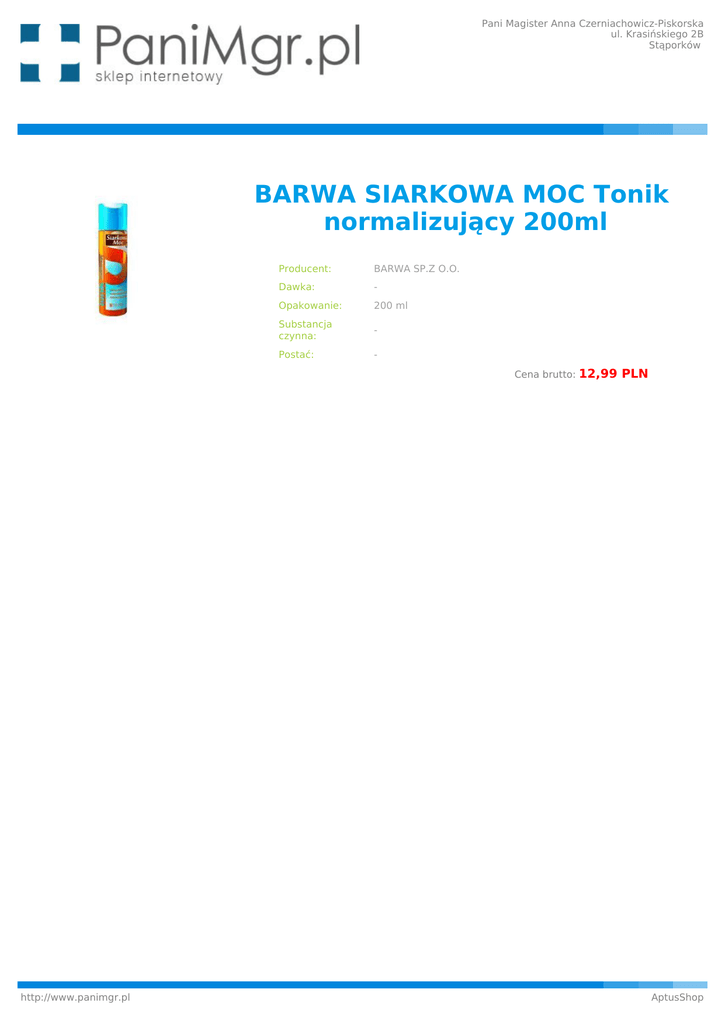 Pani Magister Anna Czerniachowicz-Piskorska ul. Krasińskiego 2B Stąporków BARWA SIARKOWA MOC Tonik normalizujący 200ml Producent: BARWA SP.Z O.O. Dawka: - Opakowanie: 200 ml Substancja czynna: - Postać: Cena brutto: http://www.panimgr.pl 12,99 PLN AptusShop