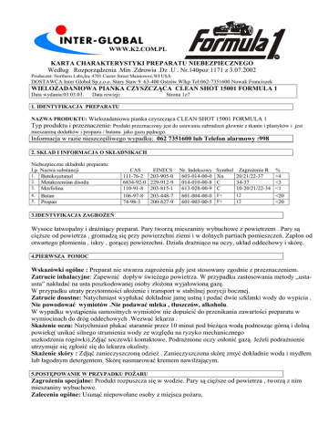WWW.K2.COM.PL KARTA CHARAKTERYSTYKI PREPARATU NIEBEZPIECZNEGO Według Rozporządzenia .Min .Zdrowia .Dz .U . Nr.140poz 1171 z 3.07.2002 Producent: Northern Labs,Inc 4701 Custer Street Maintowoc,WI USA DOSTAWCA Inter Global Sp.z.o.o. Stary Staw 9 63-400 Ostrów Wlkp Tel:062-7351600 Nowak Franciszek WIELOZADANIOWA PIANKA CZYSZCZĄCA CLEAN SHOT 15001 FORMULA 1 Data wydania:03.03.03. Data rewizji: Strona 1z7 1. IDENTYFIKACJA PREPARATU NAZWA PRODUKTU: Wielozadaniowa pianka czyszcząca CLEAN SHOT 15001 FORMULA 1 Typ produktu i przeznaczenie: Produkt przeznaczony jest do usuwania zabrudzeń głownie z tkanin i plastyków i jest mieszaniną dodatków i propanu / butanu jako gazu pędnego. Informacja w razie nieszczęśliwego wypadku: 062 7351600 lub Telefon alarmowy :998 2. SKŁAD I INFORMACJA O SKŁADNIKACH Niebezpieczne składniki preparatu: Lp Nazwa substancji 1. Butoksyetanol 2. Metakrzemian disodu 3. Morfolina CAS EINECS 111-76-2 203-905-0 6834-92-0 229-912-9 110-91-8 203-815-1 4. 5. 106-97-8 74-98-3 Butan Propan 203-448-7 200-827-9 Nr. Indeksowy 603-014-00-0 014-010-00-8 613-028-00-9 Symbol Zagrożenie R Xn 20/21/22-37 C 34-37 C 10-20/21/22-34 601-004-00-0 F+ 601-003-00-5 F+ 12 12 % <4 <3 <1 <20 <20 3.IDENTYFIKACJA ZAGROŻEŃ Wysoce łatwopalny i drażniący preparat. Pary tworzą mieszaniny wybuchowe z powietrzem . Pary są cięższe od powietrza , gromadzą się przy powierzchni ziemi i w dolnych partiach pomieszczeń. Zapłon od otwartego płomienia , iskry , gorącej powierzchni. Działa drażniąco na oczy, układ oddechowy i skórę. 4.PIERWSZA POMOC Wskazówki ogólne : Preparat nie stwarza zagrożenia gdy jest stosowany zgodnie z przeznaczeniem. Zatrucie inhalacyjne: Zapewnić dopływ świeżego powietrza. W przypadku zastosowania metody „ustausta” nakładać na usta poszkodowanej osoby złożona wyjałowioną gazę. W przypadku utraty przytomności ułożenie i transport w stabilnej pozycji bocznej. Zatrucie doustne: Natychmiast wypłukać dokładnie jamę ustną i podać dwie szklanki wody do wypicia . Nie powodować wymiotów .Nie podawać mleka , tłuszczów, alkoholu. W wypadku wystąpienia samositnych wymiotów nie dopuścić do przenikania zawartości preparatu w wymiocinach do dróg oddechowych .Wezwać lekarza . Skażenie oczu: Natychmiast płukać starannie przez 10 minut pod bieżąca wodą podnosząc górną i dolną powiekę( unikać silnego strumienia wody ze względu na ryzyko mechanicznego uszkodzenia rogówki).Zdjąć soczewki kontaktowe. Podrażnione oczy osłonić gazą. Jeżeli podrażnienie utrzymuje się zgłosić się do lekarza okulisty. Skażenie skóry : Zdjąć zanieczyszczoną odzież . Zanieczyszczona skórę zmyć dokładnie woda i mydłem lub łagodnym detergentem. Skórę nasmarować kremem nawilżającym. 5.POSTĘPOWANIE W PRZYPADKU POŻARU Zagrożenia specjalne: Produkt rozpuszcza się w wodzie. Pary są cięższe od powietrza , tworzą z nim mieszaniny wybuchowe. Zalecenia ogólne: Usunąć niepowołane osoby z miejsca pożaru. WIELOZADANIOWA PIANKA CZYSZCZĄCA CLEAN SHOT 15001 FORMULA 1 Strona 2z7 Odpowiednie środki gaśnicze: Woda – prądy rozproszone .Suche środki gaśnicze, piana odporna na działanie alkoholu, dwutlenek węgla . Środki których nie wolno używać ze względów bezpieczeństwa: Gaszenie pełnym strumieniem wody. Środki ochrony indywidualnej dla strażaków: Używać zabezpieczeń dla górnych dróg oddechowych ( maski ochronne) oraz ubranie ochronne Gaszenie pożaru: Małe pożary gasić gaśnica proszkową lub śniegową: Duże pożary Gasić pianą. Preparaty narażone na działanie ognia lub wysokiej temperatury chłodzić wodą z bezpiecznej odległości pożaru prysznicem wodnym , o ile to możliwe usunąć je z obszaru zagrożenia. W przypadku pożaru nie przebywać w strefie zagrożenia bez ubrania ognioodpornego i aparatu tlenowego. Zagrożenia związane ze spalaniem: Tlenek węgla oraz możliwe powstawanie niebezpiecznych palnych gazów lub par. Możliwe tworzenie wybuchowych mieszanin z powietrzem. Przegrzane pojemniki ( powyżej 50 stop C) mogą eksplodować. Inne wskazówki: W przypadku pożaru nie przebywać w strefie zagrożenia bez ubrania ognioodpornego i aparatu tlenowego. Zanieczyszczoną wodę zebrać do zbiorników. Nie można jej usuwać do kanalizacji. 6. POSTĘPOWANIE W PRZYPADKU NIEZAMIERZONEGO UWOLNIENIA DO ŚRODOWISKA Środki ochrony indywidualnej: Przy dużych uwolnieniach wentylować przestrzeń. Izolować od źródeł ognia. Nie palić tytoniu. Ewakuować osoby niezwiązane z usuwaniem awarii. Nie wdychać par. Stosować ubranie ochronne i zabezpieczenia oczu i dróg oddechowych. Unikać zanieczyszczenia substancją. Rozpuszczalniki i gazy mogą tworzyć mieszaninę wybuchową przy kontakcie z powietrzem. Gazy są cięższe od powietrza i mogą poruszać się przy powierzchni posadzki. Uszkodzone opakowania usunąć z miejsca awarii na dwór jeżeli nie stanowi to ryzyka. Przestrzegać przepisów bezpieczeństwa pkt 7 i8. Środki ostrożności w zakresie ochrony środowiska: Zapobiec przedostaniu się do wód bez uprzedniej neutralizacji w oczyszczalni ścieków. Metody oczyszczania: Ciecz pozostałą po opróżnieniu pojemnika aerosolowego zebrać przy pomocy materiałów absorbujących do szczelnych opakowań metalowych i przekazać do zlikwidowania wg pkt 13 7. POSTĘPOWANIE Z PREPARATEM I ICH MAGAZYNOWANIE Posługiwanie się: Zapobieganie zatruciom: podczas stosowania nie jeść , nie pić , unikać kontaktu z cieczą. przestrzegać zasad higieny osobistej , stosować odzież i sprzęt ochronny , unikać wdychania Zapobieganie pożarom i wybuchom: wyeliminować źródła zapłonu – nie używać otwartego ognia ,nie używać narzędzi iskrzących i odzieży z tkanin podatnych na elektryzację zachować środki ostrożności dla uniknięcia wyładowań elektrostatycznych. Chronić opakowania przed przegrzaniem , puste opakowania mogą zawierać palne lub potencjalnie wybuchowe opary. 