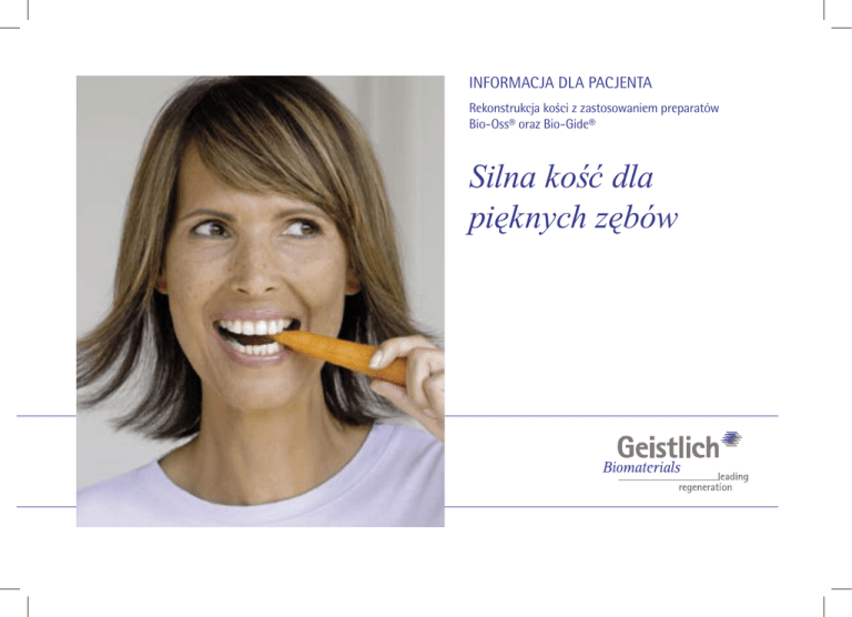 INFORMACJA DLA PACJENTA Rekonstrukcja kości z zastosowaniem preparatów Bio-Oss® oraz Bio-Gide® Silna kość dla pięknych zębów 1 Spis treści Uśmiech to najlepszy sposób na pokazanie własnych zębów Jakie są przyczyny utraty kości? W jakich przypadkach konieczna jest odbudowa kości? W jaki sposób można odbudować kość? Czym są Bio-Oss® i Bio-Gide®? W jaki sposób przeprowadzany jest zabieg? O czym należy pamiętać po zabiegu chirurgicznym? Jakie są kryteria produkcyjne dla Bio-Oss® oraz Bio-Gide®? Jakie są doświadczenia w stosowaniu Bio-Oss® oraz Bio-Gide®? Uwagi 2 3 4 5 6 7 8 11 12 13 15 Uśmiech to najlepszy sposób na pokazanie własnych zębów Silne i piękne zęby poprawiają nasze samopoczucie i wiarę w siebie oraz korzystnie wpływają na odbiór naszej osoby – zarówno w życiu osobistym jak i zawodowym. W związku z tym współcześni, odpowiedzialni dentyści oraz chirurdzy stomatologiczni bardzo dokładnie planują odbudowę brakującego uzębienia oraz leczenie chorych zębów tak, by można było przywrócić pacjentowi właściwą jakość życia. Zabiegi odbudowy kości pozwalają na odtworzenie funkcji zębów oraz ich piękna. W tym celu lekarz dentysta może użyć naturalnych, dobrze tolerowanych materiałów, których jakość potwierdzana jest od wielu lat. 3 Jakie są przyczyny utraty kości? Utrata tkanki kostnej może być spowodowana wieloma różnymi czynnikami, np.: przebytymi urazami, zapaleniem dziąseł i kości spowodowanym obecnością bakteryjnej płytki nazębnej (zapalenie przyzębia). Również po usunięciu zębów dochodzi, z powodu braku obciążenia mechanicznego, do zmniejszenia wysokości i szerokości kości szczęki i żuchwy. Jednak odpowiednia ilość tkanki kostnej jest konieczna dla zapewnienia długotrwałej stabilizacji implantów i zębów. Może być ona podstawowym czynnikiem warunkującym korzystny wygląd zębów i dziąseł. 4 W jakich przypadkach konieczna jest odbudowa kości? 1. Implanty stomatologiczne W celu wzmocnienia i zwiększenia objętości kości szczęki i żuchwy podczas stosowania implantów stomatologicznych, gdy istniejąca ilość kości nie jest wystarczająca dla długotrwałego, stabilnego utrzymania zęba 3. Rozległy ubytek kostny Odbudowa kości po rozległej utracie tkanek twardych 2. Zapalenie przyzębia W celu zachowania istniejącego uzębienia, które utraciło swoje stabilne zakotwiczenie na skutek toczącego się procesu zapalnego w obrębie przyzębia (bakteryjna płytka nazębna) 5. Resekcja korzenia zęba lub usunięcie torbieli W celu odbudowy zniszczonej kości po przeprowadzonej resekcji korzenia zęba lub usunięciu torbieli 1 2 4. Podniesienie dna zatoki szczękowej W celu poprawy warunków kostnych w okolicy bocznego odcinka szczęki (zatoki szczękowej) 3 4 5 5 W jaki sposób można odbudować kość? Ludzka tkanka kostna posiada zdolność regeneracji, czyli inaczej mówiąc odbudowy brakującej kości. Jednak w większości przypadków organizm potrzebuje pomocy. Naturalne produkty Bio-Oss® oraz Bio-Gide® w sposób bardzo skuteczny wspierają procesy własne organizmu przebiegające podczas odbudowy kości. Nowopowstająca kość potrzebuje rusztowania zachowującego się jak szkielet konstrukcji. Materiał kościozastępczy Bio-Oss®, dzięki swojej wysoce porowatej strukturze, doskonale spełnia ten wymóg. Błona Bio-Gide® umieszczana jest na powierzchni gojącej się kości i służy jako bariera ochronna zapobiegająca wrastaniu szybkorosnących tkanek miękkich w przestrzeń, która powinna zostać zajęta wolnonarastającą tkanką kostną. Ponadto, Bio-Gide® wspomaga właściwe gojenie rany. 1. Szkieletowa struktura Bio-Oss® 2. Przyrost naczyń krwionośnych oraz komórek budujących kość 3. Zakończone formowanie nowej kości 1 6 2 3 Czym są Bio-Oss® i Bio-Gide®? Bio-Oss® oraz Bio-Gide® są produktami naturalnymi. Dzięki dużemu podobieństwu do tkanki ludzkiej, w sposób idealny pobudzają one procesy formowania kości oraz gojenia tkanek przebiegające w organizmie człowieka. Podczas gojenia integrują się z tkankami, a następnie w trakcie procesów metabolicznych zachodzących w ludzkim ciele ulegają stopniowemu rozkładowi. W przypadku Bio-Oss® proces ten może trwać kilka lat, natomiast błona Bio-Gide® ulega całkowitemu rozkładowi w ciągu kilku miesięcy. 1. Struktura mikroskopowa Bio-Oss® 2. Bio-Oss® Bio-Oss® wytwarzany jest z części mineralnej kości wołowej z bydła pochodzenia australijskiego. W procesie produkcyjnym usuwane są elementy organiczne, tak więc pozostaje jedynie część twarda kości składająca się ze związków wapnia. Bio-Gide® jest błoną wytwarzaną z kolagenu wieprzowego. W ciele ludzkim białko kolagenowe jest głównym składnikiem skóry oraz tkanki łącznej. Naturalna budowa białkowa Bio-Gide® przyspiesza procesy gojenia ran oraz dzięki swoistemu działaniu jako bariera ochronna umożliwia optymalną regenerację kości. 3. Struktura mikroskopowa Bio-Gide® 4. Bio-Gide® 7 W jaki sposób przeprowadzany jest zabieg? 8 Odbudowa kości oraz wprowadzenie implantu odbywa się w tym samym czasie Wprowadzenie implantu odbywa się dopiero po zakończeniu odbudowy kostnej 1a. Implant stomatologiczny Obnażenie implantu z powodu braku masy kostnej 2a. Zastosowanie Bio-Oss® Wypełnienie ubytku kostnego materiałem Bio-Oss® w celu utworzenia nowej kości 1b. Zastosowania Bio-Oss® Wypełnienie ubytku kostnego materiałem Bio-Oss® w celu utworzenia nowej kości 2b. Zastosowanie Bio-Gide® W celu ochrony tworzącej się kości rana pokrywana jest błoną Bio-Gide® 1c. Zastosowanie Bio-Gide® W celu ochrony tworzącej się kości rana pokrywana jest błoną Bio-Gide® 1a 1b 2c. Implant stomatologiczny Implant stomatologiczny wprowadzany jest po zakończeniu odbudowy kostnej 1c 2a 2b 2c Jeśli ząb zniszczony procesem zapalnym przyzębia ma zostać utrzymany, można wówczas zastosować B