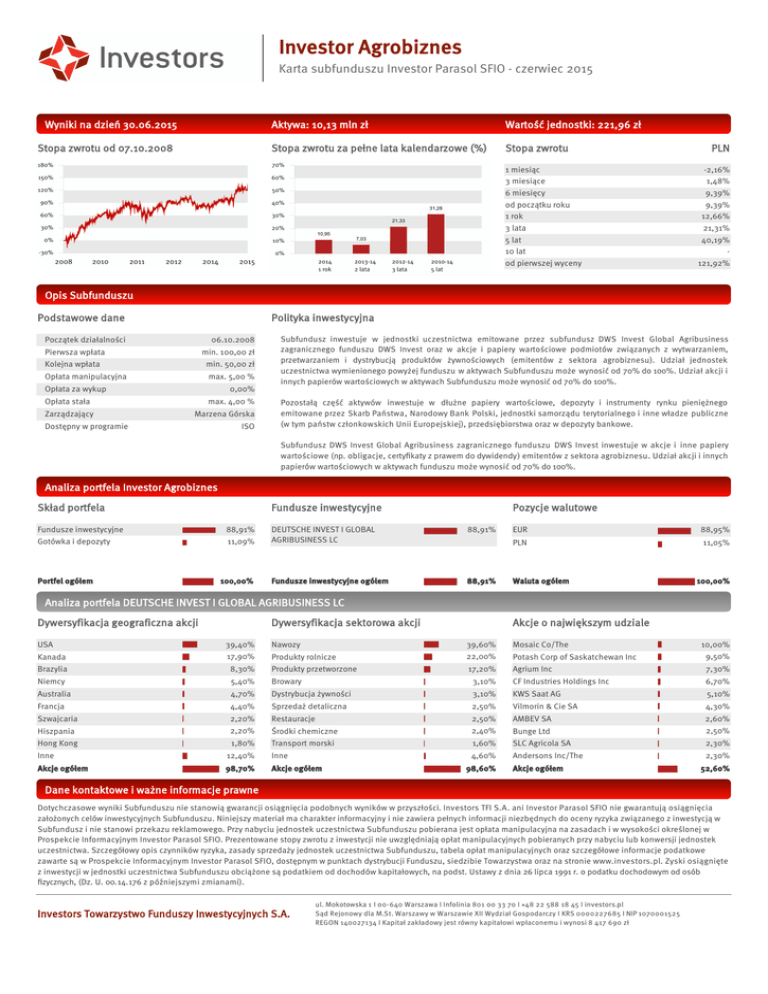 Investor Agrobiznes Karta subfunduszu Investor Parasol SFIO - czerwiec 2015 Wyniki na dzień 30.06.2015 Stopa zwrotu od 07.10.2008 Aktywa: 10,13 mln zł Wartość jednostki: 221,96 zł Stopa zwrotu za pełne lata kalendarzowe (%) Stopa zwrotu 1 miesiąc 3 miesiące 6 miesięcy od początku roku 1 rok 3 lata 5 lat 10 lat od pierwszej wyceny PLN -2,16% 1,48% 9,39% 9,39% 12,66% 21,31% 40,19% 121,92% Opis Subfunduszu Podstawowe dane Polityka inwestycyjna Początek działalności 06.10.2008 Pierwsza wpłata min. 100,00 zł Kolejna wpłata min. 50,00 zł Opłata manipulacyjna max. 5,00 % Opłata za wykup 0,00% Opłata stała Zarządzający max. 4,00 % Marzena Górska Dostępny w programie ISO Subfundusz inwestuje w jednostki uczestnictwa emitowane przez subfundusz DWS Invest Global Agribusiness zagranicznego funduszu DWS Invest oraz w akcje i papiery wartościowe podmiotów związanych z wytwarzaniem, przetwarzaniem i dystrybucją produktów żywnościowych (emitentów z sektora agrobiznesu). Udział jednostek uczestnictwa wymienionego powyżej funduszu w aktywach Subfunduszu może wynosić od 70% do 100%. Udział akcji i innych papierów wartościowych w aktywach Subfunduszu może wynosić od 70% do 100%. Pozostałą część aktywów inwestuje w dłużne papiery wartościowe, depozyty i instrumenty rynku pieniężnego emitowane przez Skarb Państwa, Narodowy Bank Polski, jednostki samorządu terytorialnego i inne władze publiczne (w tym państw członkowskich Unii Europejskiej), przedsiębiorstwa oraz w depozyty bankowe. Subfundusz DWS Invest Global Agribusiness zagranicznego funduszu DWS Invest inwestuje w akcje i inne papiery wartościowe (np. obligacje, certyfikaty z prawem do dywidendy) emitentów z sektora agrobiznesu. Udział akcji i innych papierów wartościowych w aktywach funduszu może wynosić od 70% do 100%. Analiza portfela Investor Agrobiznes Skład portfela Fundusze inwestycyjne Fundusze inwestycyjne 88,91% Gotówka i depozyty 11,09% Portfel ogółem 100,00% Pozycje walutowe DEUTSCHE INVEST I GLOBAL AGRIBUSINESS LC 88,91% Fundusze inwestycyjne ogółem 88,91% EUR 88,95% PLN 11,05% Waluta ogółem 100,00% Analiza portfela DEUTSCHE INVEST I GLOBAL AGRIBUSINESS LC Dywersyfikacja geograficzna akcji Dywersyfikacja sektorowa akcji Akcje o największym udziale USA 39,40% Nawozy 39,60% Mosaic Co/The Kanada 17,90% Produkty rolnicze 22,00% Potash Corp of Saskatchewan Inc Brazylia 8,30% Produkty przetworzone 17,20% Agrium Inc 7,30% Niemcy 5,40% Browary 3,10% CF Industries Holdings Inc 6,70% Australia 4,70% Dystrybucja żywności 3,10% KWS Saat AG 5,10% Francja 4,40% Sprzedaż detaliczna 2,50% Vilmorin & Cie SA 4,30% Szwajcaria 2,20% Restauracje 2,50% AMBEV SA 2,60% Hiszpania 2,20% Środki chemiczne 2,40% Bunge Ltd 2,50% Hong Kong 1,80% Transport morski 1,60% SLC Agricola SA 2,30% 4,60% Andersons Inc/The Inne 12,40% Inne Akcje ogółem 98,70% Akcje ogółem 98,60% Akcje ogółem 10,00% 9,50% 2,30% 52,60% Dane kontaktowe i ważne informacje prawne Dotychczasowe wyniki Subfunduszu nie stanowią gwarancji osiągnięcia podobnych wyników w przyszłości. Investors TFI S.A. ani Investor Parasol SFIO nie gwarantują osiągnięcia założonych celów inwestycyjnych Subfunduszu. Niniejszy materiał ma charakter informacyjny i nie zawiera pełnych informacji niezbędnych do oceny ryzyka związanego z inwestycją w Subfundusz i nie stanowi przekazu reklamowego. Przy nabyciu jednostek uczestnictwa Subfunduszu pobierana jest opłata manipulacyjna na zasadach i w wysokości określonej w Prospekcie Informacyjnym Investor Parasol SFIO. Prezentowane stopy zwrotu z inwestycji nie uwzględniają opłat manipulacyjnych pobieranych przy nabyciu lub konwersji jednostek uczestnictwa. Szczegółowy opis czynników ryzyka, zasady sprzedaży jednostek uczestnictwa Subfunduszu, tabela opłat manipulacyjnych oraz szczegółowe informacje podatkowe zawarte są w Prospekcie Informacyjnym Investor Parasol SFIO, dostępnym w punktach dystrybucji Funduszu, siedzibie Towarzystwa oraz na stronie www.investors.pl. Zyski osiągnięte z inwestycji w jednostki uczestnictwa Subfunduszu obciążone są podatkiem od dochodów kapitałowych, na podst. Ustawy z dnia 26 lipca 1991 r. o podatku dochodowym od osób fizycznych, (Dz. U. 00.14.176 z późniejszymi zmianami). Investors Towarzystwo Funduszy Inwestycyjnych S.A. ul. Mokotowska 1 I 00-640 Warszawa I Infolinia 801 00 33 70 I +48 22 588 18 45 I investors.pl Sąd Rejonowy dla M.St. Warszawy w Warszawie XII Wydział Gospodarczy I KRS 0000227685 I NIP 1070001525 REGON 140027134 I Kapitał zakładowy jest równy kapitałowi wpłaconemu i wynosi 8 417 690 zł
