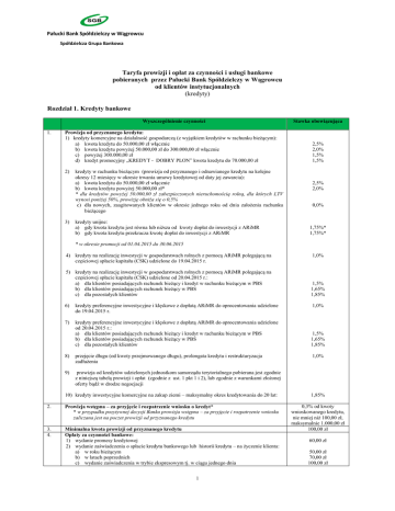 Pałucki Bank Spółdzielczy w Wągrowcu Spółdzielcza Grupa Bankowa Taryfa prowizji i opłat za czynności i usługi bankowe pobieranych przez Pałucki Bank Spółdzielczy w Wągrowcu od klientów instytucjonalnych (kredyty) Rozdział 1. Kredyty bankowe Wyszczególnienie czynności 1. Prowizja od przyznanego kredytu: 1) kredyty komercyjne na działalność gospodarczą (z wyjątkiem kredytów w rachunku bieżącym): a) kwota kredytu do 50.000,00 zł włącznie b) kwota kredytu powyżej 50.000,00 zł do 300.000,00 zł włącznie c) powyżej 300.000,00 zł d) kredyt promocyjny „KREDYT - DOBRY PLON” kwota kredytu do 70.000,00 zł 2) 3) kredyty w rachunku bieżącym (prowizja od przyznanego i odnawianego kredytu na kolejne okresy 12 miesięcy w okresie trwania umowy kredytowej od daty jej zawarcia): a) kwota kredytu do 50.000,00 zł włącznie b) kwota kredytu powyżej 50.000,00 zł* * dla kredytów powyżej 50.000,00 zł zabezpieczonych nieruchomością rolną, dla których LTV wynosi poniżej 50%, prowizję obniża się o 0,5% c) dla nowych, zaagitowanych klientów w okresie jednego roku od dnia założenia rachunku bieżącego kredyty unijne: a) gdy kwota kredytu jest równa lub niższa od kwoty dopłat do inwestycji z ARiMR b) gdy kwota kredytu przekracza kwotę dopłat do inwestycji z ARiMR Stawka obowiązująca 2,5% 2,0% 1,5% 1,5% 2,5% 2,0% 0,0% 1,75%* 1,75%* * w okresie promocji od 01.04.2015 do 30.06.2015 4) kredyty na realizację inwestycji w gospodarstwach rolnych z pomocą ARiMR polegającą na częściowej spłacie kapitału (CSK) udzielone do 19.04.2015 r. 5) kredyty na realizację inwestycji w gospodarstwach rolnych z pomocą ARiMR polegającą na częściowej spłacie kapitału (CSK) udzielone od 20.04.2015 r.: a) dla klientów posiadających rachunek bieżący i kredyt w rachunku bieżącym w PBS b) dla klientów posiadających rachunek bieżący w PBS c) dla pozostałych klientów 6) kredyty preferencyjne inwestycyjne i klęskowe z dopłatą ARiMR do oprocentowania udzielone do 19.04.2015 r. 7) kredyty preferencyjne inwestycyjne i klęskowe z dopłatą ARiMR do oprocentowania udzielone od 20.04.2015 r.: a) dla klientów posiadających rachunek bieżący i kredyt w rachunku bieżącym w PBS b) dla klientów posiadających rachunek bieżący w PBS c) dla pozostałych klientów 8) przejęcie długu (od kwoty przejmowanego długu), prolongata kredytu i restrukturyzacja zadłużenia 9) prowizja od kredytów udzielonych jednostkom samorządu terytorialnego pobierana jest zgodnie z niniejszą tabelą prowizji i opłat (zgodnie z ust. 1 pkt 1 i 2), lub zgodnie z warunkami złożonej oferty bądź w drodze negocjacji 1,0% 1,5% 1,65% 1,85% 1,0% 1,5% 1,65% 1,85% 1,0% 10) kredyty inwestycyjne komercyjne na zakup ziemi – maksymalny okres kredytowania do 20 lat: 1,85% 2. Prowizja wstępna – za przyjęcie i rozpatrzenie wniosku o kredyt* * w przypadku pozytywnej decyzji Banku prowizja wstępna – za przyjęcie i rozpatrzenie wniosku zaliczana jest na poczet prowizji od przyznanego kredytu 3. 4. Minimalna kwota prowizji od przyznanego kredytu Opłaty za czynności bankowe: 1) wydanie promesy kredytowej 2) wydanie zaświadczenia o spłacie kredytu bankowego lub historii kredytu – na życzenie klienta: a) w roku bieżącym b) w latach poprzednich c) wydanie zaświadczenia w trybie ekspresowym tj. w ciągu jednego dnia 0,3% od kwoty wnioskowanego kredytu, nie mniej niż 100,00 zł, maksymalnie 1.000,00 zł 100,00 zł 1 60,00 zł 50,00 zł 70,00 zł 100,00 zł 3) sporządzenie aneksu do umowy o kredyt (nie dotyczy odnowień kredytu w RB oraz aneksów sporządzanych z inicjatywy banku) 4) sporządzenie umowy przewłaszczenia: a) pojazdów rejestrowanych b) pozostałych ruchomości 5) udzielenie Bankowi Zachodniemu WBK S.A. i BGŻ S.A. informacji wynikającej z art. 105 ust.1 pkt 1 Prawo bankowe 6) wysyłanie wezwania do zapłaty kredytu lub innej należności banku (za każde wezwanie) 7) wydanie na życzenie klienta duplikatu umowy 8) wydanie zaświadczenia o różnym charakterze 9) wydanie zaświadczenia do sądu o przyznanym kredycie w celu obciążenia działu IV księgi wieczystej i za wydanie zezwolenia na wykreślenie obciążenia z księgi wieczystej 10) wydanie pisma o przerejestrowanie na dotychczasowego użytkownika przewłaszczonego przez bank pojazdu rejestrowanego 11) rozpatrzenie wniosku o wyrażenie zgody na bezciężarowe odłączenie działki, będącej zabezpieczeniem kredytu 12) sporządzenie umowy poręczenia 13) sporządzenie wydruku historii operacji na rachunku kredytowym za każdy rok 14) sporządzenie umowy o przelew wierzytelności 15) sporządzenie wydruku harmonogramu kredytowego na życzenie klienta 16) wydanie klientowi duplikatu zaświadczenia lub innego rodzaju pisma 17) sporządzenie wyjaśnień dotyczących dokonanej przez bank oceny zdolności kredytowej 18) opłata za dokonanie analizy ekonomiczno-finansowej i wydanie zaświadczenia dotyczącego zdolności kredytowej: a) do kwoty 100.000,00 zł b) powyżej kwoty 100.000,00 zł 50,00 zł 50,00 zł 50,00 zł 70,00 zł + aktualnie obowiązująca stawka podatku VAT 20,00 zł 30,00 zł + aktualnie obowiązująca stawka podatku VAT 50,00 zł 30,00 zł bez opłat 80,00 zł bez opłat 30,00 zł 10,00 zł bez opłat 25,00 zł 150,00 zł + aktualnie obowiązująca stawka podatku VAT 200,00 zł + aktualnie obowiązująca stawka podatku VAT 500,00 zł + aktualnie obowiązująca stawka podatku VAT Rozdział 2. Gwarancje i poręczenia bankowe Wyszczególnienie czynności Lp. 1. 2. 3. Stawka obowiązująca Udzielenie gwarancji i poręczenia: 1) udzielenie gwarancji zwrotu zaliczki na rzecz ARiMR - w przypadku ubiegania się beneficjenta o pomoc (zaliczkę) PROW na lata 2007-2013: a) prowizja od kwoty gwarancji za pierwszy rok obowiązywania gwarancji b) prowizja od kwoty gwarancji za każdy następny rok obowiązywania gwarancji 2) udzielenie pozostałych gwarancji i poręczeń: a) prowizja od kwoty gwarancji z