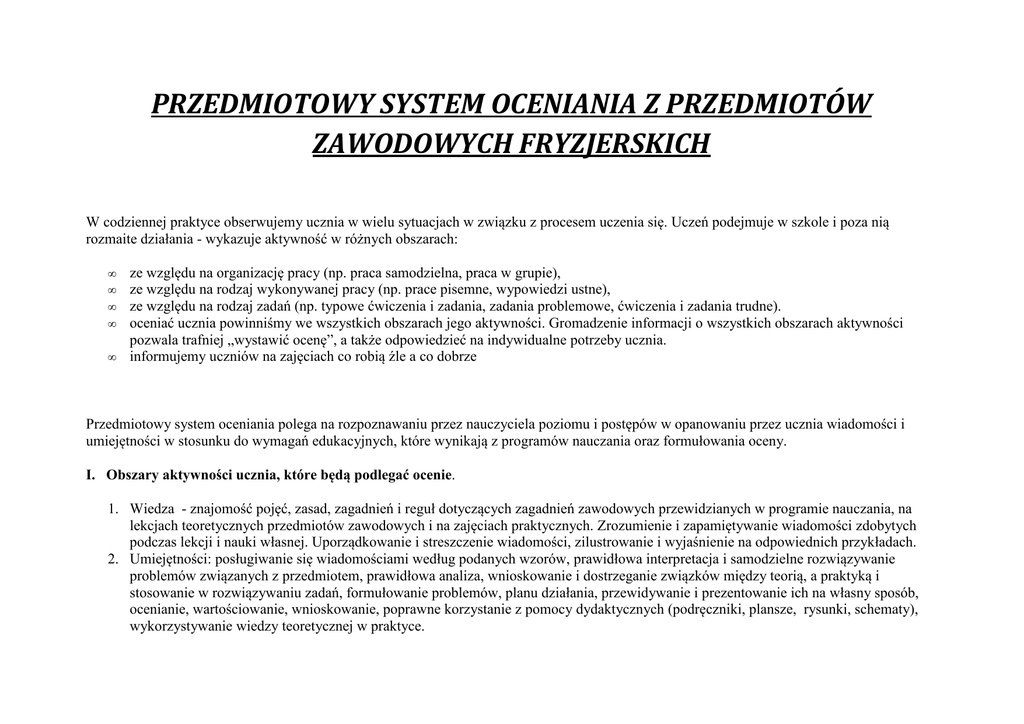PRZEDMIOTOWY SYSTEM OCENIANIA Z PRZEDMIOTÓW ZAWODOWYCH FRYZJERSKICH W codziennej praktyce obserwujemy ucznia w wielu sytuacjach w związku z procesem uczenia się. Uczeń podejmuje w szkole i poza nią rozmaite działania - wykazuje aktywność w różnych obszarach: • • • • • ze względu na organizację pracy (np. praca samodzielna, praca w grupie), ze względu na rodzaj wykonywanej pracy (np. prace pisemne, wypowiedzi ustne), ze względu na rodzaj zadań (np. typowe ćwiczenia i zadania, zadania problemowe, ćwiczenia i zadania trudne). oceniać ucznia powinniśmy we wszystkich obszarach jego aktywności. Gromadzenie informacji o wszystkich obszarach aktywności pozwala trafniej „wystawić ocenę”, a także odpowiedzieć na indywidualne potrzeby ucznia. informujemy uczniów na zajęciach co robią źle a co dobrze Przedmiotowy system oceniania polega na rozpoznawaniu przez nauczyciela poziomu i postępów w opanowaniu przez ucznia wiadomości i umiejętności w stosunku do wymagań edukacyjnych, które wynikają z programów nauczania oraz formułowania oceny. I. Obszary aktywności ucznia, które będą podlegać ocenie. 1. Wiedza - znajomość pojęć, zasad, zagadnień i reguł dotyczących zagadnień zawodowych przewidzianych w programie nauczania, na lekcjach teoretycznych przedmiotów zawodowych i na zajęciach praktycznych. Zrozumienie i zapamiętywanie wiadomości zdobytych podczas lekcji i nauki własnej. Uporządkowanie i streszczenie wiadomości, zilustrowanie i wyjaśnienie na odpowiednich przykładach. 2. Umiejętności: posługiwanie się wiadomościami według podanych wzorów, prawidłowa interpretacja i samodzielne rozwiązywanie problemów związanych z przedmiotem, prawidłowa analiza, wnioskowanie i dostrzeganie związków między teorią, a praktyką i stosowanie w rozwiązywaniu zadań, formułowanie problemów, planu działania, przewidywanie i prezentowanie ich na własny sposób, ocenianie, wartościowanie, wnioskowanie, poprawne korzystanie z pomocy dydaktycznych (podręczniki, plansze, rysunki, schematy), wykorzystywanie wiedzy teoretycznej w praktyce. 3. Postawy - samodzielność i aktywność na lekcji, pozytywne nastawienie i zainteresowanie przedmiotem, praca w zespole, obecność i przygotowanie do lekcji, prowadzenie zeszytu i wykonywanie zadań , samodzielność, zaangażowanie i dociekliwość poznawcza, kształcenie kreatywnej postawy wobec problemu, umiejętność samooceny, planowania i organizowania własnej nauki, przyjmowania za nią odpowiedzialności, dokładności, rzetelności, systematyczności, wiary we własne siły. II. Założenia ogólne przedmiotowego systemu oceniania. 1. Przedmiotowy system oceniania ma na celu : 1. poinformowanie ucznia o poziomie jego osiągnięć edukacyjnych i postępach w nauce 2. pomoc uczniowi w samodzielnym planowaniu swojego rozwoju 3. motywowaniu ucznia do dalszej pracy 4. dostarczaniu nauczycielowi, rodzicom (opiekunom) informacji o postępach, trudnościach, uzdolnieniach ucznia 5. umożliwia nauczycielowi doskonalenia organizacji i metod pracy dydaktyczno – wychowawczej 6. uświadomienie uczniom braków w zakresie wiedzy oraz wdrażanie do samokontroli. 7. Informowanie uczniów co robią źle a co dobrze 2. Ocenianie przedmiotowe obejmuje: 1. formułowanie przez nauczycieli wymagań edukacyjnych oraz informowanie o nich uczniów i rodziców 2. formułowanie trybu oceniania 3. bieżące, śródroczne, końcowe ocenianie i klasyfikowanie według skali i w formie przyjętej w szkole jak również warunki poprawiania 4. przeprowadzanie egzaminów klasyfikacyjnych. 3. Ocenianie pełni funkcję: 1. diagnostyczną (monitorowanie postępów ucznia i określanie jego potrzeb indywidualnych) 2. klasyfikacyjną ( różnicuje i uporządkowuje uczniów zgodnie z pewną skalą i za pomocą umownego znaku). III. Sposoby sprawdzania osiągnięć i postępów ucznia: 1. Kryteria oceny ucznia a) obowiązująca skala ocen: • celujący – 6 - cel • • • • • bardzo dobry – 5 - bdb dobry – 4 – db dostateczny – 3 - dost dopuszczający – 2 - dop niedostateczny – 1 – ndst b) ocenie podlegają: • • • • • krótkie prace kontrolne (mogą być nie zapowiedziane) z 2-3 ostatnich tematów prace kontrolne (zapowiedziane, ustalone zgodnie z WSO – nie mniej w ciągu roku szkolnego, niż liczba godzin w tygodniu z danego przedmiotu) wyznaczone prace domowe, samodzielna praca ucznia w czasie lekcji, brak zeszytu przedmiotowego (ocena na koniec semestru) Metody i formy oceniania 1. ustne: odpowiedź ustna, dyskusja, rozmowa, zdefiniowanie 2. pisemne: sprawdzian zapowiedziany z określonego materiału, kartkówka lub test nie zapowiedziany z ostatniej 1 - 2 lekcji, praca pisemna lub test sprawdzający z działu programowego, praca domowa 3. ćwiczenia praktyczne 4. prace samodzielne uczniów 5. prace w grupach 6. aktywność i zaangażowanie na lekcjach 7. prace nieobowiązkowe, nadprogramowe Ogólne kryteria oceniania 1.Uczeń oceniany jest za swoje osiągnięcia w nauce ( wiedza i umiejętności) oraz postawy ( aktywność i kreatywność). 2.Zaplanowane przez nauczyciela formy sprawdzające są obowiązkowe 3. Uczeń ma obowiązek prowadzić zeszyt przedmiotowy 4.Każdy dział programowy kończy się pracą pisemną lub testem zapowiedzianym 7 dni przed terminem sprawdzianu 5. Uczeń ma prawo przystąpić do sprawdzianu powtórnie ( pisemnie lub ustnie) tylko raz wciągu dwóch tygodni od daty zapoznania się z oceną (w terminie ustalonym przez nauczyciela) 6. Kartkówki i testy obejmujące materiał z trzech ostatnich lekcji nie muszą być zapowiadane i nie podlegają poprawie pisemnej 7. Uczeń nieobecny na sprawdzianie ma obowiązek w ciągu 2 tygodniu poddać się takiemu sprawdzianowi po uzgodnieniu z nauczycielem terminu i formy. 8.Uczeń ma prawo do poprawy oceny ze sprawdzianu w ciągu 14 dni od daty zapoznania ucznia z oceną po uzgodnieniu z nauczycielem. 9. Termin oddani