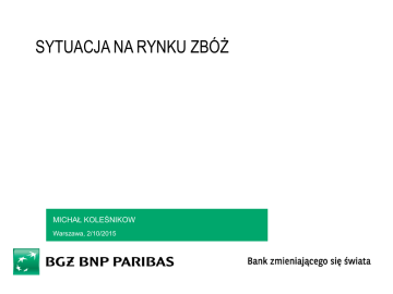 SYTUACJA NA RYNKU ZBÓŻ MICHAŁ KOLEŚNIKOW Warszawa, 2/10/2015 Sytuacja na rynku globalnym Światowe ceny zbóż na poziomie znacznie niższym niż przed rokiem Indeks cen żywności FAO (2002-04 = 100) 300 Zboża Żywność ogółem 280 280 260 240 240 220 200 200 180 160 160 140 120 120 100 80 80 2006 2007 2008 2009 2010 2011 2012 2013 2014 2015 Źródło: FAO (IX 2015) Gdyby nie umacniał się USD, światowe ceny surowców rolnych spadałyby w znacznie mniejszym stopniu Indeks cen żywności FAO - oryginalny i pozbawiony wpływu zmian USD (2002-04=100) oryginalny indeks cen żywności FAO oczyszczony z wpływu zmian kursu USD 240 220 200 180 160 140 120 100 80 2006 2007 2008 2009 2010 2011 2012 2013 2014 2015 Źródło: FAO, Federal Reserve Bank of St. Louis (IX 2015), obliczenia i opracowanie BGŻ Osłabiające się euro hamowało spadki cen surowców rolnych w UE Kurs EUR/USD 1,60 1,55 1,50 1,45 1,40 1,35 1,30 1,25 1,20 1,15 1,10 1,05 2004 2005 2006 2007 2008 2009 2010 2011 2012 2013 2014 2015 Źródło: FAO, Federal Reserve Bank of St. Louis (IX 2015), obliczenia i opracowanie BGŻ Notowane w bieżącym roku spadki cen ropy są ważnym czynnikiem działającym w kierunku niższych cen surowców rolnych Ceny ropy naftowej (USD/baryłkę) i zbóż (indeks cen FAO) Zboża Ropa 140 280 120 250 100 220 80 190 60 160 Ropa Zboża 40 130 Prognoza 20 100 0 70 2006 2008 2010 2012 2014 2016 Źródło: FAO (IX 2015), Bank Światowy (IX 2015) MRZ przewiduje spadek światowej produkcji zbóż w sezonie 2015/16 o około 1% Światowa produkcja zbóż wg MRZ (mln t) 2 017 2 000 1 996 1 900 1 800 1 700 1 600 2007/08 2009/10 2011/12 2013/14 2015/16 Źródło: BGŻ BNP Paribas Międzynarodowa Rada Zbożowa (24.09) Wg MRZ sezon 2015/16 będzie trzecim z rzędu sezonem nadwyżkowym na rynku zbóż... Światowy bilans zbóż wg MRZ (mln t; bez ryżu) Nadwyżka (prawa oś) Produkcja Zapasy początkowe: 445 mln t (+38 mln t) [+9% r/r]. Szacowana produkcja w sezonie 2015/16: 1996 mln t (-21 mln t) [-1,0% r/r]. Wcześniej prognozowano spadek o ponad 40 mln t. Prognozowane zużycie: 1986 mln t (+7 mln t) [+0,4% r/r]. Wskaźnik zapasy końcowe do zużycia prognozowany na 22,9% wobec 22,5% w sezonie 2014/15 i 21,0% w 2013/14. Zużycie 2 000 160 1 900 120 1 800 80 1 700 38,4 40 10,2 1 600 0 1 500 -40 Źródło: BGŻ BNP Paribas, Międzynarodowa Rada Zbożowa (24.09.2015) Wg MRZ światowa produkcja pszenicy ma zwiększyć się o 0,9%... Światowa produkcja pszenicy wg MRZ (mln t) 800 750 720 727 700 650 600 550 500 2007/08 2009/10 2011/12 2013/14 2015/16 Źródło: BGŻ BNP Paribas, Międzynarodowa Rada Zbożowa (24.09.2015) … a wcześniej powszechnie uważano, że zbiory będą niższe Prognozy na sezon 2015/16 (pszenica) Tallage (SG) MRZ USDA FAO (2015)(2015) Tallage (SG) MRZ USDA FAO (2015)(205) 701 mln t ( -7 mln t; -1,0% r/r) (16.04) 705 mln t (-16 mln t; -2,2% r/r) (23.04) 719 mln t ( -8 mln t; -1,0% r/r) (12.05) 722 mln t ( -5 mln t; -0,7% r/r) (2.04) 711 mln t ( -1 mln t; -0,2% r/r) 727 mln t ( +7 mln t; +0,9% r/r) 732 mln t ( +6 mln t; +0,9% r/r) 728 mln t ( -5 mln t; -0,6% r/r) (13.08) (24.09) (11.09) (10.09) Źródło: BGŻ BNP Paribas na podstawie danych Tallage, USDA, MRZ, FAO. Kierunek strzałki oznacza zmianę prognozy w stosunku do poprzedniego miesiąca. Globalny bilans pszenicy ma być nadwyżkowy Szacunek MRZ za (mln t) 2013/14 Prognoza MRZ na 2015/16 2014/15 24.09 Zmiana r/r Produkcja 714 720 727 +7 Zużycie 696 707 719 +12 Zapasy końcowe 188 202 211 +9 - w tym u głównych eksporterów 55 65 71 +6 Współczynnik zapasy/zużycie (%) 27,1 28,6 29,3 - Źródło: BGŻ BNP Paribas, Międzynarodowa Rada Zbożowa (24.09.2015) Tradycyjni importerzy zbiorą więcej pszenicy Prognozowane zmiany zbiorów pszenicy w sezonie 2015/16 (mln t; r/r) Azja Pd i Wsch -5 Ameryka Pd -2 Europa -1 Ameryka Pn 0 Oceania 2 WNP 2 Bliski Wschód 5 Afryka 5 -8 -6 -4 -2 0 2 4 6 Źródło: Międzynarodowa Rada Zbożowa (24.09.2015), obliczenia i opracowanie BGŻ BNP Paribas Z kolei produkcja kukurydzy ma zmniejszyć się o 3,8% Światowa produkcja kukurydzy wg MRZ (mln t) 1 005 1 000 967 950 900 850 800 750 700 2011/12 2013/14 2015/16 Źródło: BGŻ BNP Paribas Międzynarodowa Rada Zbożowa (24.09.2015) Wiosną i latem pojawiały się coraz wyższe prognozy światowych zbiorów kukurydzy Prognozy światowej produkcji kukurydzy w sezonie 2015/16 wg MRZ (mln t) 970 968 967 27.08 24.09 965 960 955 951 950 945 940 23.04 28.05 25.06 30.07 Źródło: BGŻ BNP Paribas Międzynarodowa Rada Zbożowa Globalny bilans kukurydzy ma być deficytowy Szacunek MRZ za (mln t) 2013/14 Prognoza MRZ na 2015/16 2014/15 24.09 Zmiana r/r Produkcja 997 1005 967 -38 Zużycie 950 980 970 -10 Zapasy końcowe 178 203 199 -4 - w tym u głównych eksporterów 51 65 58 -7 Współczynnik zapasy/zużycie (%) 18,7 20,7 20,5 - Zużycie ma przewyższać produkcję o prawie 4 mln t (17 mln t w prognozie kwietniowej), a zapasy początkowe mają być o 24 mln t (249 mln t) wyższe niż w sezonie 2014/15. Źródło: BGŻ BNP Paribas, Międzynarodowa Rada Zbożowa (24.09.2015) Duże bezwzględne spadki produkcji kukurydzy oczekiwane w przypadku Stanów Zjednoczonych i UE Prognozowane zmiany zbiorów kukurydzy w sezonie 2015/16 (mln t; r/r) -21 Stany Zjednoczone UE W UE spadek o 24%. W ubiegłym roku rekordowa produkcja 76 mln t (wzrost o 12 mln t wobec 2013 r.) W Stanach Zjednoczonych również spadek z rekordowego poziomu. Na Ukrainie drugi rok z rzędu spadków, łącznie o 6 mln t wobec rekordowego roku 2013. -18 Brazylia -7 Argentyna -4 Ukraina -4 Meksyk -1 Indie 0 Kanada 1 RPA 3 Chiny 11 -25 -20 -15 -10 -5 0 5 10 15 Źródło: Międzynarodowa Rada Zbożowa (26.03.2015), obliczenia i opracowanie BGŻ W obecnym sezonie bilans kukurydzy będzie bardziej napięty, a bilans pszenicy wyraźnie bardziej „luźny” Wskaźnik zapasy/zużycie dla światowego rynku zbóż wg USDA (%) 35 31,7 35 30,1 30 30 28,0 23,8 23,9 25 25 22,1 20 20 15 15 3 zboża razem pszen
