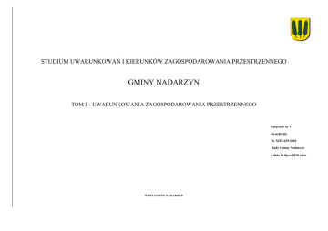STUDIUM UWARUNKOWAŃ I KIERUNKÓW ZAGOSPODAROWANIA PRZESTRZENNEGO GMINY NADARZYN TOM I – UWARUNKOWANIA ZAGOSPODAROWANIA PRZESTRZENNEGO Załącznik nr 1 do uchwały Nr XIIX/439/2010 Rady Gminy Nadarzyn z dnia 16 lipca 2010 roku WÓJT GMINY NADARZYN Studium uwarunkowań i kierunków zagospodarowania przestrzennego gminy Nadarzyn. Tom I – Uwarunkowania zagospodarowania przestrzennego Spis treści I. WSTĘP ............................................................................................................................................................ 3 I.1. Podstawa prawna sporządzania Studium ............................................................................................................ 3 I.2. Cel opracowania .................................................................................................................................................. 3 I.3. Zakres i forma opracowania ................................................................................................................................ 3 I.4. Materiały wyjściowe ........................................................................................................................................... 3 II. UWARUNKOWANIA ZAGOSPODAROWANIA PRZESTRZENNEGO GMINY ............................... 4 II.1. Ogólna charakterystyka gminy .......................................................................................................................... 4 II.6.4.Obszary i obiekty prawnie chronione ...................................................................................................... 18 II.6.5. Podsumowanie funkcjonowania środowiska .......................................................................................... 19 II.7. Stan dziedzictwa kulturowego i zabytków oraz dóbr kultury współczesnej .................................................... 20 II.7.1. Historia gminy ........................................................................................................................................ 20 II.7.2. Archeologia - obiekty archeologiczne .................................................................................................... 21 II.7.3.Ochrona prawna dziedzictwa kulturowego ............................................................................................. 21 II.7.4.Diagnoza uwarunkowań wynikających z ochrony dziedzictwa kulturowego ......................................... 22 II.8. Uwarunkowania społeczne ............................................................................................................................... 22 II.8.1.Demografia .............................................................................................................................................. 22 II.2. Uwarunkowania zewnętrzne rozwoju gminy ..................................................................................................... 4 II.8.2.Warunki i jakość życia mieszkańców ...................................................................................................... 24 II.3. Dotychczasowe zagospodarowanie i przeznaczenie terenu gminy .................................................................... 5 II.4. Stan ładu przestrzennego i wymogi jego ochrony ............................................................................................. 9 II.8.2.1.Rynek pracy i bezrobocie ................................................................................................................. 24 II.5. Stan prawny gruntów ......................................................................................................................................... 9 II.8.2.3.Kultura .............................................................................................................................................. 27 II.6. Stan i funkcjonowanie środowiska .................................................................................................................. 10 II.8.2.4.Ochrona zdrowia i opieka społeczna ................................................................................................ 27 II.6.1. Położenie gminy. Powiązania przyrodnicze z otoczeniem .................................................................... 10 II.6.2.Charakterystyka stanu środowiska .......................................................................................................... 10 II.6.2.1. Budowa geologiczna ....................................................................................................................... 10 II.6.2.2.Rzeźba terenu ................................................................................................................................... 10 II.8.2.2.Oświata ............................................................................................................................................. 27 II.8.2.5.Sport i rekreacja................................................................................................................................ 27 II.8.2.6.Mieszkalnictwo................................................................................................................................. 27 II.8.2.7.Bezpieczeństwo ludności i jej mienia............................................................................................... 28 II.9.Uwarunkowania gospodarcze............................................................................................................................ 28 II.6.2.3.Warunki geotechniczne .................................................................................................................... 10 II.9.1. Lokalna gospodarka................................................................................................................................ 28 II.6.2.4.Wody podziemne .........................................................................................................