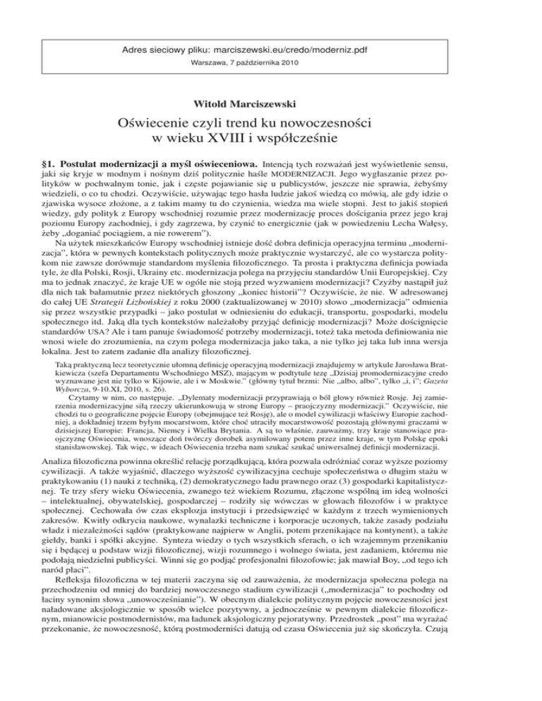 Adres sieciowy pliku: marciszewski.eu/credo/moderniz.pdf Warszawa, 7 października 2010 Witold Marciszewski Oświecenie czyli trend ku nowoczesności w wieku XVIII i współcześnie §1. Postulat modernizacji a myśl oświeceniowa. Intencja˛ tych rozważań jest wyświetlenie sensu, jaki si˛e kryje w modnym i nośnym dziś politycznie haśle MODERNIZACJI. Jego wygłaszanie przez polityków w pochwalnym tonie, jak i cz˛este pojawianie si˛e u publicystów, jeszcze nie sprawia, żebyśmy ˛ tego hasła ludzie jakoś wiedza˛ co mówia,˛ ale gdy idzie o wiedzieli, o co tu chodzi. Oczywiście, używajac zjawiska wysoce złożone, a z takim mamy tu do czynienia, wiedza ma wiele stopni. Jest to jakiś stopień wiedzy, gdy polityk z Europy wschodniej rozumie przez modernizacj˛e proces dościgania przez jego kraj poziomu Europy zachodniej, i gdy zagrzewa, by czynić to energicznie (jak w powiedzeniu Lecha Wał˛esy, żeby „doganiać pociagiem, ˛ a nie rowerem”). Na użytek mieszkańców Europy wschodniej istnieje dość dobra definicja operacyjna terminu „modernizacja”, która w pewnych kontekstach politycznych może praktycznie wystarczyć, ale co wystarcza politykom nie zawsze dorównuje standardom myślenia filozoficznego. Ta prosta i praktyczna definicja powiada tyle, że dla Polski, Rosji, Ukrainy etc. modernizacja polega na przyj˛eciu standardów Unii Europejskiej. Czy ma to jednak znaczyć, że kraje UE w ogóle nie stoja˛ przed wyzwaniem modernizacji? Czyżby nastapił ˛ już dla nich tak bałamutnie przez niektórych głoszony „koniec historii”? Oczywiście, że nie. W adresowanej do całej UE Strategii Lizbońskiej z roku 2000 (zaktualizowanej w 2010) słowo „modernizacja” odmienia si˛e przez wszystkie przypadki – jako postulat w odniesieniu do edukacji, transportu, gospodarki, modelu społecznego itd. Jaka˛ dla tych kontekstów należałoby przyjać ˛ definicj˛e modernizacji? Może dościgni˛ecie standardów USA? Ale i tam panuje świadomość potrzeby modernizacji, toteż taka metoda definiowania nie wnosi wiele do zrozumienia, na czym polega modernizacja jako taka, a nie tylko jej taka lub inna wersja lokalna. Jest to zatem zadanie dla analizy filozoficznej. Taka˛ praktyczna˛ lecz teoretycznie ułomna˛ definicj˛e operacyjna˛ modernizacji znajdujemy w artykule Jarosława Bratkiewicza (szefa Departamentu Wschodniego MSZ), majacym ˛ w podtytule tez˛e „Dzisiaj promodernizacyjne credo wyznawane jest nie tylko w Kijowie, ale i w Moskwie.” (główny tytuł brzmi: Nie „albo, albo”, tylko „i, i”; Gazeta Wyborcza, 9-10.XI, 2010, s. 26). Czytamy w nim, co nast˛epuje. „Dylematy modernizacji przyprawiaja˛ o ból głowy również Rosj˛e. Jej zamierzenia modernizacyjne siła˛ rzeczy ukierunkowuja˛ w stron˛e Europy – praojczyzny modernizacji.” Oczywiście, nie chodzi tu o geograficzne poj˛ecie Europy (obejmujace ˛ też Rosj˛e), ale o model cywilizacji właściwy Europie zachodniej, a dokładniej trzem byłym mocarstwom, które choć utraciły mocarstwowość pozostaja˛ głównymi graczami w dzisiejszej Europie: Francja, Niemcy i Wielka Brytania. A sa˛ to właśnie, zauważmy, trzy kraje stanowiace ˛ praojczyzn˛e Oświecenia, wnoszace ˛ doń twórczy dorobek asymilowany potem przez inne kraje, w tym Polsk˛e epoki stanisławowskej. Tak wi˛ec, w ideach Oświecenia trzeba nam szukać szukać uniwersalnej definicji modernizacji. Analiza filozoficzna powinna określić relacj˛e porzadkuj ˛ ac ˛ a,˛ która pozwala odróżniać coraz wyższe poziomy cywilizacji. A także wyjaśnić, dlaczego wyższość cywilizacyjna cechuje społeczeństwa o długim stażu w praktykowaniu (1) nauki z technika,˛ (2) demokratycznego ładu prawnego oraz (3) gospodarki kapitalistycznej. Te trzy sfery wieku Oświecenia, zwanego też wiekiem Rozumu, złaczone ˛ wspólna˛ im idea˛ wolności – intelektualnej, obywatelskiej, gospodarczej – rodziły si˛e wówczas w głowach filozofów i w praktyce społecznej. Cechowała ów czas eksplozja instytucji i przedsi˛ewzi˛eć w każdym z trzech wymienionych zakresów. Kwitły odkrycia naukowe, wynalazki techniczne i korporacje uczonych, także zasady podziału władz i niezależności sadów ˛ (praktykowane najpierw w Anglii, potem przenikajace ˛ na kontynent), a także giełdy, banki i spółki akcyjne. Synteza wiedzy o tych wszystkich sferach, o ich wzajemnym przenikaniu si˛e i b˛edacej ˛ u podstaw wizji filozoficznej, wizji rozumnego i wolnego świata, jest zadaniem, któremu nie podołaja˛ niedzielni publicyści. Winni si˛e go podjać ˛ profesjonalni filozofowie; jak mawiał Boy, „od tego ich naród płaci”. Refleksja filozoficzna w tej materii zaczyna si˛e od zauważenia, że modernizacja społeczna polega na przechodzeniu od mniej do bardziej nowoczesnego stadium cywilizacji („modernizacja” to pochodny od łaciny synonim słowa „unowocześnianie”). W obecnym dialekcie politycznym poj˛ecie nowoczesności jest naładowane aksjologicznie w sposób wielce pozytywny, a jednocześnie w pewnym dialekcie filozoficznym, mianowicie postmodernistów, ma ładunek aksjologiczny pejoratywny. Przedrostek „post” ma wyrażać przekonanie, że nowoczesność, która˛ postmoderniści datuja˛ od czasu Oświecenia już si˛e skończyła. Czuja˛ 2 Witold Marciszewski: Oświecenie czyli trend ku nowoczesności w wieku XVIII i współcześnie si˛e oni heroldami nast˛epnej i lepszej epoki, która zrywa z przesadem, ˛ że jedne rozwiazania ˛ cywilizacyjne sa˛ obiektywnie lepsze, inne gorsze, i że te lepsze sa˛ dziełem ludzkiego rozumu. Co do tego, że nowoczesność zaczyna si˛e od Oświecenia, to jest (z grubsza biorac) ˛ gdzieś od poczatków ˛ 18-go wieku, postmodernizm ma pełna˛ racj˛e. Wydobycie tego faktu jest punktem wyjścia w rozważaniach ˛ dlań potwierdzenie we wszechstronnej analizie nad modernizacja.˛ Ten właśnie punkt przyjmuj˛e, majac procesów prowadzacych 