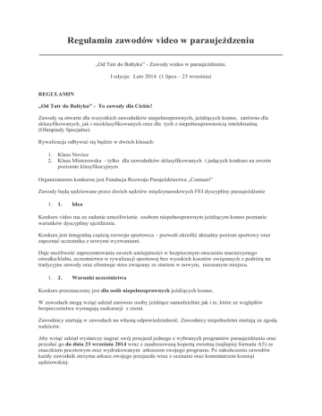 Regulamin zawodów video w paraujeżdzeniu __________________________________________________ „Od Tatr do Bałtyku” - Zawody wideo w paraujeżdżeniu. I edycja: Lato 2014 (1 lipca – 23 września) REGULAMIN „Od Tatr do Bałtyku” - To zawody dla Ciebie! Zawody są otwarte dla wszystkich zawodników niepełnosprawnych, jeżdżących konno, zarówno dla sklasyfikowanych, jak i niesklasyfikowanych oraz dla tych z niepełnosprawnością intelektualną (Olimpiady Specjalne) Rywalizacja odbywać się będzie w dwóch klasach: 1. Klasa Novice 2. Klasa Mistrzowska - tylko dla zawodników sklasyfikowanych i jadących konkurs na swoim poziomie klasyfikacyjnym Organizatorem konkursu jest Fundacja Rozwoju Parajeździectwa „Centauri” Zawody będą sędziowane przez dwóch sędziów międzynarodowych FEI dyscypliny paraujeżdżenie 1. 1. Idea Konkurs video ma za zadanie umożliwienie osobom niepełnosprawnym jeżdżącym konno poznanie warunków dyscypliny ujeżdżenia. Konkurs jest integralną częścią rozwoju sportowca – pozwoli określić aktualny poziom sportowy oraz zapoznać uczestnika z nowymi wyzwaniami. Daje możliwość zaprezentowania swoich umiejętności w bezpiecznym otoczeniu macierzystego ośrodka/klubu, uczestnictwa w rywalizacji sportowej bez wysokich kosztów związanych z podróżą na tradycyjne zawody oraz eliminuje stres związany ze startem w nowym, nieznanym miejscu. 1. 2. Warunki uczestnictwa Konkurs przeznaczony jest dla osób niepełnosprawnych jeżdżących konno. W zawodach mogą wziąć udział zarówno osoby jeżdżące samodzielnie jak i te, które ze względów bezpieczeństwa wymagają asekuracji z ziemi. Zawodnicy startują w zawodach na własną odpowiedzialność. Zawodnicy niepełnoletni startują za zgodą rodziców. Aby wziąć udział wystarczy nagrać swój przejazd jednego z wybranych programów paraujeżdżenia oraz przesłać go do dnia 23 września 2014 wraz z zaadresowaną kopertą zwrotną (najlepiej formatu A5) ze znaczkiem pocztowym oraz wydrukowanym arkuszem swojego programu. Po zakończeniu zawodów każdy zawodnik otrzyma arkusz swojego przejazdu wraz z ocenami oraz komentarzem komisji sędziowskiej. Do nagrania należy dołączyć wypełniony i podpisany formularz uczestnictwa w zawodach. Przejazdy bez dołączonego formularza nie będą oceniane. Przejazd powinien być nagrany specjalnie na potrzeby naszych zawodów. Nagrania z innych imprez i zawodów nie będą oceniane! W edycji lato 2014 obowiązuje: Międzynarodowy Program Novice 2013 dla poziomu Ia, Ib, II, III i IV – poziom do wyboru przez uczestnika. Programy do pobrania na stronie Fundacji Centauri (www.fundacjacentauri.pl), stronie PZJ (www.pzj.pl) oraz stronie klasyfikatorów para jeździectwa (www.paraklasyfikacja.pl) Nagrania prosimy o przesłanie bezpośrednio do sędziów: Polski Związek Jeździecki Komisja Parajeździectwa (Magdalena Jarmuła), ul Lektykarska 29, 01-687 Warszawa, z dopiskiem: "Zawody video" 1. 3. Ubiór i rząd Jazda w przepisowym nakryciu głowy (kasku) oraz obuwiu jeździeckim jest obowiązkowa. Jeżeli niepełnosprawność uniemożliwia jazdę w obuwiu jeździeckim – należy zastosować strzemiona zamknięte lub tzw. bezpieczne. Zawodnik może startować w dowolnym schludnym stroju jeździeckim . Klasyczny strój ujeżdżeniowy nie jest obowiązkowy ale zalecany ;-) Rząd konia zgodny z przepisami PZJ, nie dopuszcza się ochraniaczy, owijek, kaloszy , wypinaczy itp. Można stosować wyposażenie dodatkowe – modyfikacje wodzy (np. wodze pętelkowe) i siodła zgodnie z przepisami paraujeżdżenia, 1. 4. Warunki techniczne Czworobok konkursowy powinien mieć wymiary 20mx40m. (+/- 1 m). Czworobok nie musi być zamknięty. Jeżeli w danym ośrodku nie ma możliwości ustawienia szranek (płotków) wydzielających czworobok oraz liter – można użyć w tym celu położonych na ziemi drągów. Litery można zastąpić pachołkami lub kostkami słomy. Kamera powinna być umieszczona na wysokości litery C około 5 - 6 m od szranek oraz na wysokości 1,5 2,5 m od powierzchni ziemi. Jeżeli używany jest zoom – koń nie powinien zajmować więcej niż ¼ powierzchni kadru. Kamera powinna być włączona na co najmniej 5 sekund przed wjazdem zawodnika w szranki i być wyłączona co najmniej 5 sekund po końcowym ukłonie. Nagranie nie może zawierać przerw i sytuacji wskazujących na montaż filmu. Nagranie powinno zawierać ścieżkę dźwiękową. Programy mogą być czytane. W trakcie przejazdu nie wolno podpowiadać zawodnikowi z wyjątkiem sytuacji, gdy nastąpiła pomyłka. W przypadku pomyłki zawodnik poprawia dany ruch i kontynuuje przejazd (lub „kasuje” przejazd i nagrywa jeszcze raz od początku ;-) Upewnijcie się, że osoba asekurująca z ziemi nie przesłania widoku zawodnika. 1. 5. Konie Konie nie mogą być młodsze niż 5 lat. Konie mogą być dzielone pomiędzy jeźdźcami, tzn. ten sam koń może wystartować kolejno pod różnymi zawodnikami. Jeżeli zawodnik jest asekurowany z ziemi – osoba asekurująca powinna iść na wysokości łopatki konia, linka asekuracyjna nie powinna być napięta. Asekurujący nie wpływa na konia, a jedynie asystuje i interweniuje tylko w chwili zagrożenia. 1. 6. Wyniki Po zakończeniu zawodów każdy zawodnik otrzyma arkusz swojego przejazdu wraz z ocenami oraz komentarzem komisji sędziowskiej. Nadesłane przejazdy nie będą udostępniane osobom trzecim bez pisemnej zgody zawodnika. Każdy uczestnik zawodów otrzyma pamiątkowe flot. Dla pierwszego zgłoszenia Novice z każdego województwa przygotowana została niespodzianka :-) Wyniki konkursu zostaną opublikowane na stronie internetowej Fundacji Rozwoju Parajeździectwa Centaurii oraz w serwisie społecznościowym Centauri i Parajeździectwo. Powodzenia! Jeśli macie jakieś pytania i wątpliwości czekamy na kontakt pod adresem e-mail: [email protected] [email protected]