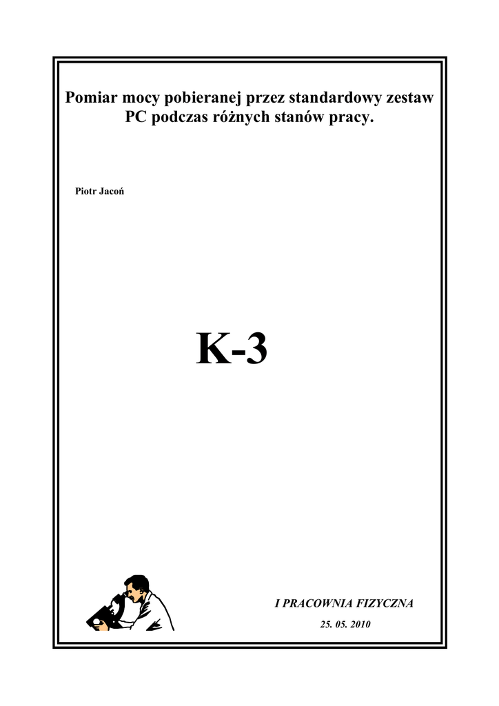 Pomiar mocy pobieranej przez standardowy zestaw PC podczas różnych stanów pracy. Piotr Jacoń K-3 I PRACOWNIA FIZYCZNA 25. 05. 2010 Ćwiczenie K-3 I. Cel ćwiczenia: Zapoznanie się poprzez samodzielny pomiar z wartościami mocy czynnej, pobieranej przez zestaw komputerowy w zależności od stanu pracy. Obliczenie zużywanej energii i jej kosztu. Zapoznanie się (poprzez wnioskowanie na podstawie zebranych w doświadczeniu danych) z metodami oszczędzania energii elektrycznej. II. Przyrządy i materiały: Zestaw komputerowy standardu ATX, płyta połączeniowa, watomierz do pomiaru mocy czynnej o zakresie napięcia do 400V i zakresie prądu do 1A, przewody połączeniowe. III. Literatura: [1] W.Buchanan – „Użytkowanie komputerów” [2] A.Freedman – „Encyklopedia komputerów” [3] J.L.Kacperski – „I Pracownia Fizyczna” Internet: [4] http://pl.wikipedia.org/wiki/ACPI [5] http://windows.microsoft.com/pl-PL/windows-vista/Turnoff-a-computer-frequently-asked-questions [6].http://pl.wikipedia.org/wiki/Wikipedia:Skarbnica_Wikipedii /Przegl%C4%85d_zagadnie%C5%84_z_zakresu_elektryczno %C5%9Bci IV. Wprowadzenie. IV.1. Moc prądu przemiennego. Wyróżniamy 3 rodzaje mocy prądu przemiennego: czynną, bierną i pozorną. Moc czynna charakteryzuje straty energii prądu w elementach czynnych obwodu (na ogrzewanie, wykonanie pracy mechanicznej). Jest ona mierzona w watach [W]. Określa ją wartość średnia mocy chwilowej za okres: P=U*I*cos(φ) (1) gdzie: U – wartość skuteczna napięcia na odbiorniku I – wartość skuteczna prądu płynącego przed odbiornik φ – kąt przesunięcia fazowego pomiędzy napięciem i prądem Ten rodzaj mocy mierzony jest przez watomierze oraz liczniki prądu dla odbiorców indywidualnych (małe moce – rzędu kilku kW). 1 I Pracownia Fizyczna Ćwiczenie K-3 Moc bierna jest związana z elementami indukcyjnymi i pojemnościowymi obwodu elektrycznego. Elementy te okresowo gromadzą energię, a potem oddają ją do źródła, same w ogóle jej nie pochłaniając. Jednostką mocy biernej jest [war]. Moc bierną można określić ze wzoru: Q=U*I*sin(φ) (2) Moc pozorna jest wypadkową mocy czynnej i biernej. Określona jest: S=U*I (3) Jednostką mocy pozornej jest [V*A]. Stosunek mocy czynnej do mocy pozornej nazywa się współczynnikiem mocy: P/S = cosφ (4) Moce czynna, bierna i pozorna są związane ze sobą następującymi zależnościami: oraz (5) IV.2. Koszt zużytej energii elektrycznej. Zużycie energii elektrycznej mierzone jest w kilowatogodzinach (kWh). Urządzeniem do pomiaru zużycia energii elektrycznej jest licznik energii elektrycznej. W ćwiczeniu wykorzystujemy watomierz, który mierzy energię elektryczna czynną. Mnożąc wskazaną wartość mocy czynnej P (w kW) przez czas pobierania tej energii t (w godzinach h) i aktualną cenę 1kWh (kilo wato godzina) uzyskujemy koszt zużytej energii elektrycznej. Koszt=P*t*cena1kWh (6) Dla uproszczenia nie bierzemy pod uwagę dodatkowych kosztów, takich jak opłaty stałe itp. IV.3. Składniki badanego zestawu komputerowego. - jednostka centralna - monitor CRT - monitor LCD - napędy pamięci zewnętrznych (jako elementy dodatkowe): CD, HD-2, HD-3, FD. 2 I Pracownia Fizyczna Ćwiczenie K-3 IV.4. Stany pracy komputera z systemem operacyjnym Microsoft Windows XP. Wyróżniamy według specyfikacji ACPI (ang. Advanced Configuration and Power Interface, zaawansowany interfejs zarządzania konfiguracją i energią) siedem globalnych stanów pracy, w których może znajdować się system komputerowy kompatybilny z ACPI: • • G0, Pracuje (Working). Zarówno system operacyjny, jak i dowolne uruchomione na nim programy działają, a procesor (lub procesory) normalnie wykonuje polecenia. W tym stanie możliwe jest przełączenie procesora oraz urządzeń dodatkowych (napędów optycznych, dysków twardych) wielokrotnie w stan niskiego poboru energii. G1, Uśpiony (Sleeping) dzieli się na dalsze stany, oznaczane od S1 do S4. Czas przełączenia komputera do stanu G0 jest najkrótszy w przypadku S1, względnie krótki dla stanów S2 i S3, najdłuższy w przypadku S4. o S1 to najbardziej "energio żerny" stan uśpienia. Podczas przejścia w ten stan, czyszczone są pamięci podręczne procesora, a procesor przestaje wykonywać polecenia. Zachowany jest dopływ energii do procesora i pamięci, a urządzenia, które nie zgłaszają konieczności utrzymania dopływu energii są wyłączane. Niektóre nowe urządzenia nie obsługują tego stanu, zaś starsze komputery znacznie prawdopodobniej obsługują stan S1 niż S3. o S2 jest stanem głębszego uśpienia niż S1. Przejście w ten stan oznacza odłączenie zasilania od procesora. Nie jest on jednak często stosowany. o Stan S3 w systemie Windows określany jest jako "stan wstrzymania", zaś komputery działające pod kontrolą MacOS X nazywają go "stanem uśpienia". Czasami pojawia się również określenie "wstrzymaj do pamięci" (Suspend to RAM, STR). Oficjalnie specyfikacja ACPI podaje tylko terminy S3 i Sleep. W tym stanie utrzymany jest dopływ prądu do pamięci RAM, choć jest to prawie jedyny podzespół komputera pozostający pod napięciem. Skoro więc stan systemu operacyjnego, jak też uruchomione programy i otwarte dokumenty przechowywane są w pamięci operacyjnej, użytkownik może wrócić do pracy przerwanej przed przejściem komputera w stan S3 dokładnie w tym samym miejscu, gdzie znajdował się przedtem – stan pamięci operacyjnej jest niezmieniony. Specyfikacja oficjalnie stwierdza, że stan S3 jest podobny do S2, jedyna różnica leży w ilości wyłączanych podzespołów systemu. o S4, w systemie Windows określany mianem "hibernacja". MacOS X nazywa ten stan "bezpiecznym uśpieniem", a niektóre źródła podają termin "wstrzymaj do dysku" (Suspend to Disk). Specyfikacja ACPI podaje tylko określenie S4. W tym stanie zawartość pamięci operacyjnej komputera zapisywana jest na twardym dysku, co zachowuje stan system