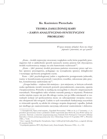 Ks. Kazimierz Pierzchała Teoria zasłużonej kary – zarys analityczno-syntetyczny problemu Wszyscy możemy zbłądzić. Kara ma służyć poprawie i powrotowi, nie zaś zemście1 „Kara – środek represyjny stosowany względem osób, które popełniły przestępstwo lub w jakikolwiek sposób naruszyły normy prawne lub obyczajowe; środek wychowawczy mający na celu hamowanie wykroczeń”2. „Kara – (def. prawna) środek przymusu państwa stosowany przez sąd wobec sprawcy przestępstwa, polegający na wyrządzeniu sprawcy dolegliwości i wyrażający społeczne potępienie czynu. Kara – (def. psychologiczna) jeden z regulatorów postępowania jednostki, ważny w kształtowaniu jej potrzeb i nawyków; wszelkie, odczuwane jako przykre, konsekwencje zachowania się”3. „Grupa ludzka – większa lub mniejsza – jest miejscem, w którym człowiek szuka spełnienia swoich istotnych potrzeb: przynależności, znaczenia, oparcia i bezpieczeństwa. Potrzeby te nasilają się szczególnie w obcych i nieprzyjaznych warunkach. Niewątpliwie takie właśnie warunki panują w więzieniu. Ponieważ osoba więźnia często nie jest dla nikogo ważna, już po kilku miesiącach w warunkach izolacji od społeczeństwa może on odwzajemniać swojemu otoczeniu obojętność lub wrogość. Ludzie w tych warunkach funkcjonują oczywiście w różnoraki sposób, są zdolni do różnego stopnia desperacji i upadku. Jednak już niedługo po zaaresztowaniu zaczynają odczuwać osamotnienie i zlekcewaA. Kremplewski, Papież wśród więźniów, „Tygodnik Powszechny” 1988, nr 16, (z 17 kwietnia), s. 1, 4, przedruk (poszerzonej wersji z podaniem źródeł wypowiedzi Jana Pawła II), [w:] Wokół reformy więziennictwa. Materiały z seminarium zorganizowanego przez Studenckie Koło Penitencjarne Uniwersytetu Mikołaja Kopernika w Toruniu, poświęconego pamięci prof. dra J. Śliwowskiego, Toruń 14-15 grudnia 1987 r., Wrocław 1989, s. 73-85. 2 Kary i nagrody, Encyklopedia Zarządzania, http://mfiles.pl/pl/index.php/Kary_i_nagrody [dostęp 21 września 2014]. 3 Encyklopedia popularna PWN, R.J. Burek (red.), Świat Książki, Warszawa 1998, t. 4, s. 330. 1 50 Ks. Kazimierz Pierzchała żenie pogłębione nielojalnością dotychczasowych przyjaciół i wspólników, zerwaną miłością lub niewiernością małżeńską”4. Dla zobrazowania istoty zagadnienia, zostanie zacytowany drugi akapit najnowszej książki autora: „W historii ludzkości często popełniano czyny niezgodne z prawem i normami ustalanymi przez wspólnotę. Za swoje występki przestępca musiał ponieść karę, a sposobów karania było mnóstwo: od zadań, które osadzony (osoba pozbawiona wolności) musiała wykonać na korzyść swojej społeczności, poprzez różnego rodzaju kary fizyczne, aż po karę izolacji i karę więzienia. Już w starożytności posługiwano się tego typu sankcjami5. Naturalną konsekwencją popełnienia przestępstwa winno być poniesienie kary przez jego sprawcę. Wykonywanie kary pozbawienia wolności jest kosztowne, a zarazem mało skuteczne z punktu widzenia ograniczenia i przeciwdziałania przestępczości6. Wszelkie penitencjarne instytucje izolacyjne w dużym stopniu ograniczają bądź nawet całkowicie uniemożliwiają realizację podstawowych potrzeb człowieka, powstrzymując funkcjonowanie ludzi poddanych pejoratywnej izolacji7. W dzisiejszym, rozwiniętym społecznie świecie dostrzegalna jest chęć poprawy oddziaływania na sprawców czynów zabronionych (inkryminowanych), poprzez odpowiednie zróżnicowanie kary, nie ograniczając się jedynie do kary pozbawienia wolności. W tym wszystkim ważne jest znalezienie właściwej formuły zasłużonej kary, właściwego rozumienia sensu sprawiedliwości karnej. Papież Jan Paweł II powiedział 7 czerwca 1991 r. do więźniów w Płocku m.in.: „Kara pozbawienia wolności już sama w sobie jest wystarczająco uciążliwa i powinno się oszczędzać więźniom takich warunków, które godzą bezpośrednio w ich zdrowie, w ich więzi rodzinne czy poczucie osobistej godności. Więzień, każdy więzień, który odbywa karę za popełnione przestępstwo, nie przestał być przecież człowiekiem, obciążonym, co prawda słabością, zagrożeniem i grzechem, a nawet upartymi nawrotami do niego, ale nie pozbawionym również tej wspanialej możliwości, jaką jest poprawa, powrót do siebie…”8. Według Adama Smitha, choć „(…) natura nawołuje ludzkość do aktów dobroczynnych”, to jednak dla „istnienia społeczności jest (...) mniej istotne czynienie dobra niż sprawiedliwość”. Sprawiedliwość jest „główną kolumną, która podtrzymuje cały gmach. Jeśli się ją usunie, wielka, potężna struktura społeczA.E. Licznerska, Życie w więzieniu, http://pokazywarka.pl/zycie_w_wiezieniu/ [dostęp 10 września 2014]. 5 K. Pierzchała, Kapelan więzienny w procesie resocjalizacji penitencjarnej, Wydawnictwo Adam Marszałek, Toruń 2013, s. 7 i 8. 6 Senat Rzeczypospolitej Polskiej, Probacyjne środki polityki karnej – stan i perspektywy. Materiały z konferencji zorganizowanej przez Komisję Praw Człowieka i Praworządności, 20-21 października 2000 r., s. 10. 7 A. Lewicki (red.), Psychologia kliniczna, PWN, Warszawa 1969, s. 30. 8 Jan Paweł II, Byłem w więzieniu, a przyszliście do mnie. Spotkanie z więźniami. Płock, 7 czerwca 1991, [w:] Ducha nie gaście. Jan Paweł II w Polsce. 1-9 czerwca 1991 r. IV pielgrzymka do Polski, Editions Dembiński – International Polish Book Club, Paryż 1991, s. 237. 4 Teoria zasłużonej kary – zarys analityczno-syntetyczny problemu 51 ności ludzkiej (...) musi wkrótce rozsypać się na małe cząsteczki. (...) Aby więc narzucić przestrzeganie sprawiedliwości, natura zaszczepiła w sercach ludzkich świadomość złego postępku. Wszystkie obawy zasłużonej kary, oczekującej tych, którzy sprzeniewierzają się sprawiedliwości, jako gwarancję utrzymania związk