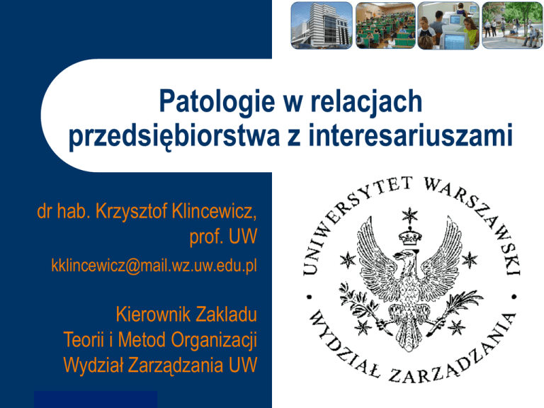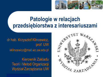 Patologie w relacjach przedsiębiorstwa z interesariuszami dr hab. Krzysztof Klincewicz, prof. UW [email protected] Kierownik Zakladu Teorii i Metod Organizacji Wydział Zarządzania UW © Wydział Zarządzania UW 2008 Firma i interesariusze jako ekosystem (Iansiti, Levien) •Metafora ekosystemu •Synergia, obopólne korzyści i współtworzenie wartości dodanej •Wspieranie interesariuszy © Wydział Zarządzania UW 2010 •Iansiti, M., Levien, R. (2004) The Keystone Advantage, Boston: Harvard Business School Press Problem: czasami biznes staje się grą o sumie zerowej • Przyczyny • Decyzje firmy • Decyzje interesariuszy • Natura otoczenia firmy • Iansiti, Levien: „value domination” jako błąd strategiczny • Nadmierne uproszczenie? © Wydział Zarządzania UW 2010 Sieć wartości (Brandenburger, Nalebuff) oferują pieniądze w zamian za dobra i usługi Nabywcy Rywale Firma ułatwiają zdobycie klientów i zasobów (zwiększają wartość) utrudniają zdobycie klientów i zasobów (zmniejszają wartość) Dostawcy oferują dobra i usługi w zamian za pieniądze © Wydział Zarządzania UW 2010 Komplementariusze Interesariusz w podwójnej roli •Jednocześnie rywal i komplementariusz? •Rywal stający się komplementariuszem w wyniku działań firmy („coopetition”) © Wydział Zarządzania UW 2010 Patologie w relacjach firmy z interesariuszami • Patologie? • czy: problemy w relacjach • czy: zjawiska w relacjach • Problem wartościowania • Strategiczne i taktyczne działania reprezentantów firm, które czasami są na tyle powszechne, że wydają się akceptowalne © Wydział Zarządzania UW 2010 Problemy oczywiste (?) •Zabójstwo •także pośrednie: skażenie środowiska, oferowanie szkodliwych produktów •Kradzież •zabór mienia, odebranie własności materialnej •Kłamstwo © Wydział Zarządzania UW 2010 Granice świadomości a granice odpowiedzialności • Przykład firmy chemicznej i przetwórni mleka w Chinach, producenta czekolad w Szwajcarii i dzieci we Włoszech • na którym etapie niedopatrzenie? • czy HACCP pomoże? © Wydział Zarządzania UW 2010 Świadomość i odpowiedzialność - Jelfa •2006 - Ampułki leku na astmę Corhydronu napełnione środkiem zwiotczającym mięśnie Skolina •Firma stosowała GMP •…ale fałszowała dokumentację nadzoru produkcji © Wydział Zarządzania UW 2010 Świadomość i odpowiedzialność – Snow Brand Milk •1955 – masowe zatrucia skażonym mlekiem •2000 – ponowne masowe zatrucia skażonym mlekiem (8969 osób) •Brak higieny w fabryce w Osace, zawór niemyty przez 3 tygodnie •Arogancja i wprowadzanie w błąd opinii publicznej © Wydział Zarządzania UW 2010 Świadomość i odpowiedzialność – Snow Brand (cd.) •2001 – „afera mięsna” •fałszowanie dokumentacji i wprowadzanie na rynek japoński australijskiej wołowiny mimo zakazu importu, związanego z BSE •2002 – „afera maślana” •próba wprowadzenia do obrotu 2300 ton przeterminowanego masła © Wydział Zarządzania UW 2010 Kradzież (?) własności intelektualnej •Kradzież a imitacja i rozlew wiedzy (knowledge spillover) •Imitacje nie naruszające przepisów prawa •Wsparcie publiczne dla lokalnych firm, imitujących zagraniczne produkty •Dopuszczalność reverse engineering © Wydział Zarządzania UW 2010 Sprawiedliwość a innowacje •Brak pojęcia sprawiedliwości w systemie patentowym •First-to-invent (bezwzględne prawa pierwszego wynalazcy) • First-to-patent (prawa przysługujące podmiotowi, który jako pierwszy zgłosił wynalazek) © Wydział Zarządzania UW 2010 Wojny patentowe - Nichia •Diody LED – japońska firma Nichia dążyła do eliminacji konkurentów za sprawą kosztownych procesów sądowych •Konkurenci korzystali z własnych metod wytwarzania diod, nie naruszając praw patentowych – ale procesy były kosztowne… © Wydział Zarządzania UW 2010 Wojny patentowe - Nichia © Wydział Zarządzania UW 2010 Wojny patentowe - oprogramowanie • Firmy informatyczne próbują odstraszyć użytkowników darmowych systemów typu open source • Microsoft przekonał dostawcę wariantu systemu Linux firmę Novell do licencjonowania portfolio patentów Microsoftu • Tajwański producent telefonów firma HTC, wykorzystująca darmowy system Android, zakupiła od Microsoftu licencje w celu ochrony przed groźbami firmy Apple © Wydział Zarządzania UW 2010 Marsz ku klęsce •Podejmowanie się projektów niemożliwych do realizacji lub wyjątkowo nieatrakcyjnych •Wymuszone przez klienta •Wymuszone przez rynek – przykład firm remontowych © Wydział Zarządzania UW 2010 Payola •Budowa pozycji na rynku przez płacenie klientom •nielegalna praktyka radiostacji w USA •powszechne stosowanie na rynkach technologicznych – np. Microsoft i oprogramowanie dla firm telekomunikacyjnych oraz stacji telewizyjnych © Wydział Zarządzania UW 2010 Polityka międzyorganizacyjna •„Divide et impera” •Wykorzystywanie nacisków i współzależności (block model) •Padget, Ansell (1992) Robust action and the rise of Medici, American Journal of Sociology •Medyceusze rządzili Florencją nie sprawując formalnej władzy © Wydział Zarządzania UW 2010 Polityka międzyorganizacyjna • Iansiti, Levien • relacje z interesariuszami jako ekosystem • Cusumano, Gawer • relacje z interesariuszami jako platforma • Ale też: • System polityczny, obejmujący rozbieżne interesy i działania „motywujące” © Wydział Zarządzania UW 2010 Polityka międzyorganizacyjna • Gawer: analiza bliskich relacji partnerskich pomiędzy firmami Intel i Microsoft • Ale dokumenty sądowe opowiadają o innej historii – naciski, szantaż dotyczący wstrzymania rozwoju systemu Windows dla procesorów Intel w związku z ambicjami rozwijania własnego oprogramowania przez firmę Intel © Wydział Zarządzania UW 2010 Polityka międzyorganizacyjna – Microsoft „konwertu