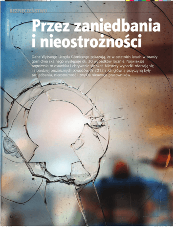 BEZPIECZEŃSTWO Fot.: photogenica.pl Przez zaniedbania i nieostrożności Dane Wyższego Urzędu Górniczego pokazują, że w ostatnich latach w branży górnictwa skalnego występuje ok. 30 wypadków rocznie. Największe zagrożenia to osuwiska i obrywanie się skał. Niestety wypadki zdarzają się i z bardziej prozaicznych powodów. W 2012 r. ich główną przyczyną były zaniedbania, nieostrożność i zwykła nieuwaga pracowników. 82 SiMB 6/2013 www.surowce.e-bmp.pl BEZPIECZEŃSTWO Z akłady kruszyw robią wszystko, aby zminimalizować ryzyko i zapewnić bezpieczne warunki pracy. Dziś branża górnicza postrzegana jest jako bezpieczna, ale jeszcze 30 lat temu wypadek zdarzał się niemal co drugi dzień. Jak te statystyki przedstawiają się obecnie? W ubiegłym roku w górnictwie odkrywkowym miały miejsce 2 wypadki śmiertelne na 26 tego typu zdarzeń w całym górnictwie. Bezpośrednią przyczyną pierwszego wypadku śmiertelnego był kontakt poszkodowanego z napięciem 6kV występującym na pierścieniach zasilających koparkę, drugi wypadek zdarzył się na skutek wjazdu ładowarką do zbiornika eksploatacyjnego wypełnionego wodą, którego operator utonął. Rok 2012 przyniósł trzy ciężkie wypadki spowodowane m.in. osunięciem się ze skarpy bryły gliny czy uderzeniem poszkodowanego w twarz odrzuconym zaciskiem nożycowym, w czasie ciągnięcia oddzielanego pasa bieżnika taśmy przenośnikowej na stanowisku wulkanizacyjnym. KWB ZG odkrywkowe (poza KWB) RAZEM Załoga własna 1 Śmiertelne Załoga własna+firmy Załoga usługowe własna 1 1 W KWB „Turów” w dniu 03.03.2013 r. wskutek zatarcia łożyska w krążniku podtrzymującym dolną taśmę spaleniu uległ przenośnik P-434 na odcinku 2x14 metrów. W KWB „Turów” w dniu 19.03.2013 r. pracownik BESTGUM POLSKA Sp. z o.o. oświadczył swojemu przełożonemu, że podczas jazdy (jako pasażer) drogą technologiczną wzdłuż ciągów przenośników taśmowych koparki uderzył głową o poszycie przedziału pasażerskiego. Poszkodowany nie zgłosił potrzeby udzielenia pomocy. Następnego dnia przewieziono go karetką do szpitala w Bogatyni, gdzie w dniu 25.03.2013 r. nastąpił jego zgon. Przyczyną był prawdopodobnie krwotok samoistny, spowodowany nadciśnieniem tętniczym (prawdopodobnie zgon naturalny). W zakładzie górniczym Kopalnia Kruszyw Naturalnych „Komorniki 1” w Winnej k/Kielc w dniu 23.03.2013 r. poza wyrobiskiem na terenie zakładu górniczego, w miejscu postoju nieczynnych, maszyn miał miejsce pożar egzogeniczny. Otwarty ogień objął Ciężkie Załoga własna+firmy usługowe 1 Załoga własna 59 Ogółem Załoga własna+firmy usługowe 65 1 1 1 22 23 2 1 2 81 88 TAB. 1 Wypadkowość w kopalniach odkrywkowych w 2012 roku W ciągu 10 miesięcy br. wszystkich zdarzeń wypadkowych zarejestrowano 70, czyli tyle samo, ile w analogicznym okresie roku ubiegłego. Co było ich najczęstszą przyczyną? Poniżej opisy wypadków i zdarzeń zarejestrowanych przez Wyższy Urząd Górniczy (stan na 25.10.2013 r.) W Kopalni Granitu „Wieśnica” należącej do „Berger Surowce” Sp. z o.o. we Wrocławiu w dniu 06.02.2013 r., podczas próby dojścia do wysypu leja mobilnej kruszarki szczękowej na podwoziu gąsienicowym typu Lokotrack LT 140, celem odblokowania ruchu przenośnika taśmowego, unieruchomionej przez nagromadzony urobek, operator wozidła technologicznego (pracownik własny kopalni) prawdopodobnie spadł z wysokości ok. 2 m do wnętrza konstrukcji zbiornika zasypowego na taśmę tego przenośnika. Poszkodowany zamierzał rozbić młotem bryły granitowe blokujące ruch przenośnika taśmowego odbierającego kruszywo z kruszarki. Uległ on urazowi wielonarządowemu (wypadek ciężki). W KWB „Bełchatów” w dniu 6.02.2013 r. miał miejsce wstrząs sejsmiczny o energii E = 4,08 x 107 J, tj. magnitudzie M = 3,1. Epicentrum wstrząsu znajdowało się w obrębie wyrobiska górniczego Pola Bełchatów, 370 m na południe od stacji zwrotnej przenośnika B 110. Nie stwierdzono zagrożenia bezpieczeństwa ludzi oraz ruchu zakładu górniczego. Do godz. 10.30 następnego dnia nie stwierdzono szkód w obiektach kopalni i poza nią. www.surowce.e-bmp.pl Fot.: BMP’ 70 wypadków w 10 miesięcy WYPADEK CO DRUGI DZIEŃ? TAK BYŁO... Mariola Stefanicka, Instytut Górnictwa Politechniki Wrocławskiej Dziś człowiek i jego bezpieczeństwo są coraz ważniejsi w zakładach kruszyw. Gdy 33 lata temu zaczynałam pracę, wypadki zdarzały się co drugi dzień i takie były realia. Obecnie wystarczy popatrzeć na statystyki wypadkowe, publikowane przez Wyższy Urząd Górniczy, aby stwierdzić, że w górnictwie skalnym łączna liczba wypadków w roku w nie przekracza 30. Dużo się zmieniło szczególnie w zakresie poprawy technicznych warunków pracy oraz organizacji i zarządzania bezpieczeństwem pracy. Zmiany te są wynikiem wdrażania nowoczesnych technologii, ale również przenikania dobrych praktyk bezpieczeństwa z firm grup kapitałowych o światowym zasięgu. Należy jednak pamiętać, że bezpieczeństwo to nie tylko technika, przepisy i procedury, najważniejsza jest świadomość i chęć pracy bezpiecznej. Nazywamy to kulturą bezpieczeństwa pracy, nad którą musimy jeszcze sporo popracować. SiMB 6/2013 83 BEZPIECZEŃSTWO magazynek z gazami technicznymi. Pracownik ten oraz osoba postronna wykonali otwór w 200 litrowej beczce po oleju, do którego włożyli sznurek mający pełnić rolę lontu. Następnie napełnili beczkę tlenem i acetylenem przez otwór wlewowy i zakręcili go korkiem. Przenieśli beczkę na groblę między zbiorniki wodne znajdujące się poza wyznaczonym przez osobę dozoru ruchu miejscem naprawy ładowarki. W czasie przenoszenia beczki osoba postronna paliła papierosa i trzymała w ręku zapalniczkę, którą przypuszczalnie chciała podpalić „lont”. W trakcie opuszczania przez osobę postronną beczki na wodę nastąpił wybuch, w wyniku którego, wskut