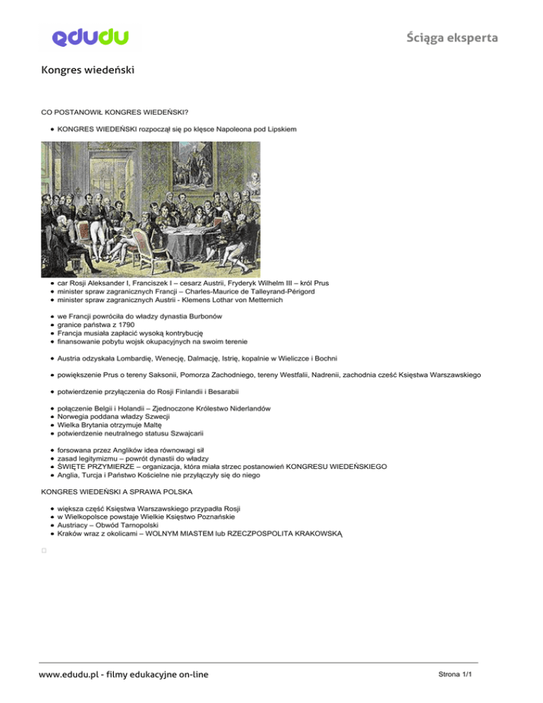 Ściąga eksperta Kongres wiedeński CO POSTANOWIŁ KONGRES WIEDEŃSKI? KONGRES WIEDEŃSKI rozpoczął się po klęsce Napoleona pod Lipskiem car Rosji Aleksander I, Franciszek I – cesarz Austrii, Fryderyk Wilhelm III – król Prus minister spraw zagranicznych Francji – Charles-Maurice de Talleyrand-Périgord minister spraw zagranicznych Austrii - Klemens Lothar von Metternich we Francji powróciła do władzy dynastia Burbonów granice państwa z 1790 Francja musiała zapłacić wysoką kontrybucję finansowanie pobytu wojsk okupacyjnych na swoim terenie Austria odzyskała Lombardię, Wenecję, Dalmację, Istrię, kopalnie w Wieliczce i Bochni powiększenie Prus o tereny Saksonii, Pomorza Zachodniego, tereny Westfalii, Nadrenii, zachodnia cześć Księstwa Warszawskiego potwierdzenie przyłączenia do Rosji Finlandii i Besarabii połączenie Belgii i Holandii – Zjednoczone Królestwo Niderlandów Norwegia poddana władzy Szwecji Wielka Brytania otrzymuje Maltę potwierdzenie neutralnego statusu Szwajcarii forsowana przez Anglików idea równowagi sił zasad legitymizmu – powrót dynastii do władzy ŚWIĘTE PRZYMIERZE – organizacja, która miała strzec postanowień KONGRESU WIEDEŃSKIEGO Anglia, Turcja i Państwo Kościelne nie przyłączyły się do niego KONGRES WIEDEŃSKI A SPRAWA POLSKA większa część Księstwa Warszawskiego przypadła Rosji w Wielkopolsce powstaje Wielkie Księstwo Poznańskie Austriacy – Obwód Tarnopolski Kraków wraz z okolicami – WOLNYM MIASTEM lub RZECZPOSPOLITA KRAKOWSKĄ www.edudu.pl - filmy edukacyjne on-line Powered by TCPDF (www.tcpdf.org) Strona 1/1