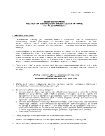 Poznań, dn. 23 kwietnia 2015 r. SZCZEGÓŁOWE WARUNKI PRZETARGU NA DZIERŻAWĘ TERENU Z PRZEZNACZENIEM NA PARKING PRZY AL. SOLIDARNOŚCI 36 I. INFORMACJE OGÓLNE 1. Przedmiotem przetargu jest dzierżawa terenu o powierzchni 3500 m2 stanowiących powierzchnię działek położonych w Poznaniu przy Al. Solidarności 36 ozn. 306401_1.0052.AR_15.18/10 i 306401_1.0052.AR_15.18/8, dla których prowadzona jest księga wieczysta KW nr PO1P/00157578/1 i PO1P/00253158/4 na okres 9 lat od dnia podpisania umowy r. 2. Przetarg ogłoszony został na podstawie Uchwały nr XIX/248/VI/2011 Rady Miasta Poznania z dnia 18 października 2011 r. w sprawie określenia zasad zbywania, oddania w dzierżawę, najem, użytkowanie oraz użyczenie aktywów trwałych samodzielnych publicznych zakładów opieki zdrowotnej. oraz Uchwały nr LXXII/1130/VI/2014 Rady Miasta Poznania z dnia 15 lipca 2014 r. w sprawie wyrażenia zgody na zawarcie przez POSUM w Poznaniu umowy dzierżawy terenu z przeznaczeniem na parking na czas określony dłuższy niż 3 lata. 3. Ofertę należy złożyć w formie pisemnej (wzór formularza ofertowego stanowi załącznik nr 1 do szczegółowych warunków przetargu), w zamkniętej kopercie, opatrzonej pieczątką oferenta, z napisem: „Przetarg na dzierżawę terenu z przeznaczeniem na parking przy Al. Solidarności 36 Nie otwierać przed dniem 08 maja 2015 r. godz. 10:30” 4. Oferta, pod rygorem odrzucenia, powinna zawierać wszystkie wymagane informacje i oświadczenia, wskazane na formularzu ofertowym. 5. Do formularza ofertowego należy dołączyć: a. aktualny odpis z właściwego rejestru albo aktualne zaświadczenie o wpisie do ewidencji działalności gospodarczej, jeżeli odrębne przepisy wymagają wpisu do rejestru lub zgłoszenia do ewidencji działalności gospodarczej wystawione nie wcześniej niż 6 miesięcy przed upływem terminu składania ofert, w formie oryginału lub kopii poświadczonej za zgodność z oryginałem przez oferenta b. aktualne zaświadczenie właściwego Naczelnika Urzędu Skarbowego oraz zaświadczenie właściwego Oddziału Zakładu Ubezpieczeń Społecznych potwierdzającego, że oferent nie zalega z opłacaniem podatków, opłat oraz składek na ubezpieczenie zdrowotne i społeczne wystawione nie wcześniej niż 6 miesięcy przed upływem terminu składania ofert, w formie oryginału lub kopii poświadczonej za zgodność z oryginałem przez oferenta. c. parafowany wzór umowy 6. Ofertę podpisują osoby uprawnione do reprezentowania oferenta. 7. Umowa zostanie podpisana po ostatecznym zakończeniu procedury przetargowej. 8. Termin związania ofertą wynosi 30 dni licząc od dnia upływu terminu składania ofert. 1 II. OPIS PRZEDMIOTU PRZETARGU I WARUNKI WYKONANIA ZAMÓWIENIA 1. Przedmiotem przetargu jest niezabudowana część nieruchomości gruntowych o łącznej powierzchni 3.500 m2, na którą składa się część działki gruntowej o numerze ewidencyjnym 18/8, objętej Księgą Wieczystą prowadzoną przez Sąd Rejonowy Poznań - Stare Miasto w Poznaniu, V Wydział Ksiąg Wieczystych pod nr PO1P/00157578/1 o powierzchni 2 335 m2 i działka gruntowa o numerze ewidencyjnym 18/10 objęta Księgą Wieczystą prowadzoną przez Sąd Rejonowy Poznań - Stare Miasto w Poznaniu, V Wydział Ksiąg Wieczystych pod nr PO1P/00253158/4 o powierzchni 1 165 m2. 2. Kryterium wyboru oferenta: miesięczny czynsz dzierżawny w wysokości równej _____% przychodów miesięcznych netto uzyskiwanych przez Dzierżawcę z tytułu prowadzenia parkingu na wydzierżawionym terenie i pobierania opłat od każdego samochodu korzystającego z parkingu, stanowiącego przedmiot dzierżawy (nie mniej niż kwota 8 750,00 zł. netto) Do stawki czynszu zostanie doliczony obowiązującej stawki tego podatku. podatek od towarów i usług (VAT), według 3. Minimalna stawka czynszu za dzierżawę podlega corocznej waloryzacji o wskaźnik nie wyższy niż 100 % wartości wskaźnika zmiany cen towarów i usług konsumpcyjnych ogłoszonego przez Prezesa GUS w dzienniku urzędowym „Monitor Polski” za rok poprzedzający waloryzację. Zwaloryzowana stawka czynszu, która zostanie zaokrąglona do pełnych złotych w górę, obowiązywać będzie od marca do lutego następnego roku. 4. Oprócz czynszu, Najemca ponosić będzie opłaty związane z poborem energii elektrycznej wg wskazań licznika 5. Oferent zobowiązany jest do: a. profesjonalnego wykonywania usług zgodnie z obowiązującymi aktami prawnymi, b. uzyskania wszystkich wymaganych prawem pozwoleń na prowadzenie działalności związanej z przedmiotem umowy 6. Oferent ponosi odpowiedzialność wobec Wynajmującego za nienależyte wykonywanie działalności. III SKŁADANIE OFERT 1. Oferty należy składać w Sekretariacie POSUM przy Al. Solidarności 36 w terminie do 08.05.2015 r. godz. 10.00. 2. Oferty złożone po tym terminie zostaną odrzucone. 3. Przetarg jest ważny jeżeli wpłynie co najmniej jedna oferta nie podlegająca odrzuceniu. IV OTWARCIE OFERT 1. Otwarcie ofert nastąpi w dniu 08.05.2015 r. o godz. 10.30 w POSUM przy Al. Solidarności 36 (Administracja) 2. Oferenci mogą być obecni przy otwarciu ofert. 2 3. Podczas otwarcia ofert do publicznej wiadomości podane zostaną następujące informacje: a. Dane oferentów b. Procentowy czynsz dzierżawny V ODRZUCONA ZOSTANIE OFERTA jeżeli: 1. Jest niezgodna z ogłoszeniem o przetargu. 2. Jest niezgodna ze szczegółowymi warunkami przetargu albo przepisami prawa. 3. Złożona została po terminie określonym w pkt. III.1. VI WYBÓR OFERTY: Zamawiający dokona wyboru oferty zawierającej najwyższy procentowy czynsz dzierżawny. VII UMOWA: Strony zawrą umowę na warunkach określonych w projekcie umowy stanowiącym załącznik do szczegółowych warunków przetargu. Wszyscy uczestnicy przetargu otrzymują pisemne zawiadomienie o jego rozstrzygnięciu. Udzielający zamówienia zastrzega sobie prawo unieważnienia przetargu bez podania przyczyny bądź przedłużeni