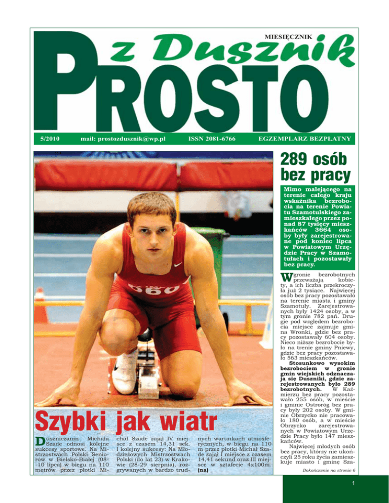 MIESIĘCZNIK 5/2010 mail: [email protected] ISSN 2081-6766 EGZEMPLARZ BEZPŁATNY 289 osób bez pracy Mimo malejącego na terenie całego kraju wskaźnika bezrobocia na terenie Powiatu Szamotulskiego zamieszkałego przez ponad 87 tysięcy mieszkańców 3664 osoby były zarejestrowane pod koniec lipca w Powiatowym Urzędzie Pracy w Szamotułach i pozostawały bez pracy. gronie bezrobotnych W przeważają kobiety, a ich liczba przekroczy- Szybki jak wiatr uszniczanin Michała D Szade odnosi kolejne sukcesy sportowe. Na Mistrzostwach Polski Seniorów w Bielsko-Białej (08-10 lipca) w biegu na 110 metrów przez płotki Mi- chał Szade zajął IV miejsce z czasem 14,31 sek. I kolejny sukcesy: Na Młodzieżowych Mistrzostwach Polski (do lat 23) w Krakowie (28-29 sierpnia), rozgrywanych w bardzo trud- nych warunkach atmosferycznych, w biegu na 110 m przez płotki Michał Szade zajął I miejsce z czasem 14,41 sekund oraz III miejsce w sztafecie 4x100m. (na) ła już 2 tysiące. Najwięcej osób bez pracy pozostawało na terenie miasta i gminy Szamotuły. Zarejestrowanych były 1424 osoby, a w tym gronie 782 pań. Drugie pod względem bezrobocia miejsce zajmuje gmina Wronki, gdzie bez pracy pozostawały 604 osoby. Nieco niższe bezrobocie było na trenie gminy Pniewy, gdzie bez pracy pozostawało 563 mieszkańców. Stosunkowo wysokim bezrobociem w gronie gmin wiejskich odznaczają się Duszniki, gdzie zarejestrowanych było 289 bezrobotnych. W Kaźmierzu bez pracy pozostawało 255 osób, w mieście i gminie Ostroróg bez pracy były 202 osoby. W gminie Obrzycko nie pracowało 180 osób, a w mieście Obrzycko zarejestrowanych w Powiatowym Urzędzie Pracy było 147 mieszkańców. Najwięcej młodych osób bez pracy, którzy nie ukończyli 25 roku życia zamieszkuje miasto i gminę SzaDokończenie na stronie 6 1 Skutecznie przeciwdziałają Od stycznia realizowany jest w Gminie Duszniki Gminny Program Profilaktyki i Rozwiązywania Problemów Alkoholowych. Program nie ogranicza się tylko do działalności informacyjnej w zakresie rozwiązywania problemów. ramach realizacji gminW nego programu zorganizowane są świetlice środowiskowe i prowadzone jest w nich między innymi dożywianie. Ponadto GKRPA organizuje i wspiera wypoczynek letni dla dzieci i młodzieży, podczas którego wykorzystywane są elementy programu profilaktycznego i socjoterapeutycznego. - Wspieramy i finansujemy imprezy sportowo-rekreacyjne dla dzieci oraz imprezy kulturalne promujące zdrowy i trzeźwy tryb życia. Ponadto finansujemy szkolenia z zakresu profilaktyki dla nauczycieli, wychowawców świetlic, pracowników socjalnych, wolontariuszy, członków naszej komisji oraz wolontariuszy, sprzedawców napojów alkoholowych, radnych, sołtysów i policji – zapewnia szef GKRPA Bogdan Buda. W ramach prac komisji duże znaczenie ma również zwiększenie dostępności pomocy terapeutycznej i rehabilitacyjnej dla osób uzależnionych od alkoholu i narkotyków. W siedzibie GKRPA przy ulicy Sportowej mieści się również punkt informacyjnokonsultacyjny, do którego ze swymi problemami zwracają się ludzie nadużywający alkoholu lub ich rodziny oraz inne osoby z problemami społecznymi. - GKRPA za jeden ze swych naczelnych celów uznaje zintegrowanie działań różnorodnych podmiotów świadczących usługi w zakresie rozwiązywania problemów społecznych i wspieranie ruchów samopomocowych. Wspomagamy działalności instytucji, stowarzyszeń i osób fizycznych służących szeroko pojętej profilaktyce rozwiązywania problemów alkoholowych i przeciwdziałania narkomani. Podejmujemy również interwencje w związku z naruszaniem określonych przepisów oraz występujemy w określonych przypadkach przed sadem w charakterze oskarżycieli publicznych – zapewnia jej przewodniczący. (rob) 2 Informacja z prac Wójta Gminy Duszniki OD 14 SIERPNIA DO 17 WRZEŚNIA 2010 ROKU W omawianym okresie uczestniczyłem w: - podpisaniu umowy dotacji z WFOŚiGW w kwocie 20.000 zł na kanalizację w Dusznikach (nowe działki przy ul. Szamotulskiej), - podpisaniu umowy pozyczki w banku Gospodarstwa Krajowego, - zawodach sportowo-pożarniczych gmin Stowarzyszenia KOLD w Bolewicach, - dożynkach parafialnych w Ceradzu Kościelnym, - posiedzeniach komisji rady gminy, - posiedzeniu Zarządu Gminnego ZOSP w Dusznikach, - turnieju piłki nożnej o puchar Prezesa ZGZOSP w Sekowie, - dożynkach gminno-parafialnych w Sękowie, - rozpoczęciu roku szkolnego w Szkole Podstawowej w Dusznikach i w Gimnazjum w Dusznikach, - odsłonięciu tablicy pamiątkowej w Podrzewiu, - uroczystości nadania sztandaru dla Komendy Powiatowej Policji w Szamotułach, - dożynkach wiejskich w Chełminku, - szkoleniu RIO w sprawie wieloletniej prognozy finansowej, - rajdzie rowerowym w Kuslinie, - konferencji „Leader w Polsce” w Rokosowie, - zebraniach wiejskich w Mieściskach i Dusznikach. Odbyłem: - spotkanie z Komendantem Powiatowym Policji Mirosławem Żabińskim i Kierownikiem Posterunku Policji w Dusznikach Grzegorzem Szymczakiem w sprawach bieżących, - spotkanie z Zarządem spółki PSWM Wielkopolska w sprawach bieżących. Przewodniczyłem: - cotygodniowym naradom z udziałem kierowników jednostek organizacyjnych gminy oraz komórek organizacyjnych urzędu, - naradzie z dyrektorami szkół i przedszkola z terenu gminy w sprawie rozpoczęcia roku szkolnego 2010/2011, - odprawie przedspisowej z rachmistrzami w sprawie spisu rolnego. Przyjąłem 86 interesantów związanych z Gminą Duszniki, w sprawach dotyczących ich problemów i współpracy z gminą. Wydałem następujące zarządzenia: - Nr 46/10 z dnia 05.08.2010r. w sprawie powierzenia stanowiska Dyrektora Gimnazjum w Dusznikach, - Nr 47/10 z dnia 05.09.2010r. w sprawie powierzenia stanowiska Dyrektora Szkoły Podstawowej w Dusznikach, - Nr 48/10 z dnia 05.09.2010r. w sprawie powierzenia stanowiska Dyrektora szkoły Podstawowej w Sędzinku, - Nr 49/10 z dnia 23.08.2010r. w sprawie sprzedaży nieruchomośc