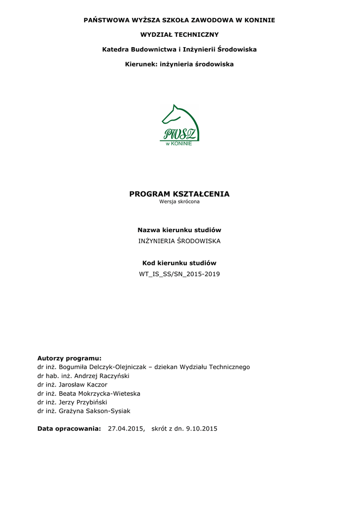 PAŃSTWOWA WYŻSZA SZKOŁA ZAWODOWA W KONINIE WYDZIAŁ TECHNICZNY Katedra Budownictwa i Inżynierii Środowiska Kierunek: inżynieria środowiska PROGRAM KSZTAŁCENIA Wersja skrócona Nazwa kierunku studiów INŻYNIERIA ŚRODOWISKA Kod kierunku studiów WT_IS_SS/SN_2015-2019 Autorzy programu: dr inż. Bogumiła Delczyk-Olejniczak – dziekan Wydziału Technicznego dr hab. inż. Andrzej Raczyński dr inż. Jarosław Kaczor dr inż. Beata Mokrzycka-Wieteska dr inż. Jerzy Przybiński dr inż. Grażyna Sakson-Sysiak Data opracowania: 27.04.2015, skrót z dn. 9.10.2015 1. Ogólna charakterystyka kierunku studiów 1.1. Podstawowe informacje Poziom kształcenia studia pierwszego stopnia Profil kształcenia praktyczny Forma studiów stacjonarne, niestacjonarne Liczba semestrów studia stacjonarne – 7 , niestacjonarne – 8 Tytuł zawodowy uzyskiwany przez absolwenta inżynier Obszar kształcenia nauki techniczne Dziedzina nauki nauki techniczne Dyscyplina naukowa inżynieria środowiska 1.2. Koncepcja kształcenia W Państwowej Wyższej Szkole Zawodowej w Koninie od roku 2007 jest prowadzony kierunek kształcenia „inżynieria środowiska”. Są to studia w obszarze i dziedzinie nauk technicznych. Student kierunku „inżynieria środowiska” uzyskuje wiedzę z zakresu podstaw nauk matematycznoprzyrodniczych i technicznych oraz szeroką wiedzę z zakresu inżynierii środowiska wewnętrznego (instalacje w budynkach decydujące o mikroklimacie) i zewnętrznego (w przestrzeni zurbanizowanej i niezurbanizowanej tj. urządzeń i instalacji stanowiących infrastrukturę techniczną). Nabywa umiejętności rozwiązywania problemów o charakterze projektowym, inwestycyjnym i eksploatacyjnym. Problemy te mogą dotyczyć urządzeń, instalacji oraz obiektów służących do kształtowania środowiska i ochrony środowiska w aspekcie technicznym. Aktualny program studiów został opracowany zgodnie z obowiązującymi Krajowymi Ramami Kwalifikacji w Szkolnictwie Wyższym. Przewidziano w nim zajęcia, które możliwie najbardziej wszechstronnie przygotowują studenta do pracy przy projektowaniu, realizacji i eksploatacji wszystkich instalacji należących do inżynierii środowiska. W ten sposób student uzyskuje szeroką wiedzę podstawową i kierunkową, a na trzecim roku studiów ma możliwość wyboru specjalności. Jest to również zgodne z potrzebami lokalnego rynku pracy, gdzie są poszukiwani absolwenci o różnych specjalnościach i specjalizacjach zawodowych, np. w zakładach przemysłowych, zakładach usługowych i urzędach jako specjaliści ds. gospodarki wodno-ściekowej, gospodarki odpadami, instalacji grzewczych, wentylacyjnych i wodociągowo-kanalizacyjnych. Dotychczas studia na tym kierunku były prowadzone bez wydzielonych specjalności, na zasadzie wypełniania ram programowych wywodzących się ze standardów kształcenia. Studia te były nakierowane na treści z zakresu sieci i instalacji zaopatrzenia w wodę, unieszkodliwiania ścieków i odpadów oraz instalacji ogrzewczych, wentylacyjnych i ochrony powietrza. Akcenty w tych treściach kształcenia dotychczas są położone głównie na potrzeby ośrodków zurbanizowanych. Realizując misję oraz cele strategiczne Uczelni i Wydziału zdecydowano się na rozgałęzienie treści kształcenia. Kształcenie w dotychczasowym zakresie będzie nadal realizowane w ramach specjalności „technologie i instalacje w inżynierii środowiska”. Nieco zbliżone treści, ale wyraźnie odniesione do potrzeb środowiska wiejskiego, będą realizowane w ramach drugiej specjalności pod nazwą „infrastruktura techniczna na terenach wiejskich”. Wiedzę i umiejętności, a także kompetencje społeczne niezbędne do wykonywania zawodu, absolwent kierunku „inżynieria środowiska” uzyskuje przede wszystkim w ramach przedmiotów kierunkowych i specjalistycznych. Przedmioty specjalistyczne w dużej części umożliwiają rozwój umiejętności związanych z opracowywaniem projektów inżynierskich. Przedstawiona koncepcja modyfikacji programu kształcenia z jednoczesnym wydzieleniem dwóch specjalności była skonsultowana z radą programową działającą przy kierunku „inżynieria środowiska” na posiedzeniu w dniu 24.01.2015. Sylwetki absolwentów obydwóch specjalności: Absolwent specjalności „technologie i instalacje w inżynierii środowiska” jest przygotowany do projektowania, wykonawstwa i eksploatacji urządzeń i dużych obiektów technicznych stosowanych zwłaszcza w środowisku zurbanizowanym, w tym do badań eksploatacyjnych, symulacji komputerowych, pomiarów diagnostycznych i monitoringu środowiska zurbanizowanego. Będzie mógł podejmować działalność zawodową związaną z: • systemami zaopatrzenia miast w wodę, • systemami odprowadzenia i unieszkodliwiania ścieków komunalnych i przemysłowych, • usuwaniem i unieszkodliwianiem odpadów pochodzących tak od mieszkańców jak i z przemysłu, • ochroną powietrza przed zanieczyszczeniami przemysłowymi, • z instalacjami w budynkach (instalacje ogrzewcze, wodociągowe, kanalizacyjne, gazowe, wentylacyjne i klimatyzacyjne). Absolwenci tej specjalności znajdą zatrudnienie m.in. w biurach projektów, przedsiębiorstwach budowlano-instalacyjnych i eksploatacyjnych, służbach komunalnych, firmach produkcyjno-handlowych związanych z materiałami instalacyjno-budowlanymi, zakładach przemysłowych i usługowych jako specjaliści z zakresu sieci, instalacji, gospodarki wodno-ściekowej w przemyśle itp. Absolwent specjalności „infrastruktura techniczna na terenach wiejskich” jest przygotowany do projektowania, wykonawstwa i eksploatacji urządzeń i małych obiektów technicznych, zwłaszcza stosowanych na terenach słabo zurbanizowanych i rolniczych, a także do prowadzenia symulacji komputerowych, pomiarów diagnostycznych i monitoringu środowiska wiejskiego. Będzie mógł podejmować działalność zawodową związaną z: • systemami zaopatrz