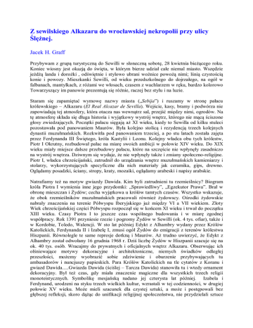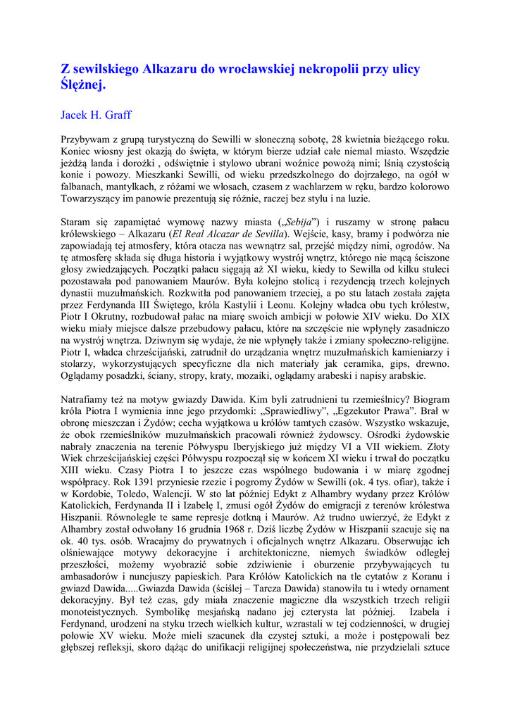 Z sewilskiego Alkazaru do wrocławskiej nekropolii przy ulicy Ślężnej. Jacek H. Graff Przybywam z grupą turystyczną do Sewilli w słoneczną sobotę, 28 kwietnia bieżącego roku. Koniec wiosny jest okazją do święta, w którym bierze udział całe niemal miasto. Wszędzie jeżdżą landa i dorożki , odświętnie i stylowo ubrani woźnice powożą nimi; lśnią czystością konie i powozy. Mieszkanki Sewilli, od wieku przedszkolnego do dojrzałego, na ogół w falbanach, mantylkach, z różami we włosach, czasem z wachlarzem w ręku, bardzo kolorowo Towarzyszący im panowie prezentują się różnie, raczej bez stylu i na luzie. Staram się zapamiętać wymowę nazwy miasta („Sebija”) i ruszamy w stronę pałacu królewskiego – Alkazaru (El Real Alcazar de Sevilla). Wejście, kasy, bramy i podwórza nie zapowiadają tej atmosfery, która otacza nas wewnątrz sal, przejść między nimi, ogrodów. Na tę atmosferę składa się długa historia i wyjątkowy wystrój wnętrz, którego nie mącą ściszone głosy zwiedzających. Początki pałacu sięgają aż XI wieku, kiedy to Sewilla od kilku stuleci pozostawała pod panowaniem Maurów. Była kolejno stolicą i rezydencją trzech kolejnych dynastii muzułmańskich. Rozkwitła pod panowaniem trzeciej, a po stu latach została zajęta przez Ferdynanda III Świętego, króla Kastylii i Leonu. Kolejny władca obu tych królestw, Piotr I Okrutny, rozbudował pałac na miarę swoich ambicji w połowie XIV wieku. Do XIX wieku miały miejsce dalsze przebudowy pałacu, które na szczęście nie wpłynęły zasadniczo na wystrój wnętrza. Dziwnym się wydaje, że nie wpłynęły także i zmiany społeczno-religijne. Piotr I, władca chrześcijański, zatrudnił do urządzania wnętrz muzułmańskich kamieniarzy i stolarzy, wykorzystujących specyficzne dla nich materiały jak ceramika, gips, drewno. Oglądamy posadzki, ściany, stropy, kraty, mozaiki, oglądamy arabeski i napisy arabskie. Natrafiamy też na motyw gwiazdy Dawida. Kim byli zatrudnieni tu rzemieślnicy? Biogram króla Piotra I wymienia inne jego przydomki: „Sprawiedliwy”, „Egzekutor Prawa”. Brał w obronę mieszczan i Żydów; cecha wyjątkowa u królów tamtych czasów. Wszystko wskazuje, że obok rzemieślników muzułmańskich pracowali również żydowscy. Ośrodki żydowskie nabrały znaczenia na terenie Półwyspu Iberyjskiego już między VI a VII wiekiem. Złoty Wiek chrześcijańskiej części Półwyspu rozpoczął się w końcem XI wieku i trwał do początku XIII wieku. Czasy Piotra I to jeszcze czas wspólnego budowania i w miarę zgodnej współpracy. Rok 1391 przyniesie rzezie i pogromy Żydów w Sewilli (ok. 4 tys. ofiar), także i w Kordobie, Toledo, Walencji. W sto lat później Edykt z Alhambry wydany przez Królów Katolickich, Ferdynanda II i Izabelę I, zmusi ogół Żydów do emigracji z terenów królestwa Hiszpanii. Równolegle te same represje dotkną i Maurów. Aż trudno uwierzyć, że Edykt z Alhambry został odwołany 16 grudnia 1968 r. Dziś liczbę Żydów w Hiszpanii szacuje się na ok. 40 tys. osób. Wracajmy do prywatnych i oficjalnych wnętrz Alkazaru. Obserwując ich olśniewające motywy dekoracyjne i architektoniczne, niemych świadków odległej przeszłości, możemy wyobrazić sobie zdziwienie i oburzenie przybywających tu ambasadorów i nuncjuszy papieskich. Para Królów Katolickich na tle cytatów z Koranu i gwiazd Dawida.....Gwiazda Dawida (ściślej – Tarcza Dawida) stanowiła tu i wtedy ornament dekoracyjny. Był też czas, gdy miała znaczenie magiczne dla wszystkich trzech religii monoteistycznych. Symbolikę mesjańską nadano jej czterysta lat później. Izabela i Ferdynand, urodzeni na styku trzech wielkich kultur, wzrastali w tej codzienności, w drugiej połowie XV wieku. Może mieli szacunek dla czystej sztuki, a może i postępowali bez głębszej refleksji, skoro dążąc do unifikacji religijnej społeczeństwa, nie przydzielali sztuce roli propagandowej. Nie był to przecież jeszcze czas angażowania sztuki w kontrreformację po Soborze Trydenckim (1545-1563). Tylko tu i w innych równie ważnych ośrodkach mógł narodzić się nowy styl w architekturze i sztuce, mudejar, już w VIII w. i przetrwać do XVII, łączący elementy islamskie z chrześcijańskimi: romańskimi i gotyckimi. On uczestniczył w powstaniu stylu izabelińskiego, łącząc się z flamandzkimi motywami dekoracyjnymi i z gotykiem angielskim Tudorów. Jednocześnie wykształcił się tak zwany styl złotniczy (plateresco, plateresk), nawiązujący do zgeometryzowanej architektury mauretańskiej. W XIX wieku wróciły wpływy mudejar i dały styl neomudejar, zapożyczający wzory bezpośrednio z arabskiej architektury Hiszpanii. Inspirację tym stylem można zobaczyć we wczesnych projektach Antonia Gaudiego (koniec XIX w.) Warto postawić sobie pytanie: jaka była rola Żydów w projektach architektonicznych oraz w ich realizacji, we wprowadzaniu motywów dekoracyjnych, zwłaszcza w czasach, gdy Hiszpania była pojęciem czysto geograficznym, gdy Półwysep Iberyjski był mozaiką państw chrześcijańskich i muzułmańskich, gdzie przynajmniej do końca XIII wieku przedstawiciele różnych narodów i religii mogli współżyć w miarę harmonijnie? Czas ten trwał jeszcze później w różnych dziedzinach życia ludzkiego i społecznego, krócej lub dłużej. Z wnętrz Alkazaru przechodzę na krótko do jego ogrodów. Wokół dostojnych dębów rosną kępy akantu, którego stylizowane kształty liści, pąków kwiatowych i kwiatów stały się ulubionym motywem zdobniczym w architekturze. Przed chwilą widziałem go, powielonego w kolejnych częściach pałacu. Teraz mogę porównać go z roślinnym oryginałem. Opuszczam Alkazar i udaję się do pobliskiej dawnej dzielnicy żydowskiej, która swój największy rozkwit przeżyła w wiekach XI-XII, a więc w czasach muzułmańskich. Później dostała dzisiejszą nazwę Santa C