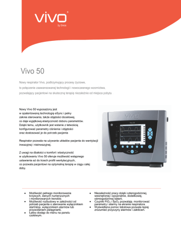 Vivo 50 Nowy respirator Vivo, podtrzymujący procesy życiowe, to połączenie zaawansowanej technologii i nowoczesnego wzornictwa, pozwalający pacjentowi na skuteczną terapię niezależnie od miejsca pobytu . Nowy Vivo 50 wyposażony jest w opatentowaną technologię eSync i pełny zakres sterowania, także objętości docelowej, co daje wyjątkową elastyczność doboru parametrów. Dzięki temu, użytkownik jest wstanie z łatwością konfigurować parametry ciśnienia i objętości oraz dostosować je do potrzeb pacjenta Respirator pozwala na używanie układów pacjenta do wentylacji inwazyjnej i nieinwazyjnej. Z uwagi na dbałości o komfort i elastyczność w użytkowaniu Vivo 50 oferuje możliwość wstępnego ustawienia aż do trzech profili wentylacyjnych, co pozwala pacjentowi na optymalną terapię w ciągu całej doby. ● ● ● Możliwość pełnego monitorowania krzywych, danych numerycznych i monitorowanych trendów. Możliwość rozbudowy w zależności od potrzeb pacjenta o sterowanie wyłącznikiem start/stop, wyłącznikiem alarmów lub przywołaniem pielęgniarki. Łatwy dostęp do menu na panelu czołowym. ● ● ● Niezależność pracy dzięki czterogodzinnej, wewnętrznej i opcjonalnie, dodatkowej, ośmiogodzinnej baterii. Czujniki FiO 2 i SpO 2 pozwalają monitorować parametry i alarmy na ekranie respiratora. Wyświetlana pomoc tekstowa pozwala lepiej zrozumieć przyczyny alarmów i zakłóceń. Specyfikacja techniczna Ustawienia / Parametry Tryby wentylacyjne • PSV • PCV • PCV(A) • VCV • CPAP • Domowy • Kliniczny Tryby ustawień Ciśnienie wdechowe • PSV(T) • PCV(T) • PCV(A+T) • VCV(A) 4 do 50 cmH 2O PEEP 2 cm H2O (przeciek w układzie), 0 cmH2O (układ z aktywną zastawką wydechową) do 30 cmH 2O ciśnienie - 2 cmH2O lub min. ciśnienie -2 cmH2O Częstość oddechów (PCV, VCV) 4 do 40 odd/min Czas wdechu 0.3 do 5 s Zastępczy czas wdechu 0.3 do 5 s (PSV) Czas narastania 1 do 9 (PSV & PCV) 0.3 do 5 s (VCV) Trigger wdechowy 1do 9 (PSV, PCV & VCV) Wyłączony (PCV & VCV) Trigger wydechowy 1do 9 (PSV) Minimalny czas wdechu Wyłączony, 0.3 do 3 s Maksymalny czas wdechu 0.3 do 3 s, Off Częstość odd. obowiązkowych (PSV) 4 do 40 odd/min Objętość docelowa 100 do 2500 ml Maksymalne ciśnienie 50 cmH2O Minimalne ciśnienie 4 cmH2O do 50 cmH 2O Objętość oddechu 100 do 2500 ml Krzywe przepływu Kwadratowa, opadająca CPAP 4 do 20 cmH 2O Zasilanie Monitoring Sieć elektryczna 100 do 240 V AC Bateria wewnętrzna 24 V DC Informacje na wyświetlaczu Ciśnienie szczytowe, PEEP, MAP, przeciek, MV, Vt , FiO2, % TV, częstość oddechów, oddechy spontaniczne, % oddechów spontanicznych , SpO2, puls, I:E, czas wdechu, czas narastania Krzywe Ciśnienie, przepływ, objętość Ciśnienie szczytowe, PEEP, częstość oddechów, Vt, częstość oddechów spontanicznych, przeciek, SpO2 Bateria dodatkowa Click-on 8 godz. Bateria wewnętrzna 4 godz. Trendy 1, 6, 24 i 48h Alarmy Wymiary Wysokiego ciśnienia, niskiego ciśn ienia, wysoki PEEP, niski PEEP, wysoka Vt , niska Vt , wysoka MV, niska MV, wysoka częstość oddechów, niska częstość oddechów, bezdech, rozłączenie, Rebreathing, wysokie FiO2, niskie FiO 2, częsty puls, wolny puls, niskiego stanu naładowania akumulatorów. WxHxD Waga Głośność (przy 10 cmH2O stałego ciśnienia) 348 × 120 × 264 mm bez dodatkowej baterii (348 × 120 × 290 mm z dodatkową baterią) 5.2 kg bez dodatkowej baterii (6.7 kg z dodatkową baterią) poniżej 30 dB(A) . Breas Medical AB · Företagsvägen 1 · SE-435 33 Mölnlycke · Sweden Phone +46 31 86 88 00 · Fax +46 31 86 88 10 · [email protected] · www.breas.com Autoryzowany przedstawiciel: EKOMARK Sp. z o.o. Tel. +48 22 833 17 34 [email protected] www.ekomark.pl Breas Medical AB zastrzega sobie zmianę specyfikacji bez powiadamiania . Sierpień 2009