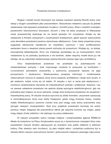 Przestrzeń biurowa a kreatywność. Wygląd i kształt wnętrz biurowych był zawsze wyrazem pewnej filozofii pracy oraz relacji z drugim człowiekiem jako pracownikiem. Stosunkowo niedawno zaczęto się jednak zastanawiać nad wpływem przestrzeni na jakość i komfort pracy. Wraz z szybkim rozwojem powierzchni nieruchomości biurowych, których z dnia na dzień przybywa w Warszawie coraz powszechniej dyskutuje się na temat sposobu ich urządzania. Dzieje się tak zwłaszcza w firmach związanych z przemysłami kreatywnymi, gdzie sposób wykończenia oraz atmosfera przestrzeni powinny stymulować efektywność. Czas, kiedy przestrzeń pracy wyglądała identycznie niezależnie od charakteru czynności i była zunifikowanym wariantem biura o otwartym planie powoli odchodzą do przeszłości. Wydaje się, że dzisiaj, przynajmniej deklaratywnie, firmy czy instytucje opowiadają się za rozwiązaniami, które nastawione są na potrzeby społeczne a nie kontrole. Jeden wspólny model biura już nie istnieje, da się natomiast zaobserwować pewne kierunki rozwoju tego typu architektury. Choć niestandardowa przestrzeń nie przekłada się automatycznie na niestandardowe pomysły i brak rutynowego myślenia to podążanie za komfortem i różnorodnymi potrzebami pracownika z pewnością pozytywnie wpływa pomysłowość i skuteczność. Nieskrępowany przepływ informacji i na jego moderowanie nieformalnych rozmów to zadania, które winna wspierać architektura i dizajn tych wnętrz. A jak wiadomo, ludzie różnią się od siebie. W związku z tym w cenie jest elastyczność i możliwość dostosowania otoczenia do indywidualnych potrzeb i preferencji. Sztywna i raz na zawsze ustawiona przestrzeń nie spełnia dzisiaj wymogów wielofunkcyjności, gdy raz potrzebne jest miejsce na duże zebranie, innego dnia konieczna przestrzeń do skupienia i indywidualnej pracy. W obrębie wnętrza wyróżnia się strefy formalne, utrzymane zazwyczaj w minimalistycznym tonie oraz strefy kreatywne, gdzie mogą królować kolory, miękkie meble Wielofunkcyjność powinna również brać pod uwagę czas wolny pracownika oraz sprzyjać relacjom międzyludzkim. Stąd przy projekcie przestrzeni biurowej nie wolno pominąć miejsc integracji dla pracowników takich jak wspólna kuchnia czy miejsc, gdzie mogą złapać chwilę oddechu i nie zajmując się pracą relaksować. W naszym przypadku wybór nowego miejsca i przeprowadzka agencji REBELIA Media do budynków na Placu Grzybowskim wiąże się z dynamicznym rozwojem firmy oraz powstaniem nowych struktur zajmujących się eventami oraz public relations w sektorze kultury. Plac stwarza nam możliwość, by jako miejski salon i przestrzeń publiczna był w okresie letnim naszym zewnętrznym biurem i jednocześnie miejscem pewnego odprężenia. Kolejnym plusem lokalizacji staje się dla nas obecność innych podmiotów w swojej działalności skupionych na kulturze. Mieszczący się po sąsiedzku klub jazzowy, ze świetnym programem muzycznym, współtworzy klimat i atmosferę placu, może okazać się również dobrą przestrzenią na mniej formalne spotkanie. Wybór przestrzeni ma również swoje uzasadnienie w dostępie do nietypowej infrastruktury takiej jak sala teatralna nadająca się na duże konferencje i wystąpienia prasowe. Jako firma staramy się wykorzystywać ten potencjał w naszej codziennej pracy, przez co mamy nadzieję, że udało nam się stworzyć miejsce kreatywne ale i przyjazne dla współpracowników.