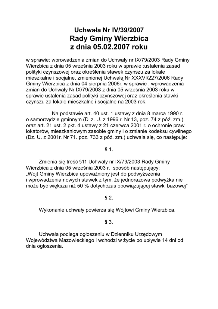 Uchwała Nr IV/39/2007 Rady Gminy Wierzbica z dnia 05.02.2007 roku w sprawie: wprowadzenia zmian do Uchwały nr IX/79/2003 Rady Gminy Wierzbica z dnia 05 września 2003 roku w sprawie :ustalenia zasad polityki czynszowej oraz określenia stawek czynszu za lokale mieszkalne i socjalne, zmienionej Uchwałą Nr XXXVI/227/2006 Rady Gminy Wierzbica z dnia 04 sierpnia 2006r. w sprawie : wprowadzenia zmian do Uchwały Nr IX/79/2003 z dnia 05 września 2003 roku w sprawie ustalenia zasad polityki czynszowej oraz określenia stawki czynszu za lokale mieszkalne i socjalne na 2003 rok. Na podstawie art. 40 ust. 1 ustawy z dnia 8 marca 1990 r. o samorządzie gminnym (D z. U. z 1996 r. Nr 13, poz. 74 z póź. zm.) oraz art. 21 ust. 2 pkt. 4 ustawy z 21 czerwca 2001 r. o ochronie praw lokatorów, mieszkaniowym zasobie gminy i o zmianie kodeksu cywilnego (Dz. U. z 2001r. Nr 71. poz. 733 z póź. zm.) uchwala się, co następuje: § 1. Zmienia się treść §11 Uchwały nr IX/79/2003 Rady Gminy Wierzbica z dnia 05 września 2003 r. sposób następujący: „Wójt Gminy Wierzbica upoważniony jest do podwyższenia i wprowadzenia nowych stawek z tym, że jednorazowa podwyżka nie może być większa niż 50 % dotychczas obowiązującej stawki bazowej” § 2. Wykonanie uchwały powierza się Wójtowi Gminy Wierzbica. § 3. Uchwała podlega ogłoszeniu w Dzienniku Urzędowym Województwa Mazowieckiego i wchodzi w życie po upływie 14 dni od dnia ogłoszenia. Uzasadnienie Wspólnoty Mieszkaniowe działają na podstawie ustawy o własności lokali z dnia 24 czerwca 1994r. (Dz. U. Z 1994r. Nr 85, poz. 388 z póżn. zm. ) ustalają wysokość opłat na pokrycie kosztów zarządu, funduszu remontowego. Gmina Wierzbica jako współwłaściciel lokali mieszkalnych, które znajdują się w tych wspólnotach jesteśmy zobowiązani do regulowania tych zaliczek jak również funduszu remontowego. W chwili obecnej max. fundusz remontowy i zaliczka na koszty zarządu wynoszą 1,75 zł. za 1m2 we wspólnotach na terenie gminy. Natomiast max. czynsz jakim Gmina Wierzbica obciąża najemców wynosi 1,008 zł. za 1m2. Podwyżka obecnie obowiązującej stawki bazowej o 50 % pozwoli na to, że Gmina Wierzbica nie będzie dopłacać do lokali mieszkalnych, które są naszą własnością a wynajmowane są osobą fizycznym. Uchwała Nr IV/42/2007 Rady Gminy Wierzbica z dnia 05.02.2007 roku w sprawie: wprowadzenia zmian do uchwały Nr VI/52/2003 Rady Gminy Wierzbica z dnia 28 marca 2003 r. w sprawie: określenia zasad nabycia, zbycia i obciążenia nieruchomości gruntowych oraz ich wydzierżawienia na okres dłuższy niż 3 lata. Na podstawie art. 18 ust. 2 pkt. 9 lit. „a” ustawy z dnia 8 marca 1990r. o samorządzie gminnym (Dz. U. Nr 142 z 2001 r. poz. 1591 - tekst jednolity z póżn. zm), art. 11 ust. 2 i art. 13 ust.1 ustawy z dnia 21 sierpnia 1997r. o gospodarce nieruchomościami) Dz. U. Nr 46 , poz. 543 z 2000 roku) w związku z art. 140 k.c. uchwala co następuje: ? 1. Zmienia się treść ? 4 w sposób następujący: „? 4 . Rada Gminy wyraża zgodę na odstąpienie od obowiązku przetargowego trybu zawarcia umów najmu lub dzierżawy nieruchomości gminnych. W przypadku zawarcia umowy użytkowania lub dzierżawy zawieranej na czas dłuższy niż 3 lata” ? 2. Zobowiązuje się Wójta Gminy do informowania Rady na bieżąco o nieruchomościach, które zamierza się nabywać i zbywać. ? 3. Wykowanie uchwały powierza się Wójtowi Gminy. ? 4. Uchwała wchodzi w życie po upływie 14 dni od daty ogłoszenia w Dzienniku Urzędowym Województwa Mazowieckiego. Uchwała Nr XXXIV/259/06 Rady Gminy w Wierzbicy z dnia 09.06.2006 roku w sprawie: oddania w dzierżawę na okres dłuższy niż 3 lata nieruchomości położonej we Wspólnocie Mieszkaniowej Nr 20 przy ul. J. Krasickiego w Wierzbicy . Na podstawie art. 18 ust. 2 pkt. 9 lit „a” ustawy z dnia 8 marca 1990 r. o samorządzie gminnym (tekst jednolity Dz. U. Nr 142 poz. 1591 z 2001r. z póżn. zm) oraz art. 13 ust. 1 i art. 40 ust. 1 ustawy z dnia 21 sierpnia 1997r. o gospodarce nieruchomościami (Dz. U. Nr 161, poz. 2603 z 2004 roku) Rada Gminy uchwala co następuje : ? 1. Wyraża się zgodę na oddanie w użytkowanie lokal użytkowy o pow. 97,00 m2 położony na parterze w budynku przy ul. J. Krasickiego 20 w Wierzbicy na rzecz Miejskiej Komendy Policji w Radomiu na okres dłuższy niż 3 lata . Szczegółowe warunki najmu lokalu określone zostaną w umowie. ? 2. W związku z przeniesieniem posterunku Policji w Wierzbicy do w/ w lokalu gmina nie poniesie z tego tytułu żadnych kosztów finansowych. ? 3. Wykonanie uchwały powierza się Wójtowi Gminy Wierzbica . ? 4. Uchwała wchodzi w życie z dniem jej powzięcia. Umowa Użyczenia Zawarta w dniu 02.01.2006r. pomiędzy Gminą Wierzbica w imieniu której działa: Sylwester Kopycki - Wójt Gminy Wierzbica nazwany w dalszej części umowy użyczającym: a Katolickim Stowarzyszeniem „BETANIA” - odział w Wierzbicy z siedzibą w Mstowie k/ Częstochowy w imieniu której działa: Ks. bp. dr hab. Antoni Długosz - Przewodniczący Zarządu Katolickiego Stowarzyszenia „BETANIA” nazwany w dalszej części umowy biorącym do użyczenia. ? 1. 1. Użyczający oświadcza, że jest właścicielem budynku położonego w Wierzbicy przy ul. Jana Pawła II 15, który jest przedmiotem niniejszej umowy i mocą tej umowy oddaje w użyczenia, a Biorący w użyczenia bierze przedmiotowy lokal. 2. Przedmiot najmu, o którym mowa w ust. 1 wyposażony jest w instalację elektryczną, wodna - kanalizacyjną, instalację centralnego ogrzewania. 3. Użyczający zapewnia swobodę dostępu Biorącemu w użyczenie do wynajmowanego budynku. 4. Przedmiot użycia jest już w posiadaniu biorącego w użycie ,który ponosi ciężary związane z budynkiem. ? 2. Użyczający oświadcza, że budynek będący przedmiotem użyczenia położony jest Wierzbicy przy ul. Jana Pawła II 15, zlokalizowany na działce nr 510/3 o powierzchni użytkow
