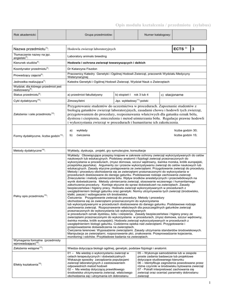 Opis modułu kształcenia / przedmiotu (sylabus) Grupa przedmiotów: Rok akademicki: Numer katalogowy: ECTS 2) Nazwa przedmiotu1): Hodowla zwierząt laboratoryjnych Tłumaczenie nazwy na jęz. angielski3): Laboratory animals breeding Kierunek studiów4): Hodowla i ochrona zwierząt towarzyszących i dzikich 5) Koordynator przedmiotu : 3 Dr Katarzyna Fiszdon Prowadzący zajęcia : Pracownicy Katedry Genetyki i Ogólnej Hodowli Zwierząt, pracownik Wydziału Medycyny Weterynaryjnej Jednostka realizująca7): Katedra Genetyki i Ogólnej Hodowli Zwierząt, Wydział Nauk o Zwierzętach 6) Wydział, dla którego przedmiot jest realizowany8): Status przedmiotu9): a) przedmiot fakultatywny 10) b) stopień I rok 3 lub 4 c) stacjonarne 11) Jęz. wykładowy :polski Cykl dydaktyczny : Zimowy/letni Założenia i cele przedmiotu12): Przygotowanie studentów do uczestnictwa w procedurach. Zapoznanie studentów z biologią gatunków zwierząt laboratoryjnych, zasadami chowu i hodowli tych zwierząt, przygotowaniem do procedury, rozpoznawania właściwych dla gatunku oznak bólu, dystresu i cierpienia, znieczulenia i metod uśmierzania bólu. Regulacje prawne hodowli i wykorzystania zwierząt w procedurach i humanitarne ich zakończenia. 13) Formy dydaktyczne, liczba godzin : a) wykłady liczba godzin 30; b) ćwiczenia liczba godzin 15; Metody dydaktyczne14): Wykłady, dyskusja, projekt, gry symulacyjne, konsultacje Pełny opis przedmiotu15): Wykłady: Obowiązujące przepisy krajowe w zakresie ochrony zwierząt wykorzystywanych do celów naukowych lub edukacyjnych. Podstawy anatomii i fizjologii zwierząt przeznaczonych do wykorzystania w procedurach, (mysz domowa, szczur wędrowny, świnka morska, królik europejski, przepiórka japońska). Argumenty za i przeciw wykorzystywaniu zwierząt do celów naukowych lub edukacyjnych. Zasady etyczne postępowania ze zwierzętami. Przygotowanie zwierząt do procedury. Metody i procedury obchodzenia się ze zwierzętami przeznaczonymi do wykorzystania w procedurach dostosowane do danego gatunku. Podstawowe rodzaje zachowania zwierząt. Znieczulenie i metody uśmierzania bólu. Wpływ środków anestetycznych i przeciwbólowych na wynik doświadczenia. Metody uśmiercania zwierząt, stosowanie wczesnego i humanitarnego zakończenia procedury. Komisje etyczne do spraw doświadczeń na zwierzętach. Zasady bezpieczeństwa i higieny pracy. Hodowla zwierząt wykorzystywanych w procedurach z uwzględnieniem biologii gatunku oraz genetyki. Normy utrzymywania tych zwierząt (środowisko, klatki, pasze) i wzbogacanie ich środowiska. Ćwiczenia: Przygotowanie zwierząt do procedury. Metody i procedury obchodzenia się ze zwierzętami przeznaczonymi do wykorzystania lub wykorzystywanymi w procedurach dostosowane do danego gatunku. Podstawowe rodzaje zachowania zwierząt. Rozpoznawanie właściwych dla poszczególnych gatunków zwierząt przeznaczonych do wykorzystania lub wykorzystywanych w procedurach oznak dystresu, bólu i cierpienia. Zasady bezpieczeństwa i higieny pracy ze zwierzętami przeznaczonymi do wykorzystania w procedurach, (mysz domowa, szczur wędrowny, świnka morska, królik europejski). Hodowla zwierząt wykorzystywanych w procedurach z uwzględnieniem biologii gatunku. Codzienna opieka nad zwierzętami. Przygotowanie i przeprowadzenie doświadczenia na zwierzętach. Ćwiczenia terenowe: Wyposażenie zwierzętarni. Zasady utrzymania standardów środowiskowych. Manipulacja ze zwierzętami, rozpoznawanie płci, znakowanie. Przeprowadzanie kojarzenia, monitoring i odchów. Przykładowe badania na zwierzętach. Wymagania formalne (przedmioty wprowadzające)16): Założenia wstępne17): Wiedza dotycząca biologii ogólnej, genetyki, podstaw fizjologii i anatomii. Efekty kształcenia18): 01 – Ma wiedzę o wykorzystaniu zwierząt w celach terapeutycznych i doświadczalnych Wskazuje sposoby zarządzania populacjami zwierząt laboratoryjnych z zastosowaniem odpowiednich metod hodowli 02 – Ma wiedzę dotyczącą prawidłowego środowiska utrzymywania zwierząt, właściwego obchodzenia się i utrzymania ich dobrostanu 05 – Wykonuje samodzielnie lub w zespole proste zadania badawcze lub projektowe dotyczące studiowanego kierunku 06 – Identyfikuje zagrożenia powodowane przez różne czynniki w środowisku bytowania zwierząt 07 - Potrafi interpretować zachowania się zwierząt oraz oceniać parametry dobrostanu zwierząt 1 03 – Posiada wiedzę pozwalającą na prowadzenie hodowli i ochrony zwierząt w laboratoriach 04 – Zna podstawowe regulacje prawne, ekonomiczne w działalności badawczej oraz chowie i hodowli zwierząt laboratoryjnych Sposób weryfikacji efektów kształcenia19): Forma dokumentacji osiągniętych efektów kształcenia 20): Elementy i wagi mające wpływ na ocenę końcową21): Miejsce realizacji zajęć22): 08 - Wykazuje wrażliwość na potrzeby zwierząt oraz ich dobrostan 01,03,04 – egzamin pisemny 06, 08 – Obserwacja w trakcie dyskusji zdefiniowanego problemu 02,05,07 - przygotowanie zespołowej analizy zdefiniowanego problemu Prace egzaminacyjne z oceną Imienne karty oceny studentów Złożone projekty Egzamin – 40% Obserwacja w trakcie dyskusji zdefiniowanego problemu (aktywność)-20% Przygotowanie zespołowej analizy problemu – 40% Sala dydaktyczna, zwierzętarnia KGOHZ, w terenie 23) Literatura podstawowa i uzupełniająca : 1. Sławiński, T. (1981) Zasady hodowli zwierząt laboratoryjnych. Warszawa: PWN 2. Brylińska, J., Kwiatkowska, J. (red.). (1996). Zwierzęta laboratoryjne : metody hodowli i doświadczeń. Kraków Universitas. 3. Krzanowska, H. (1981). Niektóre aspekty fizjologii zwierząt laboratoryjnych. Warszawa: PWN 4. Kaliste, E. (red.) (2007). The Welfare of Laboratory Animals. Dordrecht: Springer 5. Dyrektywa Parlamentu Europejskiego i Rady 2010/63/UE z dnia 22 września 2010 r. w sprawie ochrony zwierząt wykorzystywanych do celów naukowych. 6. Ustawa z dnia 15 stycznia 2015 r.o ochronie zwierząt