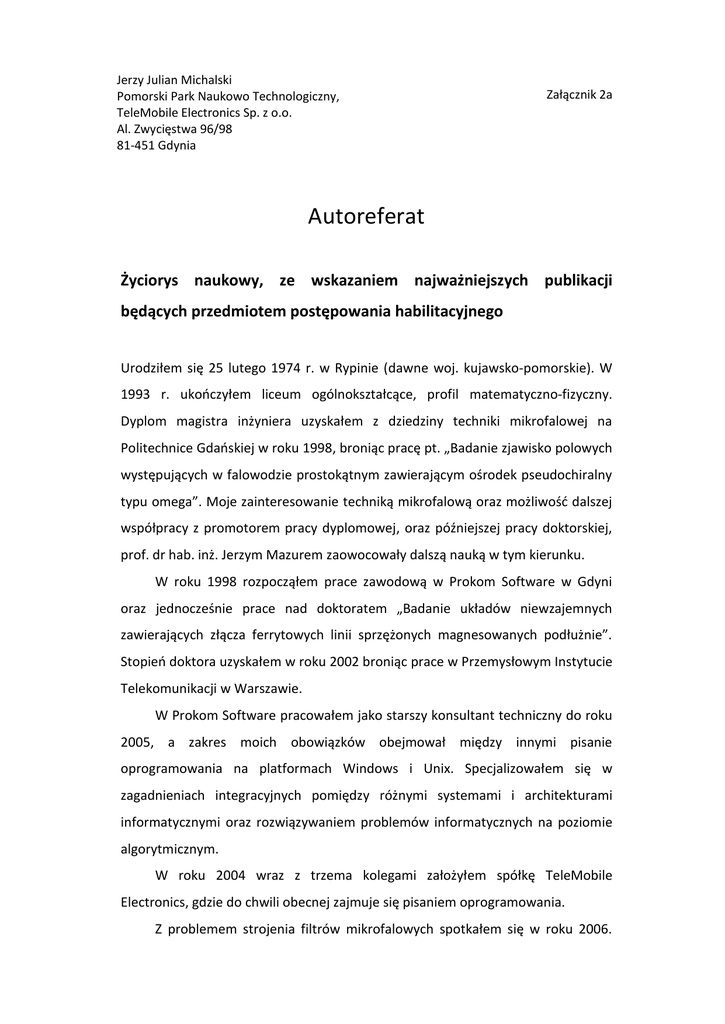 Jerzy Julian Michalski Pomorski Park Naukowo Technologiczny, TeleMobile Electronics Sp. z o.o. Al. Zwycięstwa 96/98 81-451 Gdynia Załącznik 2a Autoreferat Życiorys naukowy, ze wskazaniem najważniejszych publikacji będących przedmiotem postępowania habilitacyjnego Urodziłem się 25 lutego 1974 r. w Rypinie (dawne woj. kujawsko-pomorskie). W 1993 r. ukończyłem liceum ogólnokształcące, profil matematyczno-fizyczny. Dyplom magistra inżyniera uzyskałem z dziedziny techniki mikrofalowej na Politechnice Gdańskiej w roku 1998, broniąc pracę pt. „Badanie zjawisko polowych występujących w falowodzie prostokątnym zawierającym ośrodek pseudochiralny typu omega”. Moje zainteresowanie techniką mikrofalową oraz możliwość dalszej współpracy z promotorem pracy dyplomowej, oraz późniejszej pracy doktorskiej, prof. dr hab. inż. Jerzym Mazurem zaowocowały dalszą nauką w tym kierunku. W roku 1998 rozpocząłem prace zawodową w Prokom Software w Gdyni oraz jednocześnie prace nad doktoratem „Badanie układów niewzajemnych zawierających złącza ferrytowych linii sprzężonych magnesowanych podłużnie”. Stopień doktora uzyskałem w roku 2002 broniąc prace w Przemysłowym Instytucie Telekomunikacji w Warszawie. W Prokom Software pracowałem jako starszy konsultant techniczny do roku 2005, a zakres moich obowiązków obejmował między innymi pisanie oprogramowania na platformach Windows i Unix. Specjalizowałem się w zagadnieniach integracyjnych pomiędzy różnymi systemami i architekturami informatycznymi oraz rozwiązywaniem problemów informatycznych na poziomie algorytmicznym. W roku 2004 wraz z trzema kolegami założyłem spółkę TeleMobile Electronics, gdzie do chwili obecnej zajmuje się pisaniem oprogramowania. Z problemem strojenia filtrów mikrofalowych spotkałem się w roku 2006. Analizując literaturę fachową tej tematyki oraz przeprowadzając wywiad w fabrykach największych producentów filtrów stwierdziłem, że problem strojenia filtrów nie został do chwili obecnej w pełni rozwiązany. Z jednej strony zaproponowano metody pozwalające stroić pewne klasy filtrów. Były to zazwyczaj filtry niskiego rzędu, bądź filtry bez sprzężeń skrośnych. Z drugiej strony metody te były obarczone wadami w postaci małej skuteczności oraz/bądź małej szybkości działania. W roku 2006 rozpocząłem prace nad własnymi algorytmami do strojenia filtrów mikrofalowych, a pierwszy prototyp robota strojącego filtry uruchomiłem w roku 2007. Urządzenie zostało wyposażone w głowicę, która łączy zespół silników krokowych z zespołem śrubokrętów. Jest ona dostosowywana do każdego nowego typu filtru i może automatycznie, jednocześnie zmieniać wszystkie jego elementy strojące1. W trakcie badań zaproponowałem nowe metody strojenia. Szybkie, niezależne od topologii filtru, szerokości pasma oraz niewymagające procesu ekstrakcji parametrów, a zatem długotrwałych procesów optymalizacji dla każdej iteracji strojenia. Opracowanie tych metod poprzedziły długotrwałe badania nad metodami automatycznego strojenia na podstawie mechanizmów optymalizacji, przy pomocy zbudowanego robota. Zbadałem heurystyczne metody optymalizacji bezgradientowej w aspekcie ich zastosowania do strojenia filtrów, takie jak: algorytm genetyczny, metodę simplexu, metodę symulowanego wyżarzania, metodę Powell’a, metodę Jeeves’a i inne. Zaproponowane metody optymalizacji działają niezależnie od topologii strojonego filtru; traktują go jak „czarną skrzynkę”. W wymienionych metodach każdy element strojący jest rozpatrywany jako jedna, niezależna zmienna optymalizacji. Głównym wnioskiem wynikającym z tych badań było stwierdzenie, że przy odpowiednio skonstruowanej funkcji kosztu metody te są w zasadzie 100% zbieżne, jakkolwiek niepozbawione wad. Metody optymalizacji bezgradientowej z zasady swojego działania dochodzą do wyniku „optymalnego” za pomocą wielu iteracji, podczas których każdy z elementów strojących jest wielokrotnie zmieniany, pokonując przy tym długą drogę kątową 2. 1 Patent uzyskałem w roku 2012. Zgodnie z moją wiedzą jest to jedyne jak dotąd zbudowane urządzenie pozwalające zmieniać wszystkie elementy strojące filtru jednocześnie. 2 Przez „drogę kątową” definiuję całkowity sumaryczny, co do modułu, kąt obrotu elementu strojącego (śruby) podczas całego procesu strojenia. Fakt ten jest niepożądany ze względu na ryzyko powstawania podczas tych zmian metalowych opiłków, które mogą wpaść do wnętrza filtru. Opiłki te mogą stać się źródłem niepożądanych pasywnych produktów intermodulacji (ang. Passive InterModulation – PIM), przez co eliminują zastosowanie produkcyjne takich filtrów. Dalsze moje badania dotyczyły opracowania metody umożliwiającej wyeliminowanie wspominanej wady. Taką metodę, opracowaną przeze mnie w roku 2007, pozwalającą na automatyczne strojenie, opisałem w pracy J. J. Michalski, “Artificial Neural Networks Approach in Microwave Filter Tuning”, Progress In Electromagnetics Research M, Vol. 13, 173-188, 2010. Wykazałem, że dzięki wykorzystaniu zdolności aproksymacyjnych sztucznych sieci neuronowych (SSN) możliwe jest bezpośrednie odwzorowanie rozstrojonej charakterystyki filtru na wartości odchyłek elementów strojących, odpowiedzialnych za rozstrojenie. Dzięki temu, przynajmniej teoretycznie, można zestroić filtr podczas jednej iteracji, co minimalizuje drogę kątową elementów strojących. W ogólności metoda zaproponowana przeze mnie polega na modelowaniu, przy wykorzystaniu fizycznych wzorców (wektorów uczących sztuczna sieć neuronową), relacji charakterystyka filtru a odchyłki elementów strojących. Z uwagi na sposób budowy modelu metodykę tę nazwałem Metodą Modelu Wstecznego (MMW). W kolejnym podejściu przedstawionym w pracy J. J. Michalski, “Artificial Neural Network Algorithm for Automa