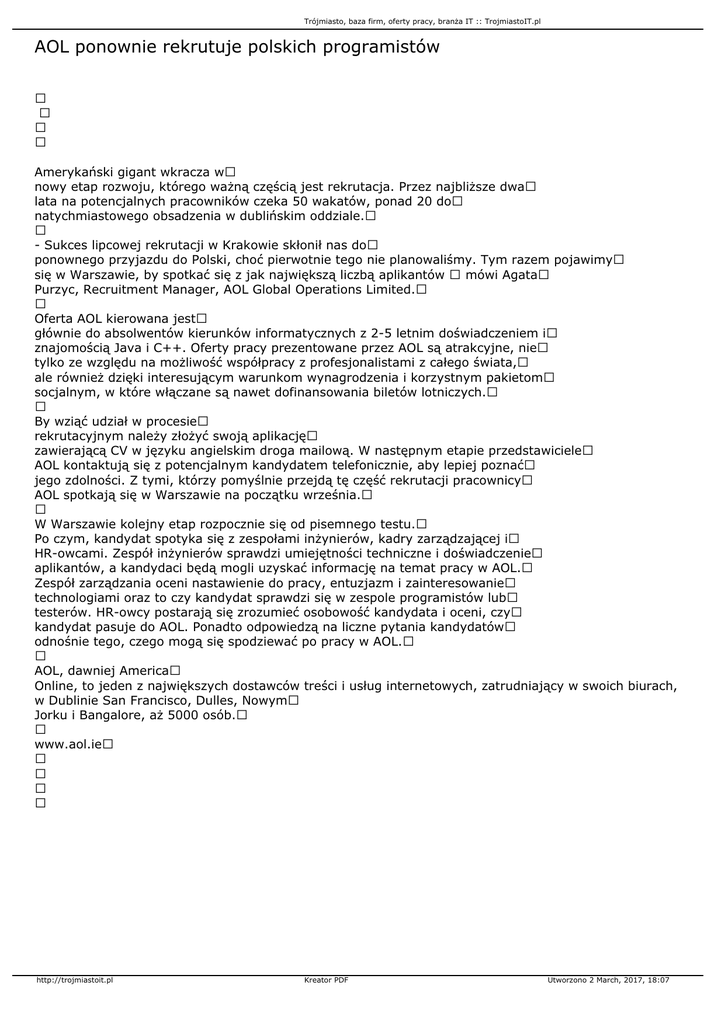Trójmiasto, baza firm, oferty pracy, branża IT :: TrojmiastoIT.pl AOL ponownie rekrutuje polskich programistów Amerykański gigant wkracza w nowy etap rozwoju, którego ważną częścią jest rekrutacja. Przez najbliższe dwa lata na potencjalnych pracowników czeka 50 wakatów, ponad 20 do natychmiastowego obsadzenia w dublińskim oddziale. - Sukces lipcowej rekrutacji w Krakowie skłonił nas do ponownego przyjazdu do Polski, choć pierwotnie tego nie planowaliśmy. Tym razem pojawimy się w Warszawie, by spotkać się z jak największą liczbą aplikantów mówi Agata Purzyc, Recruitment Manager, AOL Global Operations Limited. Oferta AOL kierowana jest głównie do absolwentów kierunków informatycznych z 2-5 letnim doświadczeniem i znajomością Java i C++. Oferty pracy prezentowane przez AOL są atrakcyjne, nie tylko ze względu na możliwość współpracy z profesjonalistami z całego świata, ale również dzięki interesującym warunkom wynagrodzenia i korzystnym pakietom socjalnym, w które włączane są nawet dofinansowania biletów lotniczych. By wziąć udział w procesie rekrutacyjnym należy złożyć swoją aplikację zawierającą CV w języku angielskim droga mailową. W następnym etapie przedstawiciele AOL kontaktują się z potencjalnym kandydatem telefonicznie, aby lepiej poznać jego zdolności. Z tymi, którzy pomyślnie przejdą tę część rekrutacji pracownicy AOL spotkają się w Warszawie na początku września. W Warszawie kolejny etap rozpocznie się od pisemnego testu. Po czym, kandydat spotyka się z zespołami inżynierów, kadry zarządzającej i HR-owcami. Zespół inżynierów sprawdzi umiejętności techniczne i doświadczenie aplikantów, a kandydaci będą mogli uzyskać informację na temat pracy w AOL. Zespół zarządzania oceni nastawienie do pracy, entuzjazm i zainteresowanie technologiami oraz to czy kandydat sprawdzi się w zespole programistów lub testerów. HR-owcy postarają się zrozumieć osobowość kandydata i oceni, czy kandydat pasuje do AOL. Ponadto odpowiedzą na liczne pytania kandydatów odnośnie tego, czego mogą się spodziewać po pracy w AOL. AOL, dawniej America Online, to jeden z największych dostawców treści i usług internetowych, zatrudniający w swoich biurach, w Dublinie San Francisco, Dulles, Nowym Jorku i Bangalore, aż 5000 osób. www.aol.ie http://trojmiastoit.pl Kreator PDF Utworzono 2 March, 2017, 18:07