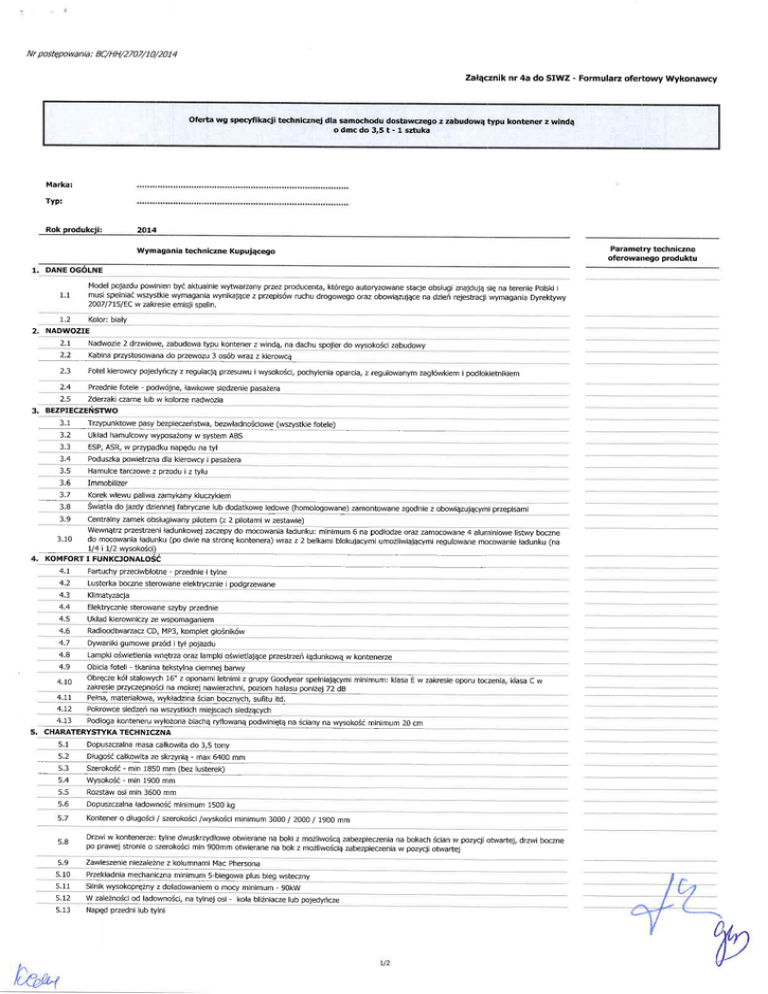 Nr postQpowan : 8C/HH/2 707/1 ia 0/20.1 4 Zalacznik nr 4a do SIWZ - Formularz ofertowy Wykonawcy oferta wg specyfikacji technicznej dla samochodu dostawczego z zabudowq typu kontener o dmc do 3,5 z windq t - 1 sztuka Marka: Tvp: Rok produkcji: 20tt4 Paramel:ry te€hniene Wymagania techniczne Kupujqcego oferowarrego produktu Model pojazdu powinien byi aktualnie wytwarzany przez producenta, kt6rego autoryzowane stacje obslugi znajdujq siq na terenie polski i musi spelniai wszystkie wymagania wynikajqce z przepis6w ruchu drogowego oraz obowiazujQce na dziei rejestracji wymagania Dyrektywy 20071715/EC w zaktesie emisji spalin. L2 2. 3, Kolor: bialy NADWOZIE 2'l 2.2 2'3 Fotel kierowcy pojedyfrczy z regulacjE przesuwu i wysoko6ci, pochylenia oparcia, z regulowanym zagl6wkiem i podlokietnikiem 2.4 2.5 Zderzaki czarne lub w kolorze nadwozia Nadwozie 2 drzwiowe, zabudowa typu kontener z windq, na dachu spojler do wysokosci zabudowy Kabina przystNwana do przewozu 3 os6b wraz z kierowcQ Przednie fotele - podw6jne, lawkowe siedzenie pasa2era BEZPIECZENSTWO 3.1 3.2 3.3 3.4 3.5 3.6 3.7 3.8 _ Uklad hamulcowy wyposa2ony w system ABS ESP, ASR, Hamulce tarczowe z przodu i z tylu Immobilizer Korek wlewu paliwa zamykany kluczykiem Swiatla do jazdy dziennej fabryczne trO OoOatto*e reOowe (homologowane) zamontowane zgodnie z obowiQzujqcymi przepisami Centralny zamek obslugiwany pilotem (z 3.10 KOMFORT 4.5 4,6 4,7 4.8 4.9 4t0 4.11 4.12 4'r3 1/4 | 1/2 wysokoilD FUNKCJONALOSd I Faduchy przeciwblotne - przednie i tylne Lusterka boczne sterowane elektrycznie i podgrzewane Klimatyzacja Elektrycznie sterowane szyby przednie Uklad kierowniczy ze wspomaganiem Radioodtwarzacz CD, MP3, komplet 9lo5nik6w Dywaniki gumowe przod i tyl polazdu Lampki oswietlenia wnqtrza oraz lampki oswietlajEce przestrzeh lqdunkowa w kontenerze Obicia foteli - tkanina tekstylna ciemnej bamy Obrqcze k6l stalowych 16" z oponami letnimi z grupy coodye;r spetril;jqcymtrnnhum: klasa ,alresE !tryg4tllS;ci na mokrej nawterzchni, poziom halasu poni2ej 72 dB ___ 5.2 s.3 5.4 5.5 5.6 i w zakresie oporu toczenia, klasa C w Pelna, materia-lolva,uykladzina scian bocznych, suntu itd. Pokrowce siedzei na wszystkich miejscach siedzqcych Podloga konteneru wyloiona blacha ryflowanq podwiniqta na jciany na wysokosi minimum zo cm CHARATERYSryKA TECH 5.1 i pitot*i *l"rtu*iul WewnEtrz przestrzeni ladunkowej zaczepy do mcowania ladunku: mininrurn 6 na podlodze oraz zamocowane 4 alunliniowe listwv oczne do mocowania ladunku (po dwie na stronq kontenera) wraz z 2 belkami blokujacymi umo2liwiajacymi requlowane mocowanie ladunku rna _ 4.4 w przypadku napQdu na tyl Poduszka powietrzna dla kierowcy i pasa2era 3.9 4,7 4,2 4.3 Trzypunktowe pasy bezpieczeistwa, bezwladno6ciowe (wszystkie fotele) N ICZNA Dopuszczalna masa calkowita do 3,5 tonv skrzyniq _D!!g9scl9!ko$1ze Szerokosi - min - max 6400 mm :t8sryI]be4lsreq) Wysoko6c - min 1900 mm Rozstaw osi min:1600 mm Dopuszczalna ladownogi minimum 1500 kq Kontener o dlugo6ci / szeroko6ci /wyskogci minimum 3000 / 2000 / 1900 mm 5.8 Drzwi w kontenerze: tylne dwuskrzydlowe otwierane na boki z mo2liwo6cE zabezpieczenia na bokach scian w pozycji otwartej, drzwi btrzne po prawej stronie o:;zeroko5ci min 900mm otwierane na bok z mo2liwo6ciq zabezpieczenia w pozycji otwartej 59 Zawieszenie niezale2ne z kolumnami Mac phersona 510 Przekladnia mechaniczna minimum s-biegowa plus bieg wsteczny 5.11 Silnik wysokoprq2ny z dotadowaniem o mocv minimum - 90kW 5.12 \,4/-lg!9znq!Lql ladowno6ci, na tylnej osi Naped przedni lub tylni JJJ - kola btiiniacze tub pojedyhcze 6, WYPOSAzENIE DODATKOWE 6.L wl,!'da:aladov/cza o udiwigu minimum 700 kg, sterowaniezzewnqtrzorczza pomocQ sterownika na przewodzie rozciqganym spiralnym z ucnwytem mocujEcym w konteneze, o szeroko6ci r6wnej szeroko6ci zabudow 6.3 6.4 Kolo zapasowe pelnowymiarowe e oporu toczenia, klasa ca5nica, tr6jkqtostftegawczy,podno6nik, 6.5 6.6 7, oznaczenie poprzez umieszczenie, na bokach oraz na tyle samochod6w, logo firmowego zgodnego z dolEczonym do specyfikacji wzorem DOKUMENTAOA 7.L 7.2 7 '3 7.4 7.5 Instrukcja obslugi pojazdu w jQzyku polskim Dokumenty niezbqclne do rejestracji pojazdu Instrukcje obslugi zamontowanych dodatkowych uzqdzeh wyposa2enia, DTR windy, wymagane dopuszczenia UDT Karta gwaranqdna samochodu oraz zamontowanych urzadzei dodatowch Katalog Cena PLN netto/ szt. slownie: Cena PLN butto/ szt. , slownie: warto66 PLN netto sfownte: Warunki gwarancji - mechaniczna (bez limitu kilometr6w) - lakier - nadwozie, zabudowa Termin dostawy pojazdut dni od dnia podpisania umowy ceny wskazane w formula|zu uwzglqdniaiq wszystkie koszty zwiqzane z realizaciqdostawy, Zapoznali6my siq z tre5ciE zaproszenia do zlo2enia oferty oraz 2e przyjmujemy bez zastrze2ei wymagania zawarte w jego tre6ci. Wszelkq korespondencjQ w sprawie postqpowania o udzielenie zamdwienia nalezy kierowai na nastQpujQcy adres: Podpis(y) o$by (os6b) uprawnionej(ych) do reprsentowania Wykonawcy Miejscowo6d datal