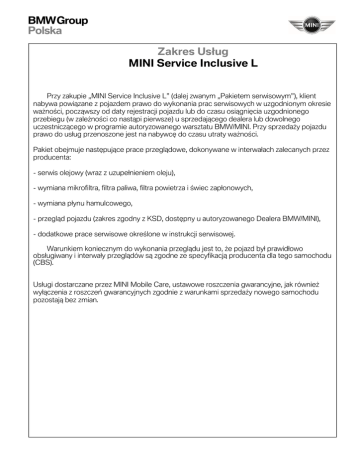 BMW Group Polska Zakres Usług MINI Service Inclusive L Przy zakupie „MINI Service Inclusive L” (dalej zwanym „Pakietem serwisowym”), klient nabywa powiązane z pojazdem prawo do wykonania prac serwisowych w uzgodnionym okresie ważności, począwszy od daty rejestracji pojazdu lub do czasu osiągnięcia uzgodnionego przebiegu (w zależności co nastąpi pierwsze) u sprzedającego dealera lub dowolnego uczestniczącego w programie autoryzowanego warsztatu BMW/MINI. Przy sprzedaży pojazdu prawo do usług przenoszone jest na nabywcę do czasu utraty ważności. Pakiet obejmuje następujące prace przeglądowe, dokonywane w interwałach zalecanych przez producenta: - serwis olejowy (wraz z uzupełnieniem oleju), - wymiana mikrofiltra, filtra paliwa, filtra powietrza i świec zapłonowych, - wymiana płynu hamulcowego, - przegląd pojazdu (zakres zgodny z KSD, dostępny u autoryzowanego Dealera BMW/MINI), - dodatkowe prace serwisowe określone w instrukcji serwisowej. Warunkiem koniecznym do wykonania przeglądu jest to, że pojazd był prawidłowo obsługiwany i interwały przeglądów są zgodne ze specyfikacją producenta dla tego samochodu (CBS). Usługi dostarczane przez MINI Mobile Care, ustawowe roszczenia gwarancyjne, jak również wyłączenia z roszczeń gwarancyjnych zgodnie z warunkami sprzedaży nowego samochodu pozostają bez zmian.