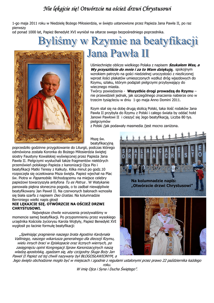 Nie lękajcie się! Otwórzcie na oścież drzwi Chrystusowi 1-go maja 2011 roku w Niedzielę Bożego Miłosierdzia, w święto ustanowione przez Papieża Jana Pawła II, po raz pierwszy od ponad 1000 lat, Papież Benedykt XVI wyniósł na ołtarze swego bezpośredniego poprzednika. Uśmiechnięte oblicze wielkiego Polaka z napisem Szukałem Was, a Wy przyszliście do mnie i za to Wam dziękuję, spokojnym wzrokiem patrzyło na gości niedzielnej uroczystości z niezliczonej wprost ilości plakatów umieszczonych wzdłuż dróg wjazdowych do Rzymu, szlaku, którym podążali pielgrzymi przybywający do wiecznego miasta. Twórcy powiedzenia - Wszystkie drogi prowadzą do Rzymu – nie przewidzieli jednak, jak szczególnego znaczenia nabierze ono w trzecim tysiącleciu w dniu 1-go maja Anno Domini 2011. Rzym stał się na dobę drugą stolicą Polski, taka ilość rodaków Jana Pawła II przybyła do Rzymu z Polski i całego świata by oddać hołd Janowi Pawłowi II i cieszyć się Jego beatyfikacją. Liczba 80 tys. pielgrzymów z Polski /jak podawały masmedia /jest mocno zaniżona. Mszę św. beatyfikacyjną poprzedziło godzinne przygotowanie do Liturgii, podczas którego odmówiona została Koronka do Bożego Miłosierdzia świętej siostry Faustyny Kowalskiej wyświęconej przez Papieża Jana Pawła II. Pielgrzymi wysłuchali także fragmentów niektórych przemówień polskiego Papieża z kanonizacji Ojca Pio i beatyfikacji Matki Teresy z Kalkuty. Kilka minut po godz.10 rozpoczęła się oczekiwana Msza święta. Papież wjechał na Plac św. Piotra w Papamobile. Wchodzącemu na miejsce celebry papieżowi towarzyszyła antyfona Tu es Petrus . W Watykanie panowała piękna słoneczna pogoda, o to zadbał niewątpliwie beatyfikowany Jan Paweł II. Na czerwonych balonach wznosiła się biała szarfa z napisem Deo Gratias. Na kolumnadzie Berniniego wielki napis głosił NIE LĘKAJCIE SIĘ. OTWÓRZCIE NA OŚCIEŻ DRZWI CHRYSTUSOWI. Największe chwile wzruszenia przeżywaliśmy w momencie samej beatyfikacji. Po przypomnieniu przez wysokiego urzędnika Kościoła życiorysu Karola Wojtyły, Papież Benedykt XVI wygłosił po łacinie formułę beatyfikacji: Na kolumnadzie napis: „Otwórzcie drzwi Chrystusowi” „Spełniając pragnienie naszego brata Agostino Kardynała Valliniego, naszego wikariusza generalnego dla diecezji Rzymu, wielu innych braci w Episkopacie oraz licznych wiernych, po zasięgnięciu opinii Kongregacji Spraw Kanonizacyjnych naszą władzą apostolską, zgadzam się, aby czcigodny Sługa Boży Jan Paweł II Papież od tej chwili nazywany był BŁOGOSŁAWIONYM, a Jego święto obchodzone mogło być w miejscach i zgodnie z regułami ustalonymi przez prawo 22 października każdego roku. W imię Ojca i Syna i Ducha Świętego”. Po tych słowach Papieża, po których nastąpiło odsłonięcie portretu Jana Pawła II umieszczonego na Bazylice św. Piotra, zapanowała prawdziwa euforia. Poczuliśmy się bardzo szczęśliwi, wiele osób wokół nas płakało, nikt nie krył wzruszenia. Polacy, Włosi i wszyscy inni pielgrzymi z całego świata ocierali łzy szczęścia. Tysiące powiewających flag, transparentów i portretów z wizerunkiem nowego błogosławionego potwierdzało tę radość. Z głośników popłynął hymn beatyfikacyjny dla Błogosławionego Jana Pawła II: Aprite le porte a Cristo non abbiate paura Spalancate il vostro cuore all'Amore di Dio Otwórzcie drzwi Chrystusowi nie lękajcie się Otwórzcie na oścież swe serca na Bożą miłość Bazlika św. Piotra z portretem Jana Pawła II Plac św. Piotra, przed olbrzymim portretem Jana Pawła II Na ten dzień czekaliśmy przecież sześć lat i teraz możemy zawtórować wraz z psalmistą: „Oto jest dzień, który dał nam Pan, weselmy się i radujmy się w nim”. W homilii na ten szczególny dzień Papież Benedykt XVI powiedział między innymi: …” Tę drugą Niedzielę Wielkanocną błogosławiony Jan Paweł II ogłosił Niedzielą Bożego Miłosierdzia. Została ona wybrana na dzisiejszą uroczystość, ponieważ mój poprzednik z wyroku Opatrzności oddał ducha Bogu właśnie w wigilię tej niedzieli. Ponadto dziś jest pierwszy dzień maja, miesiąca maryjnego, jest to również wspomnienie św. Józefa Robotnika. Wszystkie te okoliczności wzbogacają naszą modlitwę, pomagają nam, którzy jesteśmy pielgrzymami w czasie i przestrzeni. O ile bardziej świętują Aniołowie i Święci w Niebie. Jednak jeden jest Bóg, jeden Chrystus Pan, który niczym most łączy Ziemię z Niebem a my czujemy się w tym momencie bardziej niż kiedykolwiek uczestnikami niebieskiej Liturgii”. Papież Jan Paweł II wita nas na lotnisku w Rzymie słowami – Szukałem Was a Wy przyszliście do mnie i za to Wam dziękuję. Dalej zaś przytoczył słowa, od których Papież Polak rozpoczął swoją posługę: „Nie lękajcie się, otwórzcie drzwi Chrystusowi”. Przypomniał też wydarzenia sprzed 6-ciu laty, kiedy umarł Jan Paweł II. ...”Już tamtego dnia czuliśmy unoszącą się woń świętości a lud Boży na różne sposoby okazywał swoją cześć dla Jana Pawła II. Dlatego chciałem, aby przy koniecznym poszanowaniu prawa Kościoła jego proces beatyfikacyjny przebiegał w sposób możliwie najszybszy. I oto nadszedł dzień oczekiwany, przyszedł szybko, ponieważ tak podobało się Bogu i Jan Paweł II jest błogosławiony” -powiedział Papież Benedykt XVI. Przypomniał też, że sam miał okazję przez 23 lata współpracować z Janem Pawłem II pracując w Kongregacji Nauki Wiary. „ .. Moja posługa była wspierana jego głęboką duchowością i bogactwem jego intuicji. Zawsze uderzał mnie i budował przykład jego modlitwy, zanurzał się w spotkaniu z Bogiem pomimo rozlicznych trudności jego posługiwania. (…) Błogosławiony jesteś umiłowany Papieżu Janie Pawle II ponieważ uwierzyłeś. Prosimy, byś nadal umacniał z nieba Wiarę ludu bożego, który pragnął tutaj Tw
