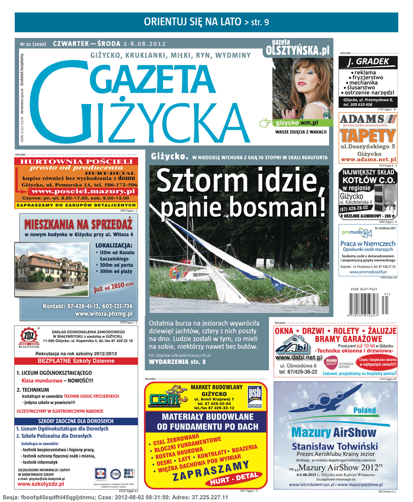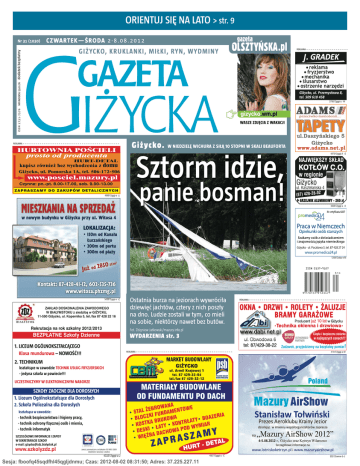 ORIENTUJ SIĘ NA LATO > str. 9 Nr 31 (1030) C ZWA RT EK—Ś RODA 2 - 8 . 0 8 . 2 0 1 2 REKLAMA -------------------- NR INDEKSU 350176 dodatek bezpłatny GIŻYCKO, KRUKLANKI, MIŁKI, RYN, WYDMINY I SS N 1731-7576 370612gggi-a -W WASZE ZDJĘCIA Z WAKACJI REKLAMA ---------------------------------------------- HURTOWNIA POŚCIELI prosto od producenta Giżycko. Sztorm idzie, HURT-DETAL kupisz również bez wychodzenia z W NIEDZIELĘ WICHURA Z SIŁĄ 10 STOPNI W SKALI BEAUFORTA domu Giżycko, ul. Pomorska 1A, tel. 506-172-506 www.posciel.mazury.pl Czynne: pn.-pt. 8.00-17.00, sob. 9.00-13.00 panie bosman! Z A P R A S Z A M Y D O Z A KU P Ó W D E TA L I C Z N YC H 496912gggi-a -S 497012gggi-A -S NAJWIĘKSZY SKŁAD KOTŁÓW C.O. w regionie Giżycko ul. Kasztelańska 4 (87) 428-28-02 GRZEJNIK ALUMINIOWY - 260 zł 500612gggi-a -K w nowym budynku w Giżycku przy ul. Witosa 4 LOKALIZACJA: • 150m od Kanału Łuczańskiego • 200m od portu • 300m od plaży 126912otba-e-M 2 850 zł/m Już od 2 Kontakt: 87-428-41-12, 602-535-736 www.witosa.phzmg.pl 503912gggi-a -C ZAKŁAD DOSKONALENIA ZAWODOWEGO W BIAŁYMSTOKU z siedzibą w GIŻYCKU, 11-500 Giżycko, ul. Kopernika 5, tel./fax 87 428 22 16 Rekrutacja na rok szkolny 2012/2013 Ostatnia burza na jeziorach wywróciła dziewięć jachtów, cztery z nich poszły na dno. Ludzie zostali w tym, co mieli na sobie, niektórzy nawet bez butów. Fot. Zbigniew Jatkowski/mazury info.pl WYDARZENIA str. 3 BEZPŁATNE Szkoły Dzienne 1. LICEUM OGÓLNOKSZTAŁCĄCEGO Klasa mundurowa – NOWOŚĆ!!! REKLAMA ---------------------------------------------- OKNA • DRZWI • ROLETY • ŻALUZJE BRAMY GARAŻOWE Producent już 10 lat w Giżycku •Technika okienna i drzwiowa• Ciepła i bezpieczna stolarka ul. Obwodowa 6 tel: 87/429-38-22 ---------------------------------------------- w najlepszych cenach!!! Zadzwoń, przyjedziemy na bezpłatny pomiar! 414412gggi-a-M MARKET BUDOWLANY 2. TECHNIKUM GIŻYCKO kształcące w zawodzie TECHNIK USŁUG FRYZJERSKICH - jedyna szkoła w powiecie!!! UCZESTNICZYMY W ELEKTRONICZNYM NABORZE ul. Armii Krajowej 1 tel. 87 429-32-64 tel./fax 87 429-32-12 MATERIAŁY BUDOWLANE OD FUNDAMENTU PO DACH SZKOŁY ZAOCZNE DLA DOROSŁYCH 1. Liceum Ogólnokształcące dla Dorosłych 2. Szkoła Policealna dla Dorosłych ANA EBROW MENTOWE Ż L A T •S NDA RIA ZKI FU BOAZE OWA • BLOC K • U Y T R A B Ł KA ONTR R • KOST ATY • K POD WYMIA Ł • I K S A E W D O • H BA DAC • WIĘŹ kształcąca w zawodzie: - technik bezpieczeństwa i higieny pracy, - technik ochrony fizycznej osób i mienia, - technik informatyk SZCZEGÓŁOWE INFORMACJE I ZAPISY W SEKRETARIACIE SZKOŁY e-mail: [email protected] www.szkolyzdz.pl REKLAMA Jakość poświadczona certyfikatem ISO 9001:2009 działalności kursowej i szkolnej Z SZA A R P A MY L - DETA HURT 433312gggi-a-J Sesja: fboofq45sqdfhl45qgljdnmu; Czas: 2012-08-02 08:31:50; Adres: 37.225.227.11 495712gggi-a -C 95512ewww-b-J 2 ZS TNRAOS ZNEYJ G I Z YC KO.W M . P L G A Z E T A G I Ż Y C K A 2-8 SIERPNIA 2012 Przed nami intensywny (hałaśliwy) weekend. Dwie duże imprezy - Festiwal Hip-Hop i Mazury AirShow - przyciągną do Giżycka tłumy gości. Podobnie było w ubiegłym roku. Ulice i pola biwakowe pełne głównie młodych ludzi żyły dniem i nocą. Niektórzy oczywiście nie wyobrażali sobie zabawy bez alkoholu.... Katarzyna Tomaszewicz redaktor naczelna Policja i pozostałe służby zapewne są przygotowane do najazdu na Giżycko i zapewnią wszystkim bezpieczną zabawę. Ale o bezpieczeństwie przede wszystkim muszą pomyśleć sami imprezowicze. Wydarzenia weekendowe zapowiadamy na stronie 9. SKONTAKTUJ SIĘ Z NAMI gizycko.wm.pl EWA BREZGIEŁ BIURO OGŁOSZEŃ tel. 87 428 38 17 [email protected] dołącz do dyskusji WASZYM ZDANIEM Wichura wywracała jachty 10 w skali Beauforta - wiatr o takiej sile przeszedł przez jeziora w naszym regionie. Nawałnica przyszła od Jeziora Nidzkiego, poprzez Bełdany, Śniardwy, Mikołajskie po Niegocin. Nad Mamrami i Darginem już takiej siły nie miała, ale i tu doszło do wywrotek łodzi. tata Kazika: co to za żeglarze, co ich taka burza zaskoczyła? Z daleka było widać jaka nawałnica zaraz przejdzie. Mało tego, niektórzy na rowerach wodnych postanowili jeszcze wypłynąć na jezioro. Wrócili tuż przed uderzeniem wiatru - idioci fdfd: Apokalipsa, nadchodzi koniec świata!!! Komentator: To zwalone drzewo, to „chwała“ dla przykuwających się pseudoekologów. A jak by było pięknie, gdyby pod nim leżał jakiś trupek? NA TWIERDZY BEZ WALKI SIĘ NIE OBEJDZIE JEST NAS CORAZ WIĘCEJ NA giżycko.wm.pl PIERWSZE PÓŁROCZE 2011 176 886 UU 295 853 UU UNIKALNYCH UŻYTKOWNIKÓW UNIKALNYCH UŻYTKOWNIKÓW SONDA TYGODNIA SEZON NA PÓŁMETKU. JAK GO OCENIAMY? Pusto na plażach, polach namiotowych i w kwaterach dla turystów - pierwsza połowa sezonu letniego nie zachwycała. Starty zaczęli już liczyć kwaterodawcy i właściciele wypożyczalni sprzętu wodnego. Czy uda się je odrobić? Ostatni miesiąc nie był udany, wielu turystów rezygnowało z przyjazdu na Mazury i odwoływało rezerwacje. Czy w ubiegłych latach było lepiej, czy podobnie? Ocena sezonu na półmetku była tematem naszej cotygodniowej sondy, którą zamieściliśmy na stronie internetowej gizycko.wm.pl. Według 35,63 proc. sezon jest fatalny i tak złego dawno nie było. Nieco mniej, bo 27,5 proc. uważa, że jest dobrze i nie ma powodu do narzekań. Według 24,38 proc. w ubiegłych latach było nieco lepiej, natomiast 12,5 proc. głosujących uważa, że jest w miarę dobrze, a ubiegłe sezony były podobne. Zuzanna Ołdakowska moks: A co właściciele plaż, pół namiotowych i kwater proponują w deszczowe dni ? ... no właśnie! ACE: Racja, jak pada wieje nudą. Nie ma co robić na Mazurach w deszcz. Zero przyjemności z żeglowania, o polu namioto- lowych parkingach - no chyba że się mylę i są tam teraz giełdy samochodowe :) Nawet niezbyt ekskluzywny Wodnik ma swoich gości. Porty równ