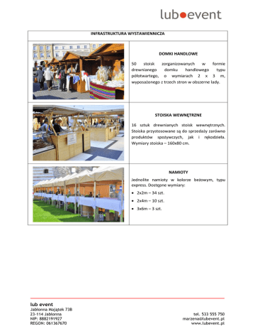 INFRASTRUKTURA WYSTAWIENNICZA DOMKI HANDLOWE 50 stoisk zorganizowanych w formie drewnianego domku handlowego typu półotwartego, o wymiarach 2 x 3 m, wyposażonego z trzech stron w obszerne lady. STOISKA WEWNĘTRZNE 16 sztuk drewnianych stoisk wewnętrznych. Stoiska przystosowane są do sprzedaży zarówno produktów spożywczych, jak i rękodzieła. Wymiary stoiska – 160x80 cm. NAMIOTY Jednolite namioty w kolorze beżowym, typu express. Dostępne wymiary: 2x2m – 34 szt. 2x4m – 10 szt. 3x6m – 3 szt. lub event Jabłonna Majątek 73B 23-114 Jabłonna NIP: 8882191927 REGON: 061367670 tel. 533 555 750 [email protected] www.lubevent.pl TECHNIKA ESTRADOWA PODESTY SCENICZNE Moduły wielkości 1x2m do dowolnej aranżacji sceny, wybiegu, platformy do warsztatów i pokazów. W komplecie nogi w dwóch wysokościach: 40-60cm oraz 80-130cm oraz schodki. SCENA Podesty sceniczne z zadaszeniem na imprezy plenerowe. Dostępne wymiary: - 5x5m - 5x7m - 10x10m OŚWIETLENIE Światła kolorowe typu LED 40 szt. Oświetlacze sceniczne 4 szt. Listwy LED Synchronizacja komputerowa z muzyką NAGŁOŚNIENIE Profesjonalne nagłośnienie z obsługą akustyka: wydarzenia kameralne oraz zespoły riderowe. lub event Jabłonna Majątek 73B 23-114 Jabłonna NIP: 8882191927 REGON: 061367670 tel. 533 555 750 [email protected] www.lubevent.pl ELEKTRYKA Kompleksowe przygotowanie i obsługa w zakresie zabezpieczenia energii elektrycznej na eventach, wraz z obsługą elektryka. agregaty prądotwórcze rozdzielnie prądu skrzynki licznikowe kable elektryczne siłowe i przedłużacze najazdy kablowe 25m halogeny 40 szt. lub event Jabłonna Majątek 73B 23-114 Jabłonna NIP: 8882191927 REGON: 061367670 tel. 533 555 750 [email protected] www.lubevent.pl WYPOSAŻENIE DODATKOWE KRZESŁA 300 szt. krzeseł składanych, kolor czarny. STOŁY 20 białych stołów plastikowych o wymiarach 180x60cm KOMPLETY BAWARSKIE 16 kompletów złożonych ze stołu o wymiarach 220x60cm oraz dwóch ław. Jeden komplet przeznaczony jest dla 6-8 osób. PODESTY DREWNIANE 36 szt. modułów o wymiarach 240x100cm. Zastosowanie przy budowie podestów do tańczenia, podłogi w namiotach, wyrównania terenu. lub event Jabłonna Majątek 73B 23-114 Jabłonna NIP: 8882191927 REGON: 061367670 tel. 533 555 750 [email protected] www.lubevent.pl WYPOSAŻENIE DODATKOWE WYKŁADZINY Estetyczne wykładziny w różnych kolorach oraz sztuczna trawa. WYPOSAŻENIE PLACU ZABAW małe kolorowe stoliki miękkie pufy do siedzenia kolorowa mata piankowa siedziska z półeczkami na buty /do wykorzystania również jako regały ekspozycyjne/ boblesy – klocki piankowe mega bierki, domino, jenga, gra w klasy TABLICE DO RYSOWANIA 10 szt. dwustronnych tablic – czarna do rysowania kredą oraz biała do rysowania flamastrami. SZTALUGI 10 szt. drewnianych sztalug do ekspozycji zdjęć, plakatów, prac plastycznych itp. lub event Jabłonna Majątek 73B 23-114 Jabłonna NIP: 8882191927 REGON: 061367670 tel. 533 555 750 [email protected] www.lubevent.pl DEKORACJE OZDOBY BOŻONARODZENIOWE bramy jarmarkowe 2 szt. girlandy zielone z ozdobami światełka choinkowe przystosowane do warunków zewnętrznych bombki choinkowe – różne zestawy kolorystyczne żywe świerki w donicach oraz cięte stojaki na choinki OZDOBY WIELKANOCNE kury z siana, naturalnej wielkości kura z siana wys. 2,5m wierzby mandżurskie z dekoracjami wystawa fotografii obrzędów wielkanocnych /10 kolorowych zdjęć na piance pcv, format 50x70cm/ wianki wielkanocne DEKORACJE KWIATOWE kompozycje z wykorzystaniem żywych kwiatów eleganckie stojaki ze szklanymi wazonami/świecznikami duże donice plastikowe – 5 szt. zielonych, 5 szt. białych KOLOROWE KULE LED 16 kompletów kolorowych kul LED. Zastosowanie jako dekoracja podestu do tańczenia, drzew na imprezie plenerowej itp. lub event Jabłonna Majątek 73B 23-114 Jabłonna NIP: 8882191927 REGON: 061367670 tel. 533 555 750 [email protected] www.lubevent.pl AKCJE PROMOCYJNE STUDIO FOTOGRAFICZNE Profesjonalne mobilne studio fotograficzne: - lampy z parasolkami - wysokiej jakości aparat fotograficzny - drukarka fotograficzna - obsługa fotografa MAGNESY REKLAMOWE Mobilne stanowisko do produkcji magnesów reklamowych, które mogą powstawać w trakcie eventu na bazie zdjęć wykonywanych uczestnikom wydarzenia. STOISKO PROMOCYJNE Pawilon ogrodowy z podestem o wymiarach 4x5m. Wyposażenie: - stolik kawowy i fotele - stół do ekspozycji materiałów promocyjnych - grafiki reklamowe Możliwość indywidualnej aranżacji przestrzeni. lub event Jabłonna Majątek 73B 23-114 Jabłonna NIP: 8882191927 REGON: 061367670 tel. 533 555 750 [email protected] www.lubevent.pl