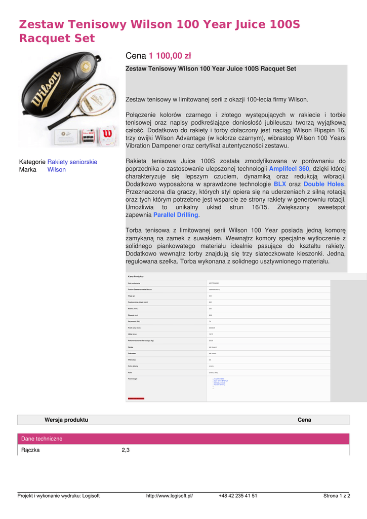 Zestaw Tenisowy Wilson 100 Year Juice 100S Racquet Set Cena 1 100,00 zł Zestaw Tenisowy Wilson 100 Year Juice 100S Racquet Set Zestaw tenisowy w limitowanej serii z okazji 100-lecia firmy Wilson. Połączenie kolorów czarnego i złotego występujących w rakiecie i torbie tenisowej oraz napisy podkreślające doniosłość jubileuszu tworzą wyjątkową całość. Dodatkowo do rakiety i torby dołaczony jest naciąg Wilson Ripspin 16, trzy owijki Wilson Advantage (w kolorze czarnym), wibrastop Wilson 100 Years Vibration Dampener oraz certyfikat autentyczności zestawu. Kategorie Rakiety seniorskie Marka Wilson Rakieta tenisowa Juice 100S została zmodyfikowana w porównaniu do poprzednika o zastosowanie ulepszonej technologii Amplifeel 360, dzięki której charakteryzuje się lepszym czuciem, dynamiką oraz redukcją wibracji. Dodatkowo wyposażona w sprawdzone technologie BLX oraz Double Holes. Przeznaczona dla graczy, których styl opiera się na uderzeniach z silną rotacją oraz tych którym potrzebne jest wsparcie ze strony rakiety w generowniu rotacji. Umożliwia to unikalny układ strun 16/15. Zwiększony sweetspot zapewnia Parallel Drilling. Torba tenisowa z limitowanej serii Wilson 100 Year posiada jedną komorę zamykaną na zamek z suwakiem. Wewnątrz komory specjalne wytłoczenie z solidnego piankowatego materiału idealnie pasujące do kształtu rakiety. Dodatkowo wewnątrz torby znajdują się trzy siateczkowate kieszonki. Jedna, regulowana szelka. Torba wykonana z solidnego usztywnionego materiału. Karta Produktu Kod producenta WRT7226002 Poziom Zaawansowania Gracza zaawansowany Waga (g) 304 Powierzchnia główki (cm2) 645 Balans (mm) 320 Długość (cm) 68,6 Sztywność (RA) 74 Profil ramy (mm) 25/26/25 Układ strun 16/15 Rekomendowana siła naciągu (kg) 25-29 Naciąg tak (luzem) Pokrowiec tak (torba) Wibrastop tak Kolor główny czarny Kolor czarny, złoty Technologie Amplifeel 360 BLX WITH BASALT DOUBLE HOLE Parallel Drilling Rakieta na zamówieni Wersja produktu Cena Dane techniczne Rączka Projekt i wykonanie wydruku: Logisoft 2,3 http://www.logisoft.pl/ +48 42 235 41 51 Strona 1 z 2 Cena dla stałego klienta: 1100 W podobnej cenie Head Graphene XT Speed MP A 2 SZTUKI 1 190,00 zł Head Graphene XT Speed Rev Pro 2 SZTUKI 1 190,00 zł Head Graphene XT Speed Pro 2 SZTUKI 1 190,00 zł Head Graphen XT Speed S 2 SZTUKI 1 090,00 zł Babolat PURE AERO TEAM 2 SZTUKI 1 168,00 zł Babolat Pure Aero LITE 2 SZTUKI 1 098,00 zł Projekt i wykonanie wydruku: Logisoft Powered by TCPDF (www.tcpdf.org) http://www.logisoft.pl/ +48 42 235 41 51 Strona 2 z 2
