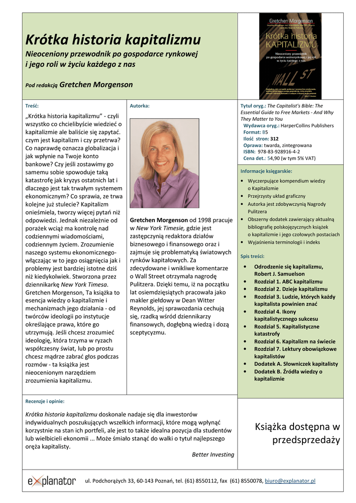 Krótka historia kapitalizmu Nieoceniony przewodnik po gospodarce rynkowej i jego roli w życiu każdego z nas Pod redakcją Gretchen Morgenson Treść: Autorka: „Krótka historia kapitalizmu” - czyli wszystko co chcielibyście wiedzieć o kapitalizmie ale baliście się zapytać. czym jest kapitalizm i czy przetrwa? Co naprawdę oznacza globalizacja i jak wpłynie na Twoje konto bankowe? Czy jeśli zostawimy go samemu sobie spowoduje taką katastrofę jak kryzys ostatnich lat i dlaczego jest tak trwałym systemem ekonomicznym? Co sprawia, ze trwa kolejne już stulecie? Kapitalizm onieśmiela, tworzy więcej pytań niż odpowiedzi. Jednak niezależnie od porażek wciąż ma kontrolę nad codziennymi wiadomościami, codziennym życiem. Zrozumienie naszego systemu ekonomicznegowłączając w to jego osiągnięcia jak i problemy jest bardziej istotne dziś niż kiedykolwiek. Stworzona przez dziennikarkę New York Timesa. Gretchen Morgenson, Ta książka to esencja wiedzy o kapitalizmie i mechanizmach jego działania - od twórców ideologii po instytucje określające prawa, które go utrzymują. Jeśli chcesz zrozumieć ideologię, która trzyma w ryzach współczesny świat, lub po prostu chcesz mądrze zabrać głos podczas rozmów - ta książka jest nieocenionym narzędziem zrozumienia kapitalizmu. Tytuł oryg.: The Capitalist's Bible: The Essential Guide to Free Markets - And Why They Matter to You Wydawca oryg.: HarperCollins Publishers Format: B5 Ilość stron: 312 Oprawa: twarda, zintegrowana ISBN: 978-83-928916-4-2 Cena det.: 54,90 (w tym 5% VAT) Informacje księgarskie: Gretchen Morgenson od 1998 pracuje w New York Timesie, gdzie jest zastępczynią redaktora działów biznesowego i finansowego oraz i zajmuje się problematyką światowych rynków kapitałowych. Za zdecydowane i wnikliwe komentarze o Wall Street otrzymała nagrodę Pulitzera. Dzięki temu, iż na początku lat osiemdzięsiątych pracowała jako makler giełdowy w Dean Witter Reynolds, jej sprawozdania cechują się, rzadką wśród dziennikarzy finansowych, dogłębną wiedzą i dozą sceptycyzmu. • Wyczerpujące kompendium wiedzy o Kapitalizmie • Przejrzysty układ graficzny • Autorka jest zdobywczynią Nagrody Pulitzera • Obszerny dodatek zawierający aktualną bibliografię polskojęzycznych książek o kapitalizmie i jego czołowych postaciach • Wyjaśnienia terminologii i indeks Spis treści: • • • • • • • • • • Odrodzenie się kapitalizmu, Robert J. Samuelson Rozdział 1. ABC kapitalizmu Rozdział 2. Dzieje kapitalizmu Rozdział 3. Ludzie, których każdy kapitalista powinien znać Rozdział 4. Ikony kapitalistycznego sukcesu Rozdział 5. Kapitalistyczne katastrofy Rozdział 6. Kapitalizm na świecie Rozdział 7. Lektury obowiązkowe kapitalistów Dodatek A. Słowniczek kapitalisty Dodatek B. Źródła wiedzy o kapitalizmie Recenzje i opinie: Krótka historia kapitalizmu doskonale nadaje się dla inwestorów indywidualnych poszukujących wszelkich informacji, które mogą wpłynąć korzystnie na stan ich portfeli, ale jest to także idealna pozycja dla studentów lub wielbicieli ekonomii ... Może śmiało stanąć do walki o tytuł najlepszego oręża kapitalisty. Better Investing Książka dostępna w przedsprzedaży ul. Podchorążych 33, 60-143 Poznań, tel. (61) 8550112, fax (61) 8550078, [email protected]