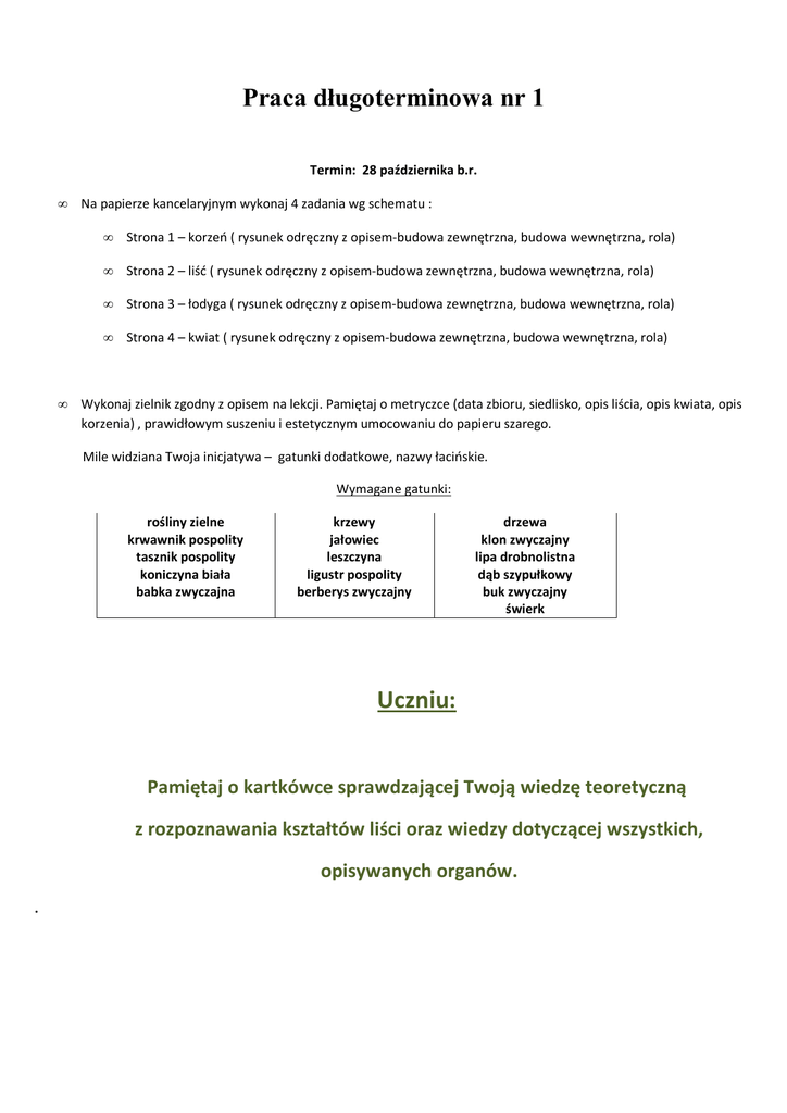 Praca długoterminowa nr 1 Termin: 28 października b.r. • • Na papierze kancelaryjnym wykonaj 4 zadania wg schematu : • Strona 1 – korzeń ( rysunek odręczny z opisem-budowa zewnętrzna, budowa wewnętrzna, rola) • Strona 2 – liść ( rysunek odręczny z opisem-budowa zewnętrzna, budowa wewnętrzna, rola) • Strona 3 – łodyga ( rysunek odręczny z opisem-budowa zewnętrzna, budowa wewnętrzna, rola) • Strona 4 – kwiat ( rysunek odręczny z opisem-budowa zewnętrzna, budowa wewnętrzna, rola) Wykonaj zielnik zgodny z opisem na lekcji. Pamiętaj o metryczce (data zbioru, siedlisko, opis liścia, opis kwiata, opis korzenia) , prawidłowym suszeniu i estetycznym umocowaniu do papieru szarego. Mile widziana Twoja inicjatywa – gatunki dodatkowe, nazwy łacińskie. Wymagane gatunki: rośliny zielne krwawnik pospolity tasznik pospolity koniczyna biała babka zwyczajna krzewy jałowiec leszczyna ligustr pospolity berberys zwyczajny drzewa klon zwyczajny lipa drobnolistna dąb szypułkowy buk zwyczajny świerk Uczniu: Pamiętaj o kartkówce sprawdzającej Twoją wiedzę teoretyczną z rozpoznawania kształtów liści oraz wiedzy dotyczącej wszystkich, opisywanych organów. .