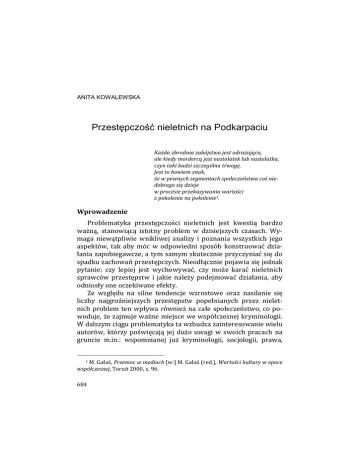 ANITA KOWALEWSKA Przestępczość nieletnich na Podkarpaciu Każda zbrodnia zabójstwa jest odrażająca, ale kiedy mordercą jest nastolatek lub nastolatka, czyn taki budzi szczególna trwogę. Jest to bowiem znak, że w pewnych segmentach społeczeństwa coś niedobrego się dzieje w procesie przekazywania wartości z pokolenia na pokolenie1. Wprowadzenie Problematyka przestępczości nieletnich jest kwestią bardzo ważną, stanowiącą istotny problem w dzisiejszych czasach. Wymaga niewątpliwie wnikliwej analizy i poznania wszystkich jego aspektów, tak aby móc w odpowiedni sposób konstruować działania zapobiegawcze, a tym samym skutecznie przyczyniać się do spadku zachowań przestępczych. Nieodłącznie pojawia się jednak pytanie: czy lepiej jest wychowywać, czy może karać nieletnich sprawców przestępstw i jakie należy podejmować działania, aby odniosły one oczekiwane efekty. Ze względu na silne tendencje wzrostowe oraz nasilanie się liczby najgroźniejszych przestępstw popełnianych przez nieletnich problem ten wpływa również na całe społeczeństwo, co powoduje, że zajmuje ważne miejsce we współczesnej kryminologii. W dalszym ciągu problematyka ta wzbudza zainteresowanie wielu autorów, którzy poświęcają jej dużo uwagi w swoich pracach na gruncie m.in.: wspomnianej już kryminologii, socjologii, prawa, M. Gałaś, Przemoc w mediach [w:] M. Gałaś (red.), Wartości kultury w epoce współczesnej, Toruń 2000, s. 96. 1 684 Przestępczość nieletnich na Podkarpaciu psychologii, czy pedagogiki. Wynika to również z coraz większej powszechności tego zjawiska i wysokiego zagrożenia, jakie ze sobą niesie. Bardzo często młodzież, a nawet dzieci nie tylko uczestniczą w popełnianiu przestępstw, ale również prowokują innych do takich czynów. Motywy działań przestępczych często są nieracjonalne wręcz bezmyślne, a z drugiej strony nasilone agresją, niekiedy nawet okrucieństwem, co bulwersuje nawet szerokie kręgi społeczne. Nieodłącznym i bardzo ważnym elementem w poznaniu przyczyn przestępczości nieletnich jest poznanie motywów takich działań. Ważne jest, aby poznać źródła ich indywidualnych motywacji, określić predyspozycje psychiczne oraz uwarunkowania sytuacyjne, na tle których doszło do popełnienia czynu karalnego. Biorąc pod uwagę oficjalne statystyki policyjne, które przedstawiają rozmiary i charakter przestępczości nieletnich wskazują one jednoznacznie na występowanie trzech głównych tendencji, a mianowicie: systematycznego wzrostu wszystkich rodzajów przestępstw popełnianych przez nieletnich; obniżania się dolnej granicy wieku nieletnich sprawców oraz wskazują na znaczny wzrost przestępstw gwałtownych, które charakteryzują się dużym natężeniem agresji i wyjątkową brutalnością. Warto zwrócić uwagę na niepokojący wzrost dokonywanych przez osoby nieletnie przestępstw, uznawanych jako szczególnie niebezpieczne dla życia i zdrowia, takich jak: zabójstwa, uszkodzenia ciała, pobicia, zgwałcenia, rozboje oraz wymuszenia rozbójnicze. Coraz częściej nieletni przestępcy działają w zorganizowanych grupach, przy użyciu niebezpiecznych narzędzi. Wzrasta również liczba sprawców działających po spożyciu alkoholu i narkotyków. Przestępczość nieletnich jako problem społeczny zawiera w sobie znaczny potencjał niebezpieczeństwa, niekiedy większy niż w pozostałych grupach wiekowych. Wejście nieletnich na drogę przestępczości pozostawia trwałe ślady w osobowości, które bardzo trudne są do naprawienia w późniejszym wieku, niekiedy wręcz niemożliwe. Zjawisko to jest niezwykle szkodliwe zarówno dla samych sprawców ich dalszych losów, jak i dla otoczenia. War685 Anita Kowalewska to zaznaczyć, że wejście na drogę przestępczą często nie ma charakteru przypadkowego, a niejednokrotnie poprzedzone jest wcześniejszymi sygnałami świadczącymi o takich zamiarach. W większości przypadków przestępstwo można powiedzieć, że jest odpowiedzią na trudności napotkane w życiu, które nie przyczyniły się do wypracowania i wykształtowania u młodego człowieka prawidłowych postaw. Przyczyny popełniania czynów przestępczych tkwią także w zaburzonych relacjach interpersonalnych, w kumulowaniu się frustracji, niemocy i traumatycznych przeżyciach. Młodzi ludzie początkowo szukają autorytetów w swojej rodzinie, która powinna być dla nich miejscem prawidłowego rozwoju, gdzie zaspakajane są wszystkie potrzeby i w którym czują się bezpiecznie, wiedząc przy tym, że zawsze mogą na nią liczyć. Jednakże jeżeli rodzina nie potrafi realizować prawidłowo swoich funkcji, a w jednostce, która jest pełna rozterek i niepokojów, pozostaje ciągle pozostawiona sama sobie, pragnie wówczas poznać ludzi, którzy zechcą ją wysłuchać i zaakceptować. Chce zaznać poczucia przynależności oraz poczuć, że ma na tym świecie własne miejsce, w którym czuje się potrzebna i doceniana. Dzieci i młodzież często przejmują od rodziców negatywne wzorce zachowań. Szczególnie widoczne jest to wówczas, gdy rodzice nieletnich przestępców sami są sprawcami przestępstw. Ważne jest, aby jak najwcześniej rozpoznać i zrozumieć takie zachowania oraz wdrażać po pierwszych sygnałach ostrzegawczych odpowiednie działania wychowawcze tak, by nie dopuścić do dalszego rozwoju niewłaściwych form zachowania. Działania skierowane stricte na zwalczanie przestępczości młodzieży muszą koniecznie być poprzedzone wnikliwą analizą oraz poznaniem w jakim stopniu są one zdeterminowane osobistymi, a w jakim sytuacyjnymi uwarunkowaniami. 686 Przestępczość nieletnich na Podkarpaciu Nieletni jako sprawca czynów karalnych w świetle obowiązujących przepisów prawa Odpowiedzialność karna nieletnich w polskim prawie została uregulowana dwutorowo. Postępowanie z nieletnimi reguluje Ustawa o Postępowaniu w Sprawach Nieletnich z 26 paźd