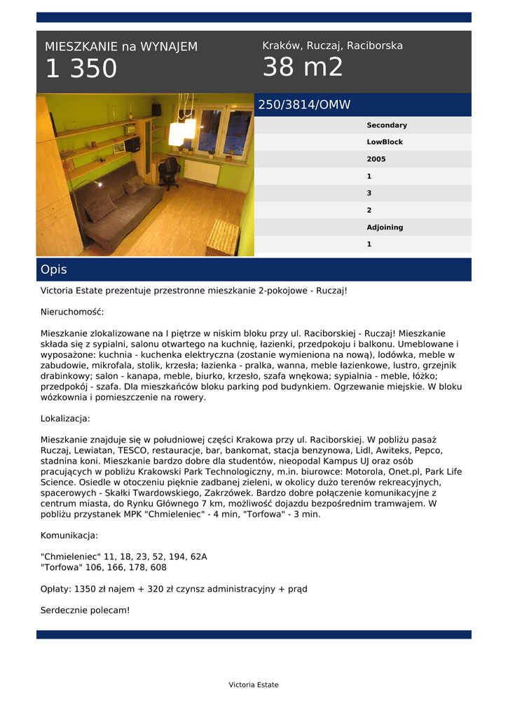 MIESZKANIE na WYNAJEM 1 350 Kraków, Ruczaj, Raciborska 38 m2 250/3814/OMW Secondary LowBlock 2005 1 3 2 Adjoining 1 Opis Victoria Estate prezentuje przestronne mieszkanie 2-pokojowe - Ruczaj! Nieruchomość: Mieszkanie zlokalizowane na I piętrze w niskim bloku przy ul. Raciborskiej - Ruczaj! Mieszkanie składa się z sypialni, salonu otwartego na kuchnię, łazienki, przedpokoju i balkonu. Umeblowane i wyposażone: kuchnia - kuchenka elektryczna (zostanie wymieniona na nową), lodówka, meble w zabudowie, mikrofala, stolik, krzesła; łazienka - pralka, wanna, meble łazienkowe, lustro, grzejnik drabinkowy; salon - kanapa, meble, biurko, krzesło, szafa wnękowa; sypialnia - meble, łóżko; przedpokój - szafa. Dla mieszkańców bloku parking pod budynkiem. Ogrzewanie miejskie. W bloku wózkownia i pomieszczenie na rowery. Lokalizacja: Mieszkanie znajduje się w południowej części Krakowa przy ul. Raciborskiej. W pobliżu pasaż Ruczaj, Lewiatan, TESCO, restauracje, bar, bankomat, stacja benzynowa, Lidl, Awiteks, Pepco, stadnina koni. Mieszkanie bardzo dobre dla studentów, nieopodal Kampus UJ oraz osób pracujących w pobliżu Krakowski Park Technologiczny, m.in. biurowce: Motorola, Onet.pl, Park Life Science. Osiedle w otoczeniu pięknie zadbanej zieleni, w okolicy dużo terenów rekreacyjnych, spacerowych - Skałki Twardowskiego, Zakrzówek. Bardzo dobre połączenie komunikacyjne z centrum miasta, do Rynku Głównego 7 km, możliwość dojazdu bezpośrednim tramwajem. W pobliżu przystanek MPK "Chmieleniec" - 4 min, "Torfowa" - 3 min. Komunikacja: "Chmieleniec" 11, 18, 23, 52, 194, 62A "Torfowa" 106, 166, 178, 608 Opłaty: 1350 zł najem + 320 zł czynsz administracyjny + prąd Serdecznie polecam! Victoria Estate Małgorzata Wicha tel. +48 511 560 721 email: [email protected] Victoria Estate Powered by TCPDF (www.tcpdf.org)