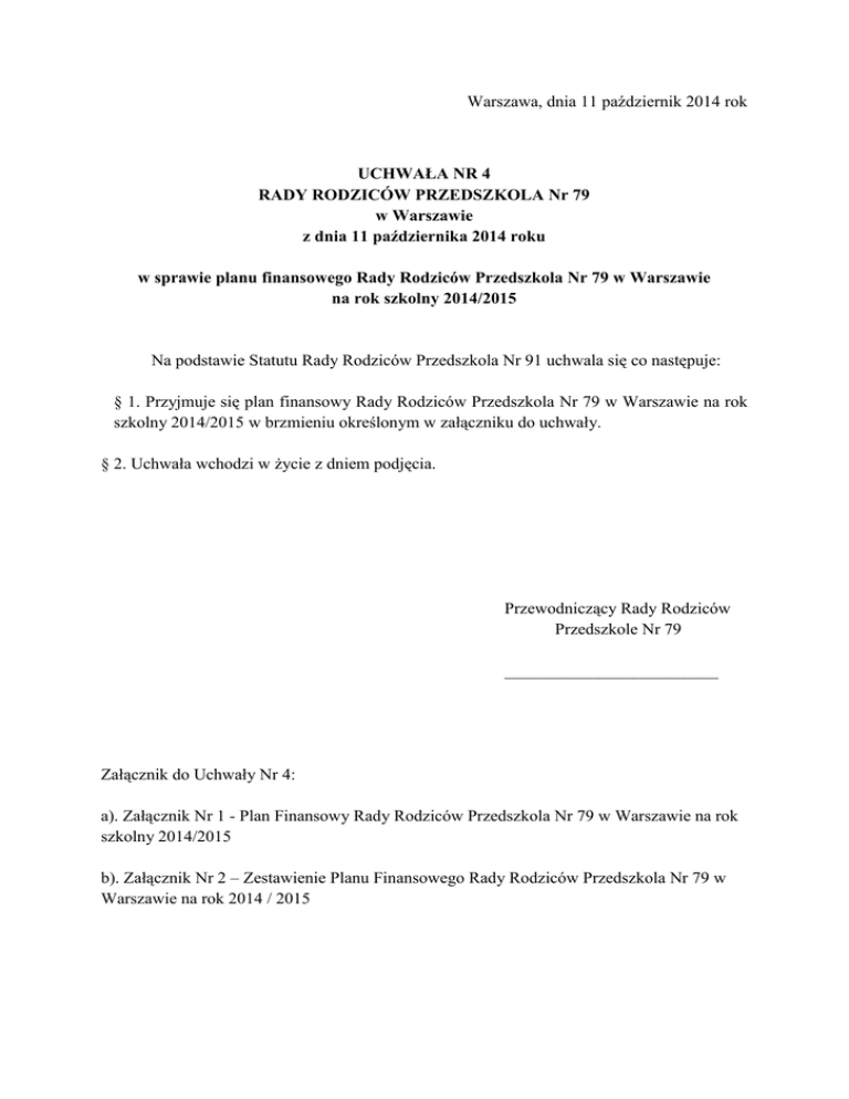 Warszawa, dnia 11 październik 2014 rok UCHWAŁA NR 4 RADY RODZICÓW PRZEDSZKOLA Nr 79 w Warszawie z dnia 11 października 2014 roku w sprawie planu finansowego Rady Rodziców Przedszkola Nr 79 w Warszawie na rok szkolny 2014/2015 Na podstawie Statutu Rady Rodziców Przedszkola Nr 91 uchwala się co następuje: § 1. Przyjmuje się plan finansowy Rady Rodziców Przedszkola Nr 79 w Warszawie na rok szkolny 2014/2015 w brzmieniu określonym w załączniku do uchwały. § 2. Uchwała wchodzi w życie z dniem podjęcia. Przewodniczący Rady Rodziców Przedszkole Nr 79 _________________________ Załącznik do Uchwały Nr 4: a). Załącznik Nr 1 - Plan Finansowy Rady Rodziców Przedszkola Nr 79 w Warszawie na rok szkolny 2014/2015 b). Załącznik Nr 2 – Zestawienie Planu Finansowego Rady Rodziców Przedszkola Nr 79 w Warszawie na rok 2014 / 2015 Załącznik Nr 1 Plan Finansowy Rady Rodziców Przedszkola Nr 79 w Warszawie na rok 2014 / 2015 WPŁYWY L.p. Tytuł wpływu Kwota w złotych 1 Pozostałe środki z 2013/2014 2045,16 zł 00 2 wpłaty od rodziców (kwota pomniejszona o 10%) 64440 zł 00/100 ZAPLANOWANE WPŁYWY RAZEM 66485,16 zł Załącznik Nr 2 Zestawienie Planu Finansowego Rady Rodziców Przedszkola Nr 79 w Warszawie na rok 2014 / 2015 WYDATKI L.p. Tytuł wydatku 1 Wycieczka wiosenna 2 Imprezy okolicznościowe, w tym: 3 Kwota w złotych 9000 zł 00/100 a) Dzień Edukacji 500 zł 00/100 b) Prezenty na Mikołajki 3580 zł 00/100 c) Prezenty Gwiazdkowe 5370 zł 00/100 d) Teatrzyki, koncerty, warsztaty 25610 zł 00/100 e) Bal karnawałowy 700 zł 00/100 f) Dzień Dziecka - FESTYN 800 zł 00/100 g) Prezenty na Dzień Dziecka 3580 zł 00/100 i) Ratownictwo Medyczne - warsztaty 895 zł 00/100 Zakupy i dotacje, w tym: a) zakup artykułów papierniczych i pomocy dydaktycznych 8950 zł 00/100 5 Zakończenie roku 6000 zł 00/100 6 Koszty administracyjno-biurowe, w tym: a) opłaty bankowe i pocztowe + administrowanie RR ZAPLANOWANE WYDATKI RAZEM + REZERWA 200 zł 00/100 65185 zł 00/100
