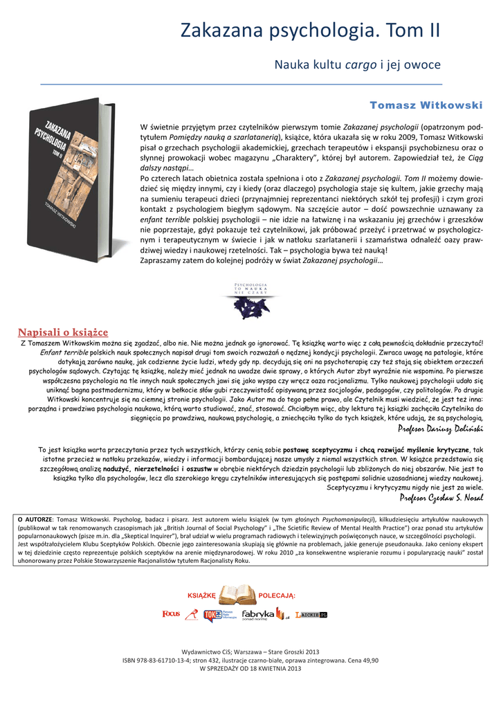 Zakazana psychologia. Tom II Nauka kultu cargo i jej owoce Tomasz Witkowski W świetnie przyjętym przez czytelników pierwszym tomie Zakazanej psychologii (opatrzonym podtytułem Pomiędzy nauką a szarlatanerią), książce, która ukazała się w roku 2009, Tomasz Witkowski pisał o grzechach psychologii akademickiej, grzechach terapeutów i ekspansji psychobiznesu oraz o słynnej prowokacji wobec magazynu „Charaktery”, której był autorem. Zapowiedział też, że Ciąg dalszy nastąpi… Po czterech latach obietnica została spełniona i oto z Zakazanej psychologii. Tom II możemy dowiedzieć się między innymi, czy i kiedy (oraz dlaczego) psychologia staje się kultem, jakie grzechy mają na sumieniu terapeuci dzieci (przynajmniej reprezentanci niektórych szkół tej profesji) i czym grozi kontakt z psychologiem biegłym sądowym. Na szczęście autor – dość powszechnie uznawany za enfant terrible polskiej psychologii – nie idzie na łatwiznę i na wskazaniu jej grzechów i grzeszków nie poprzestaje, gdyż pokazuje też czytelnikowi, jak próbować przeżyć i przetrwać w psychologicznym i terapeutycznym w świecie i jak w natłoku szarlatanerii i szamaństwa odnaleźć oazy prawdziwej wiedzy i naukowej rzetelności. Tak – psychologia bywa też nauką! Zapraszamy zatem do kolejnej podróży w świat Zakazanej psychologii… Napisali o książce Z Tomaszem Witkowskim można się zgadzać, albo nie. Nie można jednak go ignorować. Tę książkę warto więc z całą pewnością dokładnie przeczytać! Enfant terrible polskich nauk społecznych napisał drugi tom swoich rozważań o nędznej kondycji psychologii. Zwraca uwagę na patologie, które dotykają zarówno naukę, jak codzienne życie ludzi, wtedy gdy np. decydują się oni na psychoterapię czy też stają się obiektem orzeczeń psychologów sądowych. Czytając tę książkę, należy mieć jednak na uwadze dwie sprawy, o których Autor zbyt wyraźnie nie wspomina. Po pierwsze współczesna psychologia na tle innych nauk społecznych jawi się jako wyspa czy wręcz oaza racjonalizmu. Tylko naukowej psychologii udało się uniknąć bagna postmodernizmu, który w bełkocie słów gubi rzeczywistość opisywaną przez socjologów, pedagogów, czy politologów. Po drugie Witkowski koncentruje się na ciemnej stronie psychologii. Jako Autor ma do tego pełne prawo, ale Czytelnik musi wiedzieć, że jest też inna: porządna i prawdziwa psychologia naukowa, którą warto studiować, znać, stosować. Chciałbym więc, aby lektura tej książki zachęciła Czytelnika do sięgnięcia po prawdziwą, naukową psychologię, a zniechęciła tylko do tych książek, które udają, że są psychologią. Profesor Dariusz Doliński To jest książka warta przeczytania przez tych wszystkich, którzy cenią sobie postawę sceptycyzmu i chcą rozwijać myślenie krytyczne, tak istotne przecież w natłoku przekazów, wiedzy i informacji bombardującej nasze umysły z niemal wszystkich stron. W książce przedstawia się szczegółową analizę nadużyć, nierzetelności i oszustw w obrębie niektórych dziedzin psychologii lub zbliżonych do niej obszarów. Nie jest to książka tylko dla psychologów, lecz dla szerokiego kręgu czytelników interesujących się postępami solidnie uzasadnianej wiedzy naukowej. Sceptycyzmu i krytycyzmu nigdy nie jest za wiele. Profesor Czesław S. Nosal O AUTORZE: Tomasz Witkowski. Psycholog, badacz i pisarz. Jest autorem wielu książek (w tym głośnych Psychomanipulacji), kilkudziesięciu artykułów naukowych (publikował w tak renomowanych czasopismach jak „British Journal of Social Psychology” i „The Scietific Review of Mental Health Practice”) oraz ponad stu artykułów popularnonaukowych (pisze m.in. dla „Skeptical Inquirer”), brał udział w wielu programach radiowych i telewizyjnych poświęconych nauce, w szczególności psychologii. Jest współzałożycielem Klubu Sceptyków Polskich. Obecnie jego zainteresowania skupiają się głównie na problemach, jakie generuje pseudonauka. Jako ceniony ekspert w tej dziedzinie często reprezentuje polskich sceptyków na arenie międzynarodowej. W roku 2010 „za konsekwentne wspieranie rozumu i popularyzację nauki” został uhonorowany przez Polskie Stowarzyszenie Racjonalistów tytułem Racjonalisty Roku. Wydawnictwo CiS; Warszawa – Stare Groszki 2013 ISBN 978-83-61710-13-4; stron 432, ilustracje czarno-białe, oprawa zintegrowana. Cena 49,90 W SPRZEDAŻY OD 18 KWIETNIA 2013