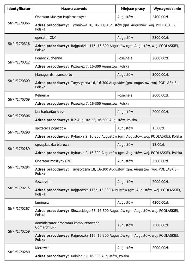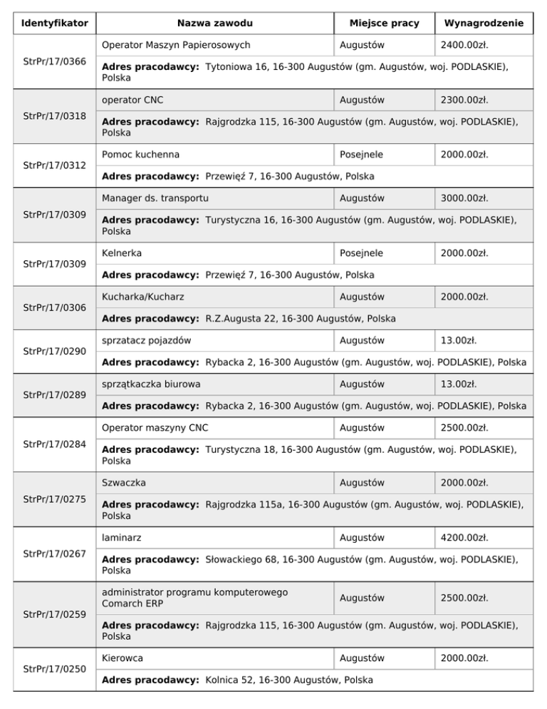 Identyfikator Nazwa zawodu Operator Maszyn Papierosowych StrPr/17/0366 Augustów Wynagrodzenie 2400.00zł. Adres pracodawcy: Tytoniowa 16, 16-300 Augustów (gm. Augustów, woj. PODLASKIE), Polska operator CNC StrPr/17/0318 Miejsce pracy Augustów 2300.00zł. Adres pracodawcy: Rajgrodzka 115, 16-300 Augustów (gm. Augustów, woj. PODLASKIE), Polska Pomoc kuchenna Posejnele 2000.00zł. StrPr/17/0312 Adres pracodawcy: Przewięź 7, 16-300 Augustów, Polska Manager ds. transportu StrPr/17/0309 Augustów 3000.00zł. Adres pracodawcy: Turystyczna 16, 16-300 Augustów (gm. Augustów, woj. PODLASKIE), Polska Kelnerka Posejnele 2000.00zł. StrPr/17/0309 Adres pracodawcy: Przewięź 7, 16-300 Augustów, Polska Kucharka/Kucharz Augustów 2000.00zł. StrPr/17/0306 Adres pracodawcy: R.Z.Augusta 22, 16-300 Augustów, Polska sprzatacz pojazdów Augustów 13.00zł. StrPr/17/0290 Adres pracodawcy: Rybacka 2, 16-300 Augustów (gm. Augustów, woj. PODLASKIE), Polska sprzątkaczka biurowa Augustów 13.00zł. StrPr/17/0289 Adres pracodawcy: Rybacka 2, 16-300 Augustów (gm. Augustów, woj. PODLASKIE), Polska Operator maszyny CNC StrPr/17/0284 Augustów 2000.00zł. Adres pracodawcy: Rajgrodzka 115a, 16-300 Augustów (gm. Augustów, woj. PODLASKIE), Polska laminarz StrPr/17/0267 2500.00zł. Adres pracodawcy: Turystyczna 18, 16-300 Augustów (gm. Augustów, woj. PODLASKIE), Polska Szwaczka StrPr/17/0275 Augustów Augustów 4200.00zł. Adres pracodawcy: Słowackiego 68, 16-300 Augustów (gm. Augustów, woj. PODLASKIE), Polska administrator programu komputerowego Comarch ERP Augustów 2500.00zł. StrPr/17/0259 Adres pracodawcy: Rajgrodzka 115, 16-300 Augustów (gm. Augustów, woj. PODLASKIE), Polska Kierowca Augustów StrPr/17/0250 Adres pracodawcy: Kolnica 52, 16-300 Augustów, Polska 2000.00zł. Identyfikator Nazwa zawodu pracownik infolinii StrPr/17/0201 Miejsce pracy Augustów Wynagrodzenie 2000.00zł. Adres pracodawcy: Turystyczna 16, 16-300 Augustów (gm. Augustów, woj. PODLASKIE), Polska Recepcjonista Augustów 2300.00zł. StrPr/17/0161 Adres pracodawcy: Wojciech 8, 16-300 Augustów, Polska Kelner Augustów 2300.00zł. StrPr/17/0160 Adres pracodawcy: Wojciech 8, 16-300 Augustów, Polska Recepcjonista Ełk 2300.00zł. StrPr/17/0151 Adres pracodawcy: Wojciech 8, 16-300 Augustów, Polska Kelner/ Kelnerka Ełk 2300.00zł. StrPr/17/0150 Adres pracodawcy: Wojciech 8, 16-300 Augustów, Polska Lektor języka angielskiego Augustów 2000.00zł. StPr/17/0367 Adres pracodawcy: Chreptowicza 17A, 16-300 Augustów, Polska Operator maszyn papierosowych Augustów 2400.00zł. StPr/17/0366 Adres pracodawcy: Tytoniowa 16, 16-300 Augustów, Polska Księgowy Augustów 3000.00zł. StPr/17/0364 Adres pracodawcy: Tytoniowa 8, 16-300 Augustów, Polska inspektor w Wydziale Inwestycji Augustów 2000.00zł. StPr/17/0363 Adres pracodawcy: 3 Maja 60, 16-300 Augustów, Polska główny specjalista w Wydziale Inwestycji Augustów 2000.00zł. StPr/17/0362 Adres pracodawcy: 3 Maja 60, 16-300 Augustów, Polska StPr/17/0360 podinspektor w Referacie Funduszy Zewnetrznych Augustów 2000.00zł. Adres pracodawcy: 3 Maja 60, 16-300 Augustów, Polska Piekarz Augustów 2300.00zł. StPr/17/0359 Adres pracodawcy: Wiśniowa 121, 16-300 Augustów, Polska Kucharz Augustów 2300.00zł. StPr/17/0357 Adres pracodawcy: Wiśniowa 121, 16-300 Augustów, Polska Technik administracji Augustów zł. StPr/17/0355 Adres pracodawcy: Oferta jest zamknięta, proszę kontaktować się przez Urząd Pracy. Identyfikator Nazwa zawodu Pomoc kuchenna Miejsce pracy Augustów Wynagrodzenie 2100.00zł. StPr/17/0353 Adres pracodawcy: Wiśniowa 121, 16-300 Augustów, Polska Sprzedawca Augustów 2100.00zł. StPr/17/0352 Adres pracodawcy: Wiśniowa 121, 16-300 Augustów, Polska Sprzedawca Augustów 2400.00zł. StPr/17/0350 Adres pracodawcy: Wojska Polskiego 47, 16-300 Augustów, Polska Fryzjer Augustów 2700.00zł. StPr/17/0349 Adres pracodawcy: Wojska Polskiego 12, 16-300 Augustów, Polska Technik księgarstwa Augustów zł. StPr/17/0348 Adres pracodawcy: Oferta jest zamknięta, proszę kontaktować się przez Urząd Pracy. Pomoc kuchenna Augustów zł. StPr/17/0347 Adres pracodawcy: Oferta jest zamknięta, proszę kontaktować się przez Urząd Pracy. Sprzedawca Augustów zł. StPr/17/0346 Adres pracodawcy: Oferta jest zamknięta, proszę kontaktować się przez Urząd Pracy. Kelner Augustów zł. StPr/17/0345 Adres pracodawcy: Oferta jest zamknięta, proszę kontaktować się przez Urząd Pracy. Ślusarz-tokarz Augustów 2600.00zł. StPr/17/0344 Adres pracodawcy: Tytoniowa 4, 16-300 Augustów, Polska Mistrz produkcji Augustów 3000.00zł. StPr/17/0342 Adres pracodawcy: Tytoniowa 4, 16-300 Augustów, Polska Ratownik wodny Augustów 2000.00zł. StPr/17/0340 Adres pracodawcy: Oferta jest zamknięta, proszę kontaktować się przez Urząd Pracy. Sprzedawca części i akcesoriów Augustów 2000.00zł. StPr/17/0336 Adres pracodawcy: Rajgrodzka 98, 16-300 Augustów, Polska Pomoc kuchenna Augustów 2000.00zł. StPr/17/0335 Adres pracodawcy: Wojska Polskiego 69A, 16-300 Augustów, Polska Specjalista do spraw wynagrodzeń Augustów 2000.00zł. StPr/17/0331 Adres pracodawcy: Oferta jest zamknięta, proszę kontaktować się przez Urząd Pracy. Pomoc kuchenna Augustów StPr/17/0327 Adres pracodawcy: Tytoniowa 16, 16-300 Augustów, Polska 2000.00zł. Identyfikator Nazwa zawodu Szwaczka maszynowa Miejsce pracy Augustów Wynagrodzenie zł. StPr/17/0326 Adres pracodawcy: Oferta jest zamknięta, proszę kontaktować się przez Urząd Pracy. Sprzedawca w branży mięsnej Augustów zł. StPr/17/0323 Adres pracodawcy: Oferta jest zamknięta, proszę kontaktować się przez Urząd Pracy. Pokojowa Augustów zł. StPr/17/0322 Adres pracodawcy: Oferta jest zamknięta, proszę kontaktować się przez Urząd Pracy. Sprzedawca Augustów zł. StPr/17/0321 Adres pracodawcy: Oferta jest zamknięta, proszę kontaktować się przez Urząd Pracy. Pozostali stolarze meblowi i pokrewni Augustów zł. StPr/17/0320