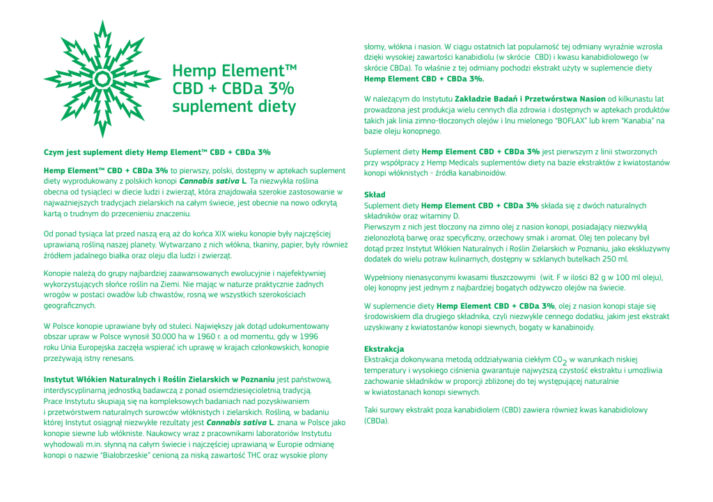 Hemp Element™ CBD + CBDa 3% suplement diety Czym jest suplement diety Hemp Element™ CBD + CBDa 3% Hemp Element™ CBD + CBDa 3% to pierwszy, polski, dostępny w aptekach suplement diety wyprodukowany z polskich konopi Cannabis sativa L. Ta niezwykła roślina obecna od tysiącleci w diecie ludzi i zwierząt, która znajdowała szerokie zastosowanie w najważniejszych tradycjach zielarskich na całym świecie, jest obecnie na nowo odkrytą kartą o trudnym do przecenieniu znaczeniu. Od ponad tysiąca lat przed naszą erą aż do końca XIX wieku konopie były najczęściej uprawianą rośliną naszej planety. Wytwarzano z nich włókna, tkaniny, papier, były również źródłem jadalnego białka oraz oleju dla ludzi i zwierząt. Konopie należą do grupy najbardziej zaawansowanych ewolucyjnie i najefektywniej wykorzystujących słońce roślin na Ziemi. Nie mając w naturze praktycznie żadnych wrogów w postaci owadów lub chwastów, rosną we wszystkich szerokościach geograficznych. W Polsce konopie uprawiane były od stuleci. Największy jak dotąd udokumentowany obszar upraw w Polsce wynosił 30.000 ha w 1960 r. a od momentu, gdy w 1996 roku Unia Europejska zaczęła wspierać ich uprawę w krajach członkowskich, konopie przeżywają istny renesans. Instytut Włókien Naturalnych i Roślin Zielarskich w Poznaniu jest państwową, interdyscyplinarną jednostką badawczą z ponad osiemdziesięcioletnią tradycją. Prace Instytutu skupiają się na kompleksowych badaniach nad pozyskiwaniem i przetwórstwem naturalnych surowców włóknistych i zielarskich. Rośliną, w badaniu której Instytut osiągnął niezwykłe rezultaty jest Cannabis sativa L. znana w Polsce jako konopie siewne lub włókniste. Naukowcy wraz z pracownikami laboratoriów Instytutu wyhodowali m.in. słynną na całym świecie i najczęściej uprawianą w Europie odmianę konopi o nazwie “Białobrzeskie” cenioną za niską zawartość THC oraz wysokie plony słomy, włókna i nasion. W ciągu ostatnich lat popularność tej odmiany wyraźnie wzrosła dzięki wysokiej zawartości kanabidiolu (w skrócie CBD) i kwasu kanabidiolowego (w skrócie CBDa). To właśnie z tej odmiany pochodzi ekstrakt użyty w suplemencie diety Hemp Element CBD + CBDa 3%. W należącym do Instytutu Zakładzie Badań i Przetwórstwa Nasion od kilkunastu lat prowadzona jest produkcja wielu cennych dla zdrowia i dostępnych w aptekach produktów takich jak linia zimno-tłoczonych olejów i lnu mielonego “BOFLAX” lub krem “Kanabia” na bazie oleju konopnego. Suplement diety Hemp Element CBD + CBDa 3% jest pierwszym z linii stworzonych przy współpracy z Hemp Medicals suplementów diety na bazie ekstraktów z kwiatostanów konopi włóknistych - źródła kanabinoidów. Skład Suplement diety Hemp Element CBD + CBDa 3% składa się z dwóch naturalnych składników oraz witaminy D. Pierwszym z nich jest tłoczony na zimno olej z nasion konopi, posiadający niezwykłą zielonozłotą barwę oraz specyficzny, orzechowy smak i aromat. Olej ten polecany był dotąd przez Instytut Włókien Naturalnych i Roślin Zielarskich w Poznaniu, jako ekskluzywny dodatek do wielu potraw kulinarnych, dostępny w szklanych butelkach 250 ml. Wypełniony nienasyconymi kwasami tłuszczowymi (wit. F w ilości 82 g w 100 ml oleju), olej konopny jest jednym z najbardziej bogatych odżywczo olejów na świecie. W suplemencie diety Hemp Element CBD + CBDa 3%, olej z nasion konopi staje się środowiskiem dla drugiego składnika, czyli niezwykle cennego dodatku, jakim jest ekstrakt uzyskiwany z kwiatostanów konopi siewnych, bogaty w kanabinoidy. Ekstrakcja Ekstrakcja dokonywana metodą oddziaływania ciekłym CO2 w warunkach niskiej temperatury i wysokiego ciśnienia gwarantuje najwyższą czystość ekstraktu i umożliwia zachowanie składników w proporcji zbliżonej do tej występującej naturalnie w kwiatostanach konopi siewnych. Taki surowy ekstrakt poza kanabidiolem (CBD) zawiera również kwas kanabidiolowy (CBDa). Kanabinoidy Kanabinoidy to grupa substancji naturalnych występujących w bardzo niewielkiej liczbie roślin na świecie. Kanabinoidy zawarte w konopiach siewnych, oddziaływują na organizm człowieka poprzez receptory układu endokanabinoidowego. Układ endokanabinoidowy Układ Endokanabinoidowy można nazwać “meta układem” regulującym współpracę innych układów w ciele człowieka. Jego receptory rozmieszczone są m.in. w mózgu, mięśniach szkieletowych, wątrobie, jamie brzusznej, okolicach narządów płciowych i komórkach układu immunologicznego. Bierze on udział w niezliczonej ilości procesów zachodzących w ludzkim ciele m.in. regulując apetyt, ciśnienie tętnicze, gospodarkę hormonalną, metabolizm jak również odczucia emocji, nastroju, motywacji lub stresu Za pośrednictwem układu endokanabinoidowego organizm ludzki sam wytwarza również własne kanabinoidy zwane endokanabinoidami. Jednym z nich jest annadamid obecny m.in w mleku matki, odpowiedzialny za prawidłowy rozwój dziecka. CBD i CBDa Kanabidiol (CBD) oraz kwas kanabidiolowy (CBDa) to kanabinoidy występujące w konopiach siewnych w największej ilości. Przeprowadzone do tej pory liczne badania kliniczne potwierdzają bezpieczeństwo i świetną tolerancję CBD i CBDa przez organizm ludzki. Niedobór Endokanabinoidów Niedobór endokanabinoidów najczęściej dotyka populacje najbardziej rozwiniętych krajów i spowodowany jest faktem, iż ewolucja biologiczna nie nadąża za szybkimi zmianami w stylu życia. Niewystarczające stężenia endokanabinoidów stwierdza się w przypadku słabej tolerancji na stres wywołany szybkim tempem życia i pracy. Uzupełnienie niedoborów może mieć miejsce poprzez suplementację kanabinoidów, których źródłem jest olej konopny oraz ekstrakt z kwiatostanów konopi. Suplement diety Hemp Element zawiera w sumie 3% CBD i CBDa uzupełniając ich możliwy niedobór w organizmie. Działanie i przeznaczenie 