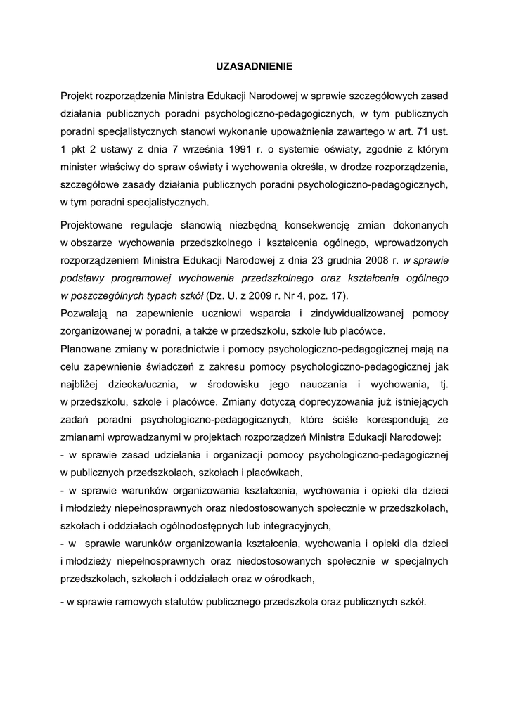 UZASADNIENIE Projekt rozporządzenia Ministra Edukacji Narodowej w sprawie szczegółowych zasad działania publicznych poradni psychologiczno-pedagogicznych, w tym publicznych poradni specjalistycznych stanowi wykonanie upowaŜnienia zawartego w art. 71 ust. 1 pkt 2 ustawy z dnia 7 września 1991 r. o systemie oświaty, zgodnie z którym minister właściwy do spraw oświaty i wychowania określa, w drodze rozporządzenia, szczegółowe zasady działania publicznych poradni psychologiczno-pedagogicznych, w tym poradni specjalistycznych. Projektowane regulacje stanowią niezbędną konsekwencję zmian dokonanych w obszarze wychowania przedszkolnego i kształcenia ogólnego, wprowadzonych rozporządzeniem Ministra Edukacji Narodowej z dnia 23 grudnia 2008 r. w sprawie podstawy programowej wychowania przedszkolnego oraz kształcenia ogólnego w poszczególnych typach szkół (Dz. U. z 2009 r. Nr 4, poz. 17). Pozwalają na zapewnienie uczniowi wsparcia i zindywidualizowanej pomocy zorganizowanej w poradni, a takŜe w przedszkolu, szkole lub placówce. Planowane zmiany w poradnictwie i pomocy psychologiczno-pedagogicznej mają na celu zapewnienie świadczeń z zakresu pomocy psychologiczno-pedagogicznej jak najbliŜej dziecka/ucznia, w środowisku jego nauczania i wychowania, tj. w przedszkolu, szkole i placówce. Zmiany dotyczą doprecyzowania juŜ istniejących zadań poradni psychologiczno-pedagogicznych, które ściśle korespondują ze zmianami wprowadzanymi w projektach rozporządzeń Ministra Edukacji Narodowej: - w sprawie zasad udzielania i organizacji pomocy psychologiczno-pedagogicznej w publicznych przedszkolach, szkołach i placówkach, - w sprawie warunków organizowania kształcenia, wychowania i opieki dla dzieci i młodzieŜy niepełnosprawnych oraz niedostosowanych społecznie w przedszkolach, szkołach i oddziałach ogólnodostępnych lub integracyjnych, - w sprawie warunków organizowania kształcenia, wychowania i opieki dla dzieci i młodzieŜy niepełnosprawnych oraz niedostosowanych społecznie w specjalnych przedszkolach, szkołach i oddziałach oraz w ośrodkach, - w sprawie ramowych statutów publicznego przedszkola oraz publicznych szkół. Projekt rozporządzenia Ministra Edukacji Narodowej w sprawie szczegółowych zasad działania publicznych poradni psychologiczno-pedagogicznych, w tym publicznych poradni specjalistycznych wychodzi naprzeciw m.in. rekomendacjom ekspertów ds. specjalnych potrzeb edukacyjnych, powołanych przez Ministra Edukacji Narodowej w 2008 r. oraz potrzebom zgłaszanym przez nauczycieli róŜnych typów szkół i placówek. W projekcie niniejszego rozporządzenia wykorzystano równieŜ propozycje wypracowane przez Zespół konsultacyjny ds. poradnictwa i pomocy psychologicznopedagogicznej działający, na wniosek Związku Zawodowego „Rada Poradnictwa”, w Ministerstwie Edukacji Narodowej w latach 2007-2008. W dotychczasowym stanie prawnym w niedostatecznym stopniu zaznaczona była potrzeba ściślejszej współpracy poradni z przedszkolami, szkołami i placówkami, a takŜe potrzeba wsparcia merytorycznego nauczycieli. Projekt rozporządzenia doprecyzowuje równieŜ istniejące uregulowania prawne, które budziły wątpliwości interpretacyjne lub zostały zweryfikowane negatywnie w praktyce. Projektowane akty prawne będą wprowadzone blokowo, z uwagi na konieczność uwzględnienia zmian w tym samym czasie - równolegle we wszystkich rozporządzeniach dotyczących kształcenia specjalnego, poradnictwa i pomocy psychologiczno-pedagogicznej. W projekcie rozporządzenia, w porównaniu z obecnie obowiązującym rozporządzeniem Ministra Edukacji Narodowej i Sportu z dnia 11 grudnia 2002 r. w sprawie szczegółowych zasad działania publicznych poradni psychologicznopedagogicznych, w tym publicznych poradni specjalistycznych (Dz. U. z 2003 r. Nr 5, poz. 46) wprowadza się następujące zmiany : 1. W dotychczasowym brzmieniu § 1 ust. 2 wprowadzono istotne zmiany wynikające z potrzeby doprecyzowania zadań poradni odpowiadających projektowanym zmianom w obszarze poradnictwa i pomocy psychologiczno-pedagogicznej. 2. W § 1 w ust. 3 zrezygnowano ze wskazywania przykładowych poradni specjalistycznych uznając, Ŝe potrzeby środowiska określają zapotrzebowanie w tym zakresie. 2 3. W § 1 w ust. 4 katalog moŜliwości realizacji zadań przez poradnię dostosowany został odpowiednio do form pomocy psychologiczno – pedagogicznej świadczonej dla dzieci i młodzieŜy, o których mowa w projekcie rozporządzenia w sprawie zasad udzielania i organizacji pomocy psychologiczno-pedagogicznej w publicznych przedszkolach, szkołach i placówkach. Dodane zostało opiniowanie i orzekanie realizowane obecnie przez poradnię, a nie wskazane w dotychczasowych przepisach, terapia określona została jako działalność terapeutyczna i prowadzenie grup wsparcia, w ramach których moŜe być realizowana równieŜ psychoedukacja. 4. Usunięto przepis § 2 obecnie obowiązującego rozporządzenia, informujący, Ŝe korzystanie z pomocy udzielanej przez poradnie jest dobrowolne i nieodpłatne. Przepis ten określał zasady powszechne znane, mające swoje umocowanie prawne w Konwencji o Prawach Dziecka, a takŜe w Kodeksie Rodzinnym i Opiekuńczym; 5. Zrezygnowano z zasięgania opinii kuratora oświaty przy określaniu przez organ prowadzący rejonu działania poradni uznając, Ŝe w tym zakresie organ prowadzący poradnię posiada pełne kompetencje i rozpoznanie potrzeb środowiska (§ 3 ust. 1 aktualnie obowiązującego rozporządzenia). Analogicznie zrezygnowano z zasięgania opinii kuratora oświaty przy tworzeniu lub likwidacji filii przez organ prowadzący w sytuacji, gdy opinia kuratora oświaty nie jest wiąŜąca dla tego organu przy podejmowaniu decyzji (§ 9 ust. 2 aktualnie obowiązującego rozporządzenia). 6. Usunięto szczegółowe wskazanie katalogu spraw, w których poradnia wydaje opinie. W § 4 ust. 1 aktualnie obowiązującego rozporzą